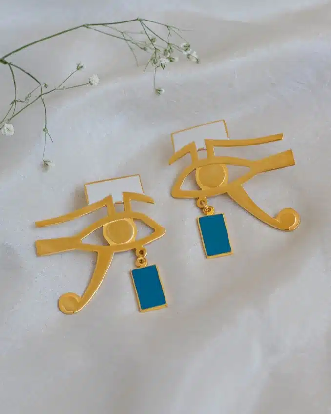 The Charming earrings, Inspired by The Eye of Horus ancient Egyptian Symbol by the designer “Toka Nabil”. Material: Brass 21K Gold plated with a very high quality& white and blue color. hand made. Pre order will Take from 3-12 Days. No REFUND or EXCHANGE.