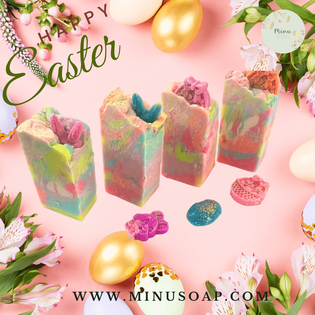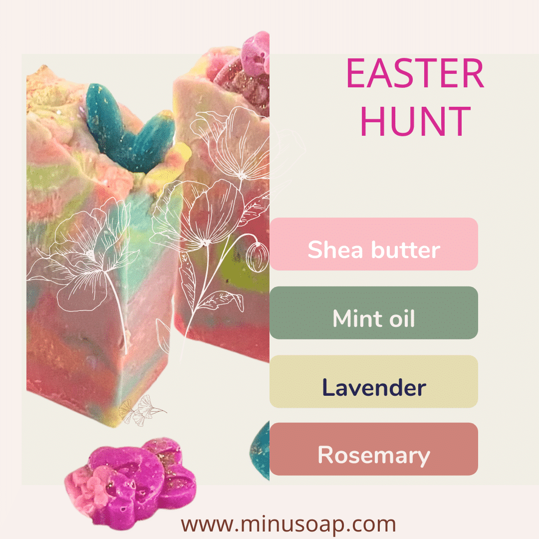 فعملنا صابونة وخلينا فيها اشكال شم النسيم من سبت الرحلات، للبيض الملون، للارنوب.. بحيث نرمز الي اللعبة دي اللي بتقرب العيلة من بعض.. الصابونة بقي معناتها غنية قوية وتنفع ذوي البشرة الذهنية بسبب خليط الاعشاب اللي فيها من نعناع لافندر روزماري، وترطب علشان … فيها نسبة معتدلة من زبدة الشيا