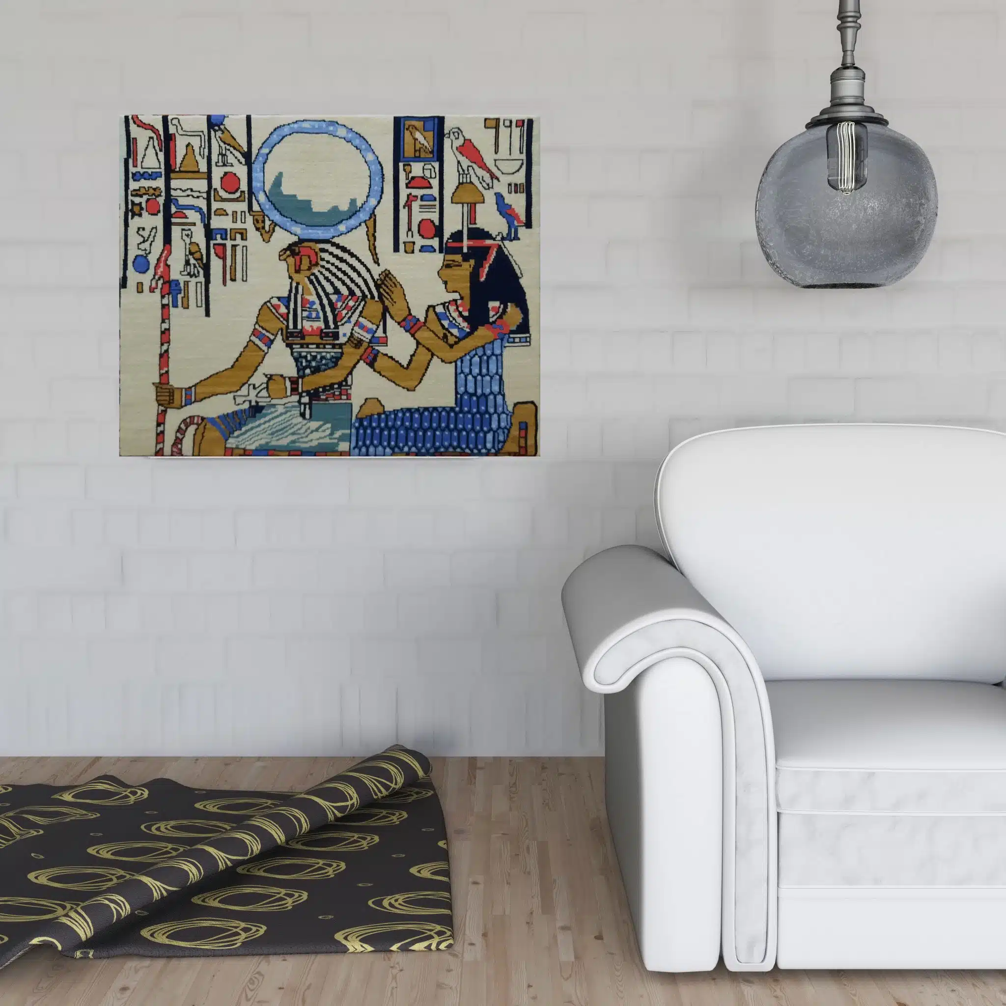 This exquisite handmade tapestry vividly depicts an iconic scene of Egyptian deities, intricately designed with hieroglyphics in the background. The use of bold colors and precise weaving techniques brings out the divine symbolism and historic charm, making it a perfect choice for those passionate about ancient Egyptian culture.