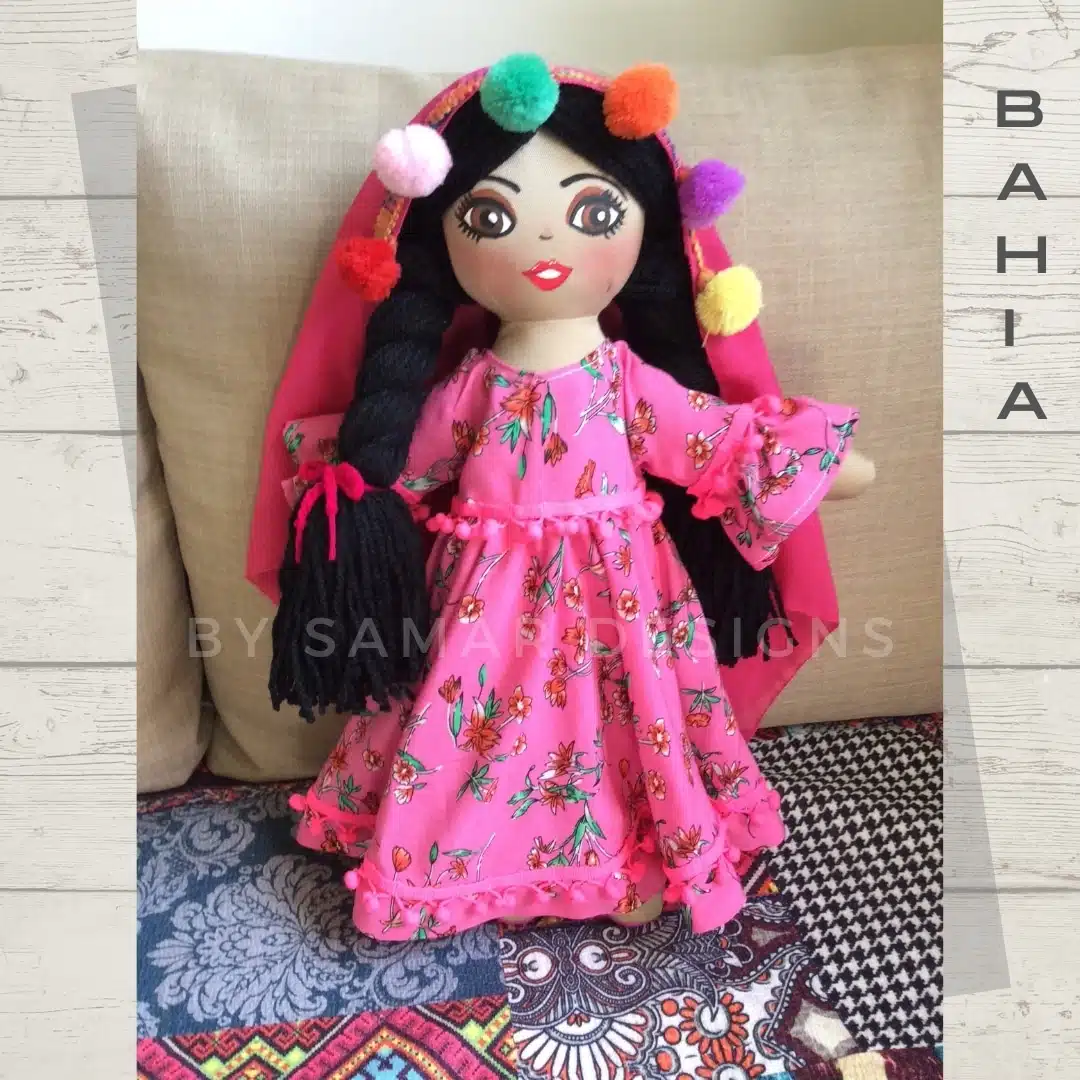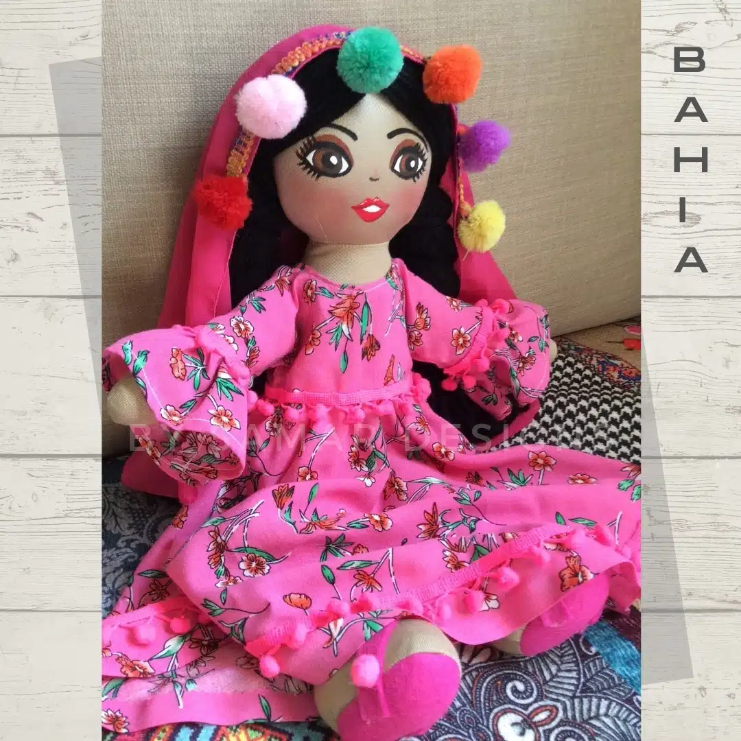 Handmade soft doll, representing Egyptian countryside woman, with their colorful and cheerful dress (Galabeya)