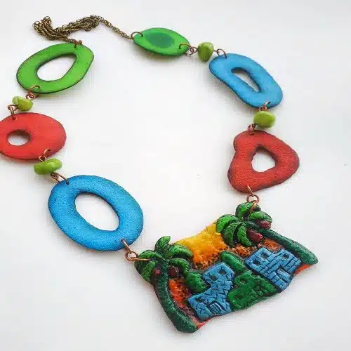 قلادة مصنوعة يدويًا، ألوان نابضة بالحياة وتصميم فني مبتكر.