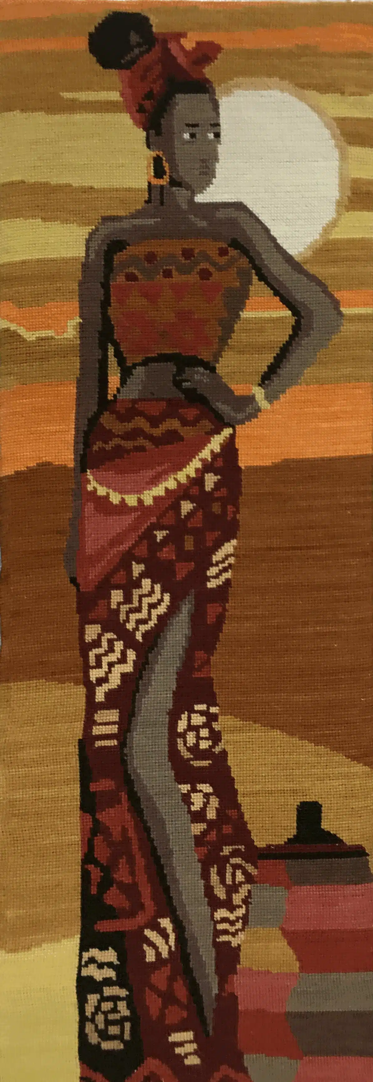This captivating tapestry portrays a regal woman standing confidently against a dramatic sunset backdrop. Dressed in a patterned red and gold attire, she exudes elegance and cultural richness, complemented by the vibrant tones of the setting sun. The bold geometric designs in her garments highlight traditional artistry, while the warm hues of the background create a harmonious balance, making this piece a celebration of strength and beauty.