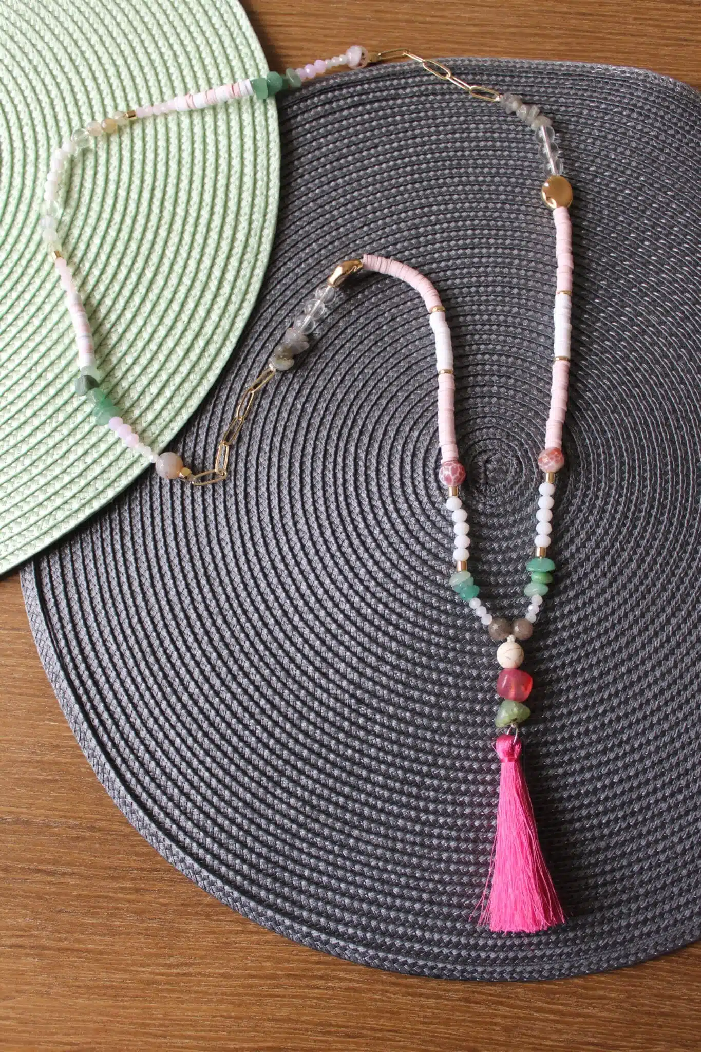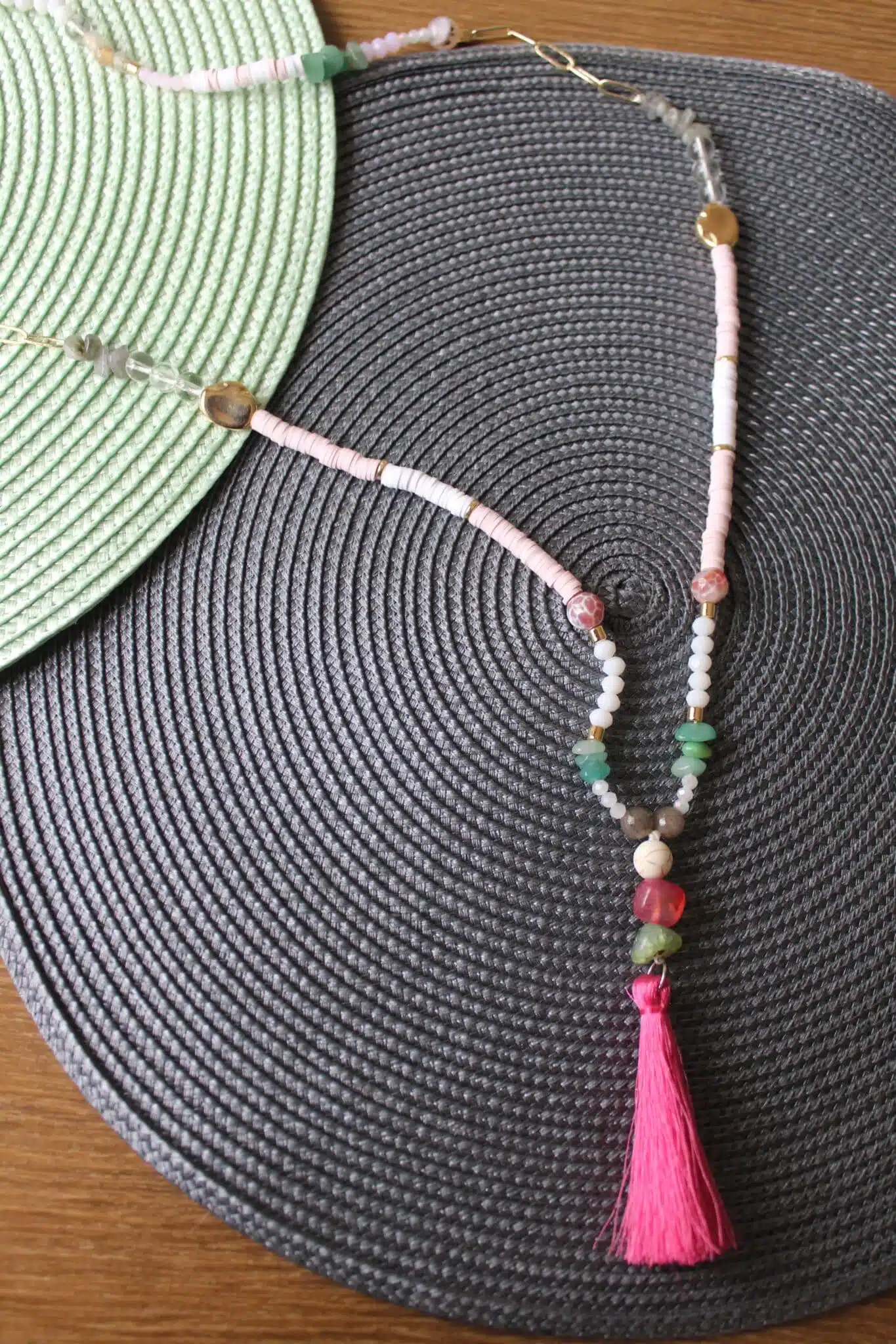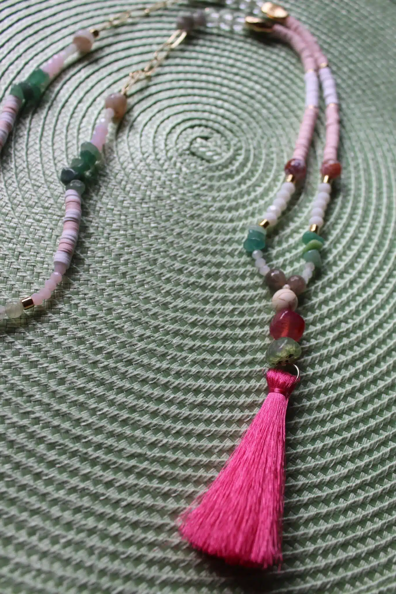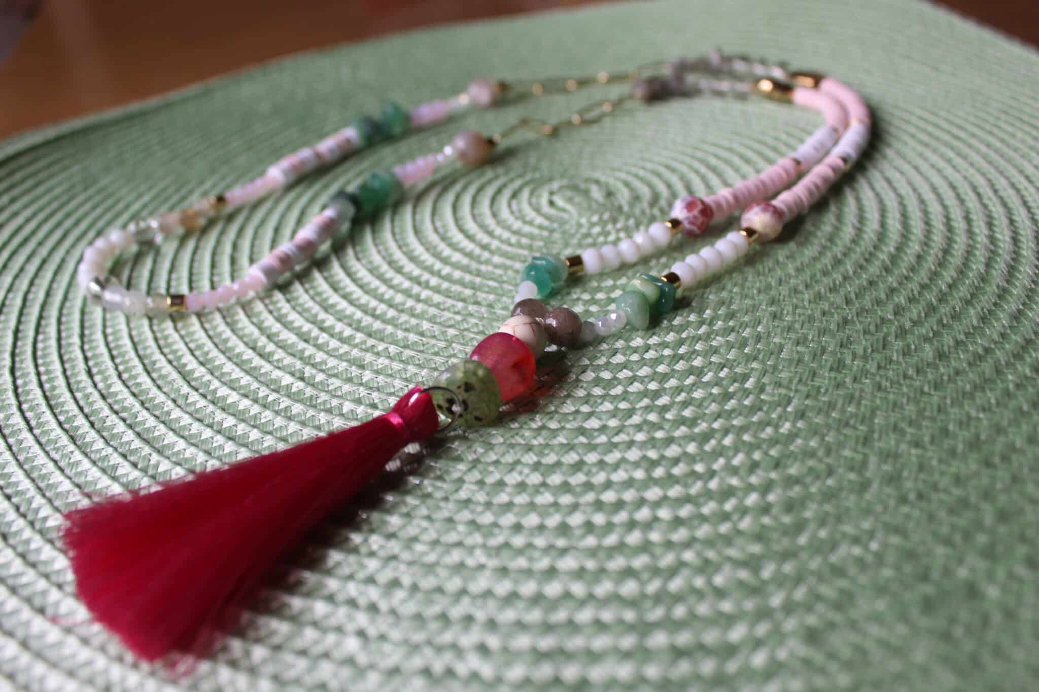 Handmade Necklace with touch of golden rings mixed with eledgant stones and dangling summer color strips