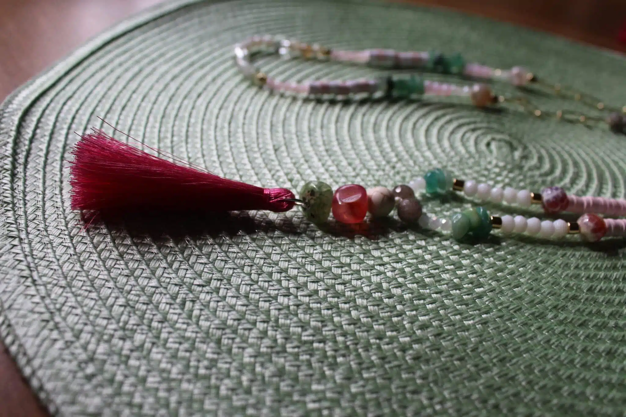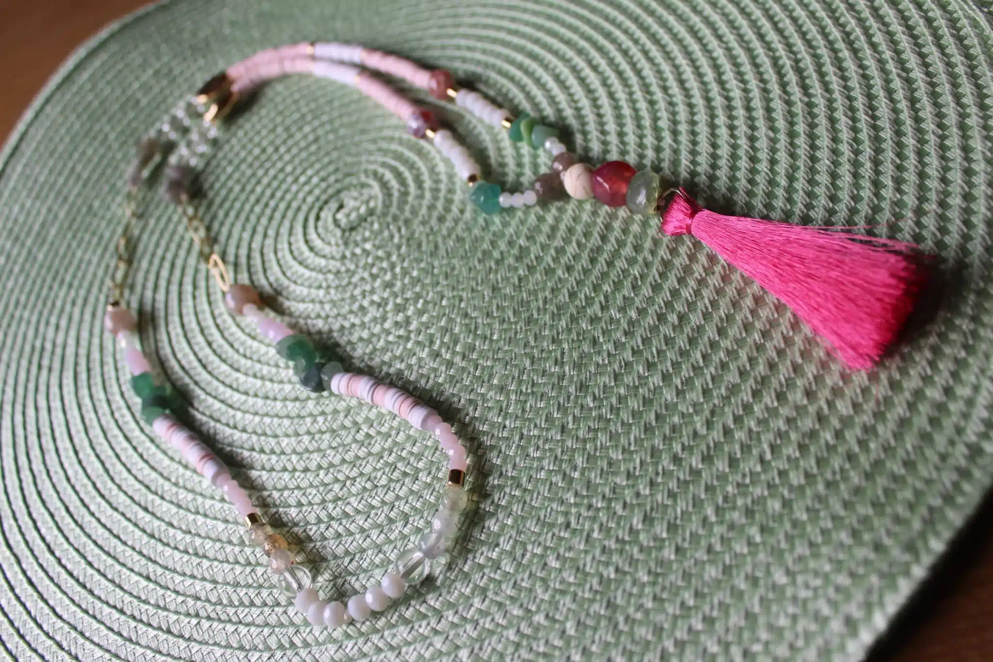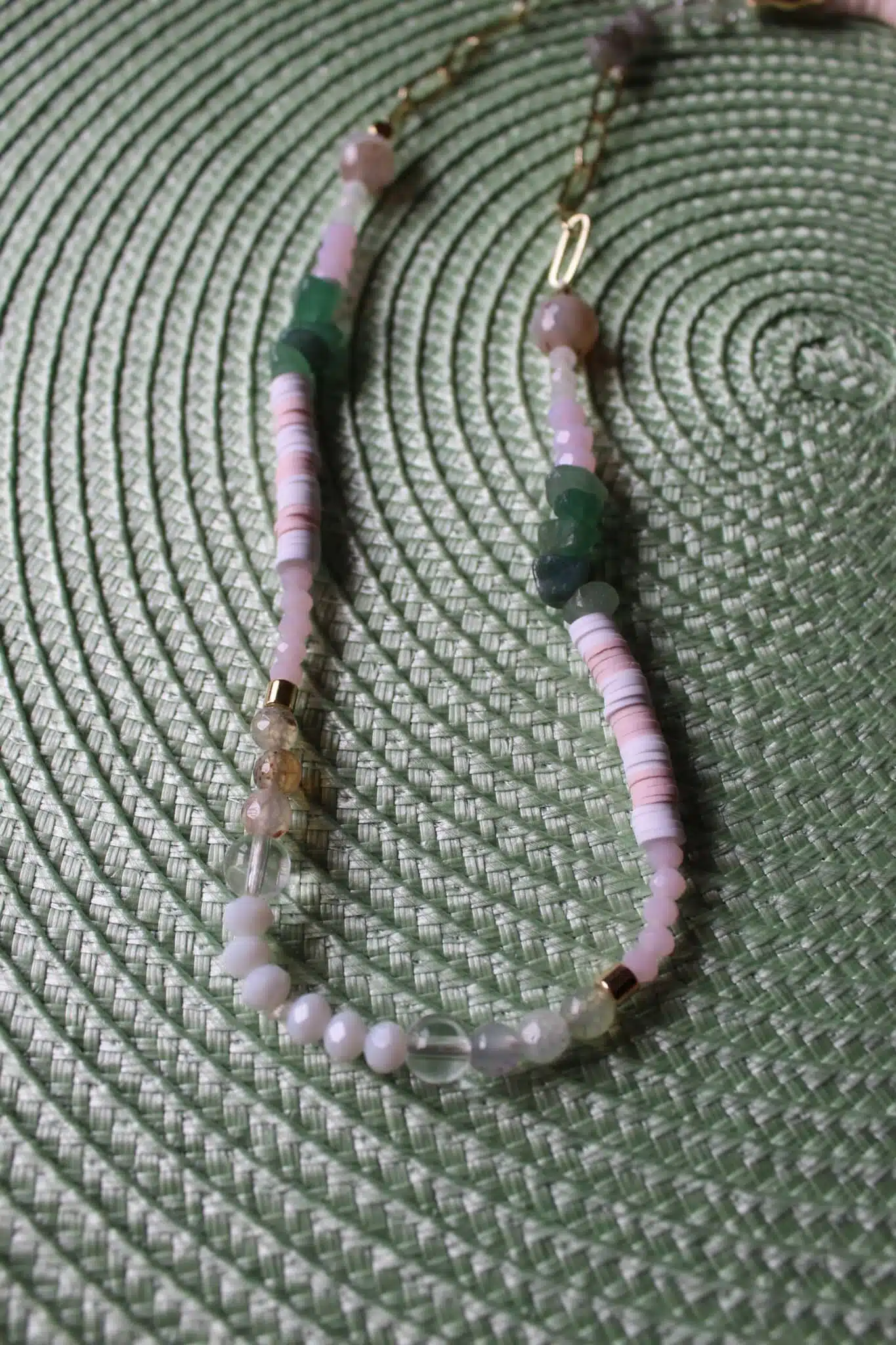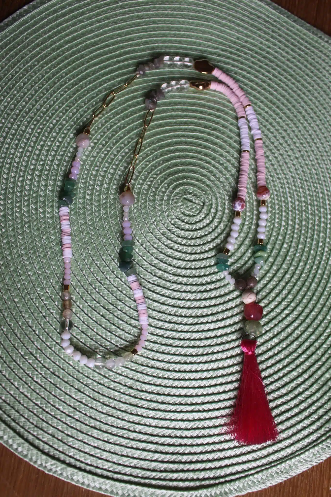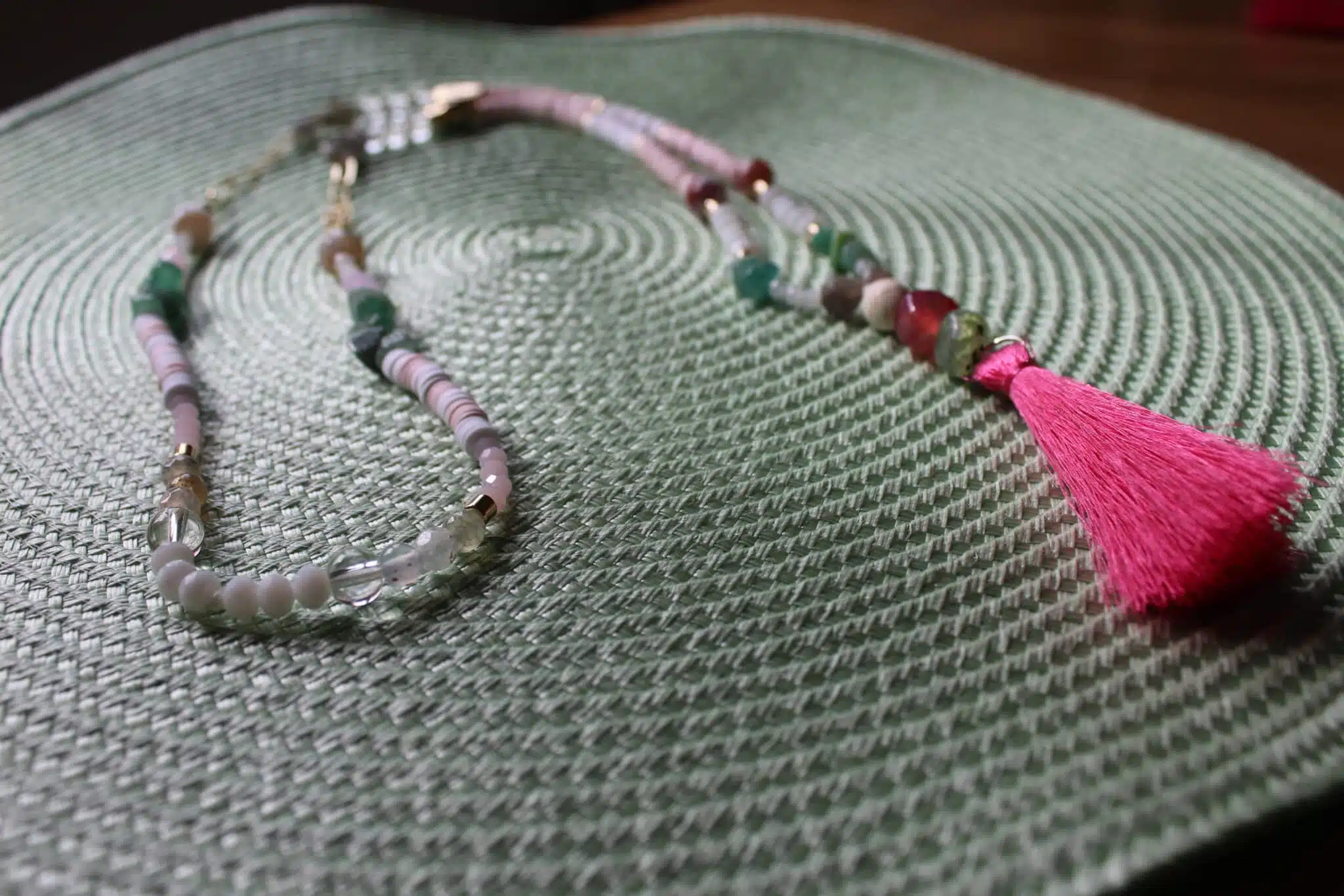 Handmade Necklace with touch of golden rings mixed with eledgant stones and dangling summer color strips