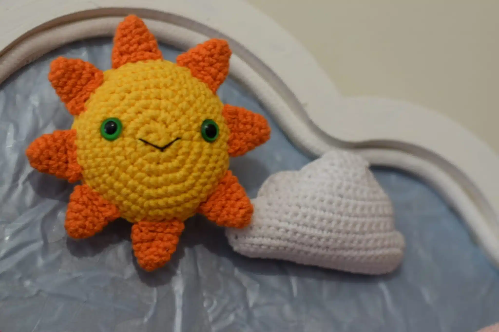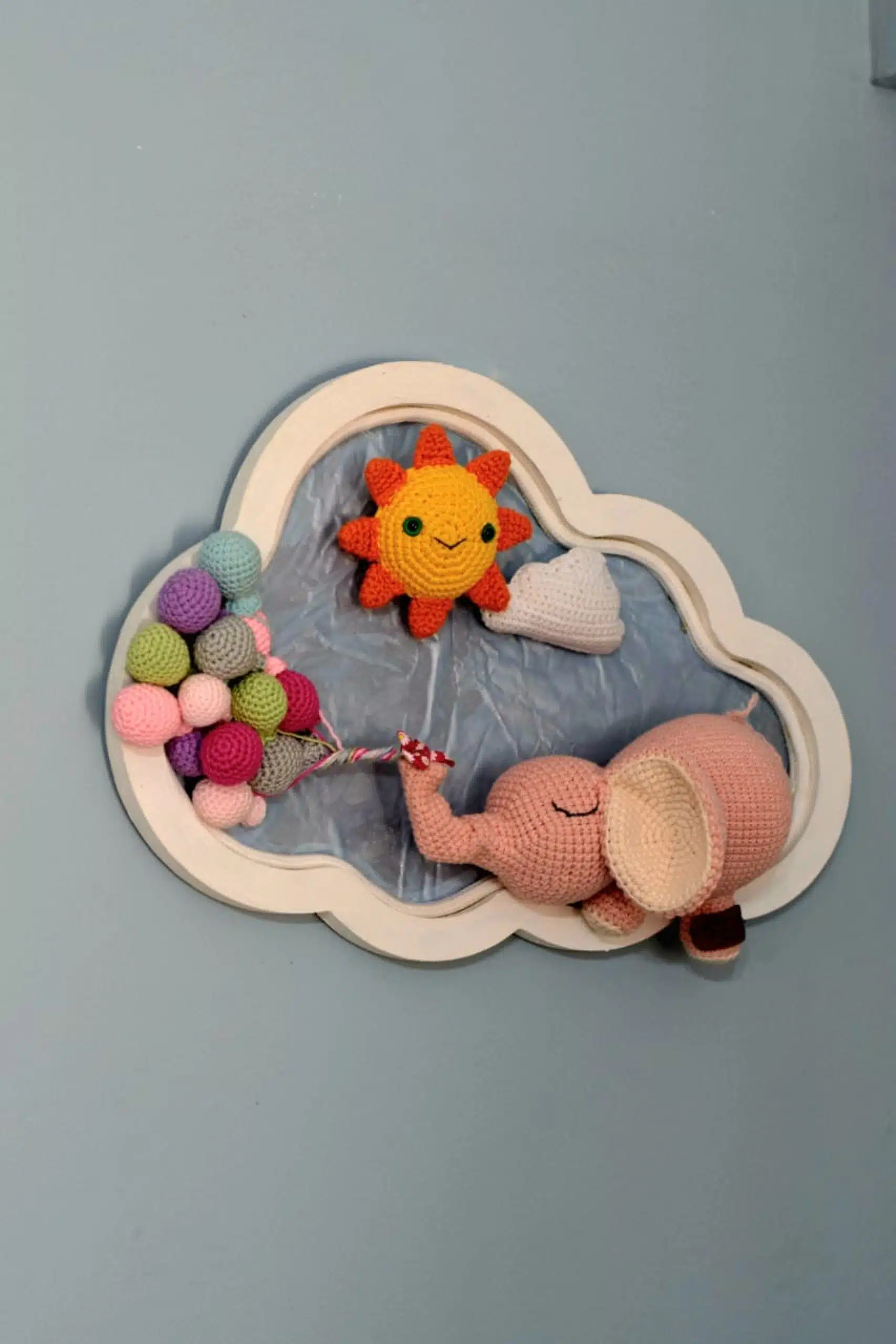 Ellie the Elephant floats on a wooden cloud in this adorable handmade wall piece that brings softness, calm, and whimsy to any nursery space.
