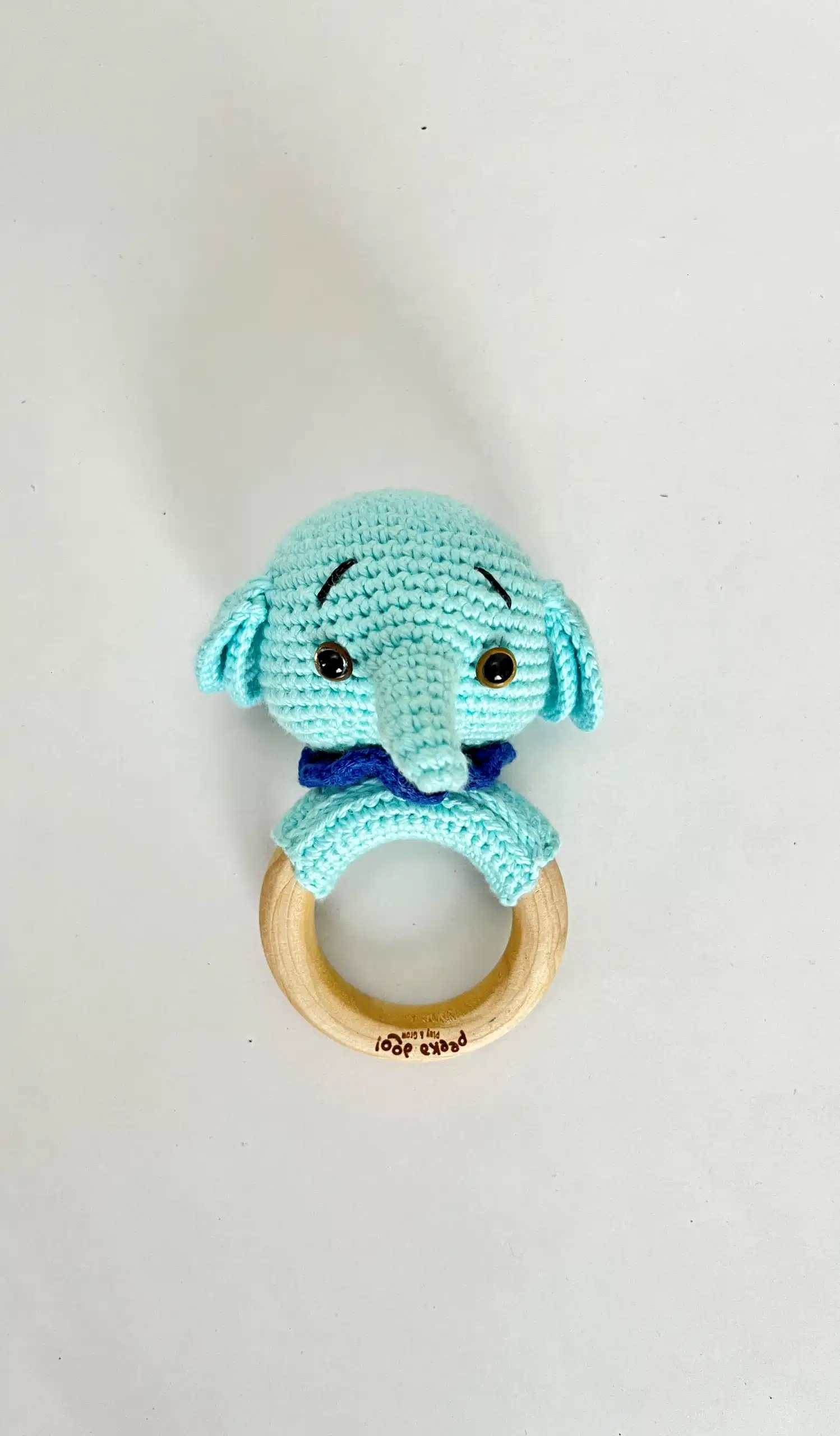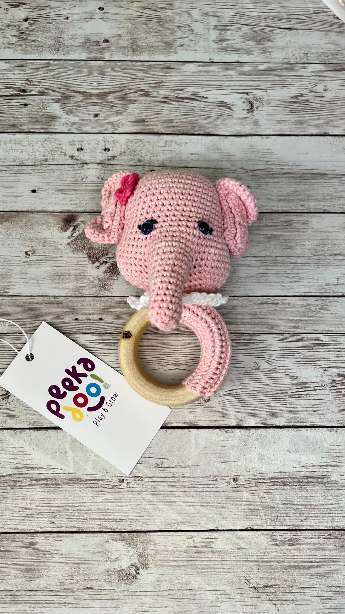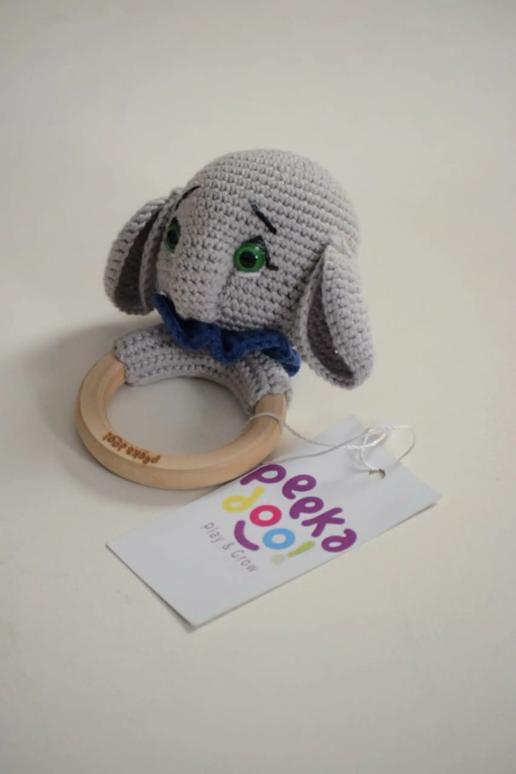 Ellie the Elephant with Wooden Ring combines soft crochet and natural wood to soothe teething babies while enhancing sensory and motor development.