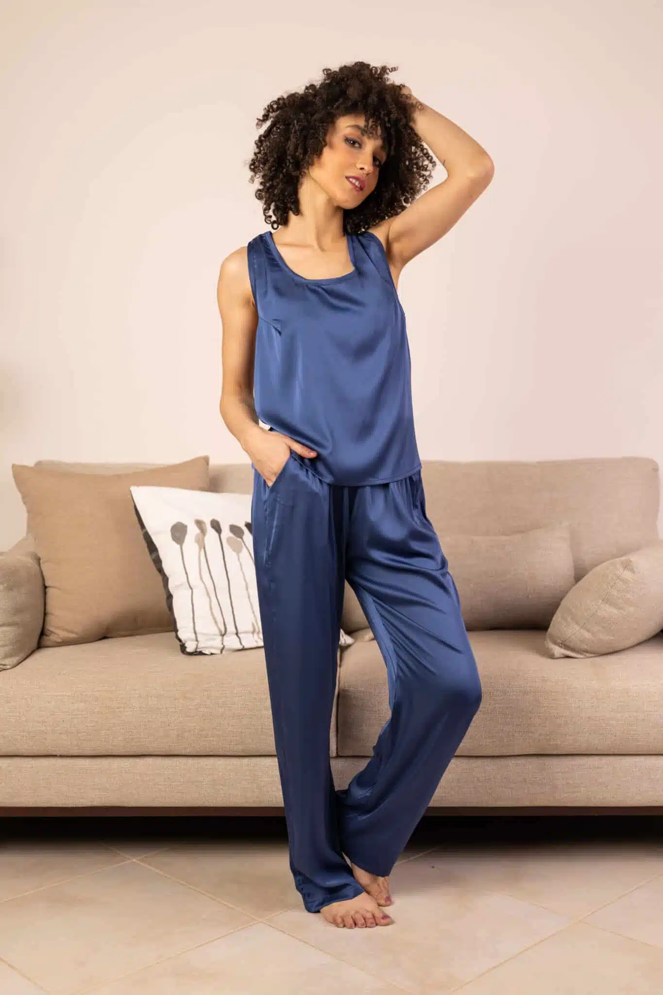 Silky satin 3 pieces pajama set. Set includes top, shorts and pants. Comes in two colors: blue and light blue.