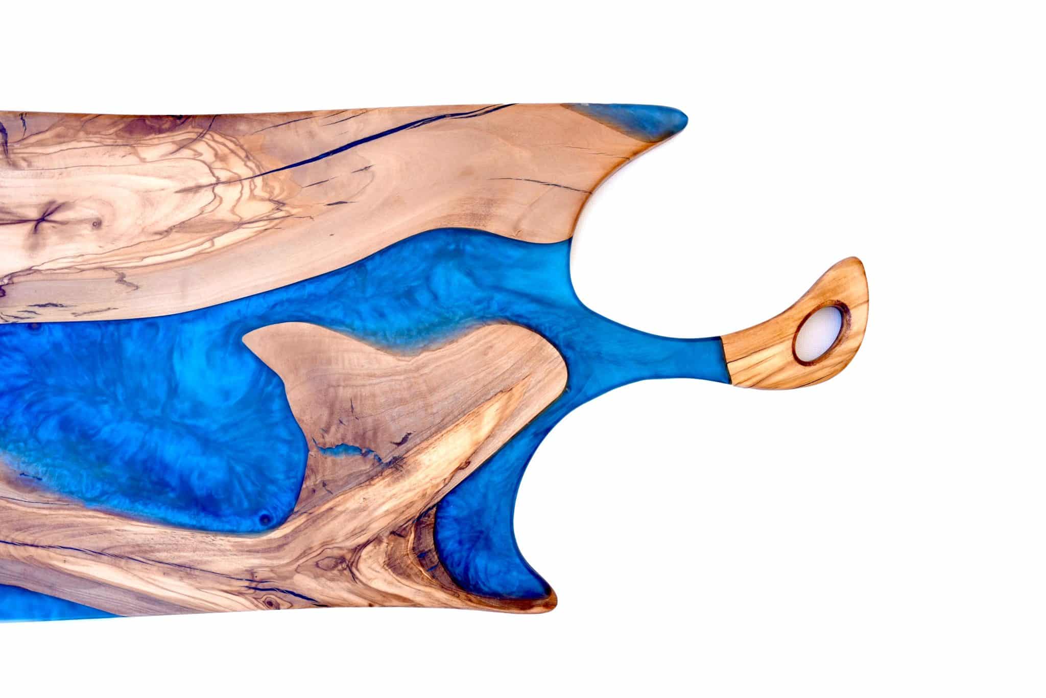 Perfect for food preparation, it offers a durable cutting surface while showcasing the natural beauty of the wood grain beneath the vibrant epoxy layers. Its modern design seamlessly blends into any kitchen or dining space, making it ideal for displaying meals, cheeses, or fresh fruits.