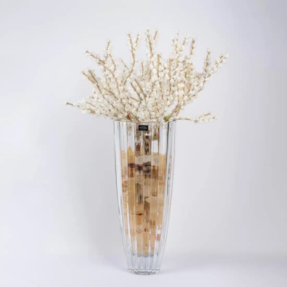 20 Light Cream / Camel Stem Gypsophilas in a Ribbed Bohemia Crystal Vase.