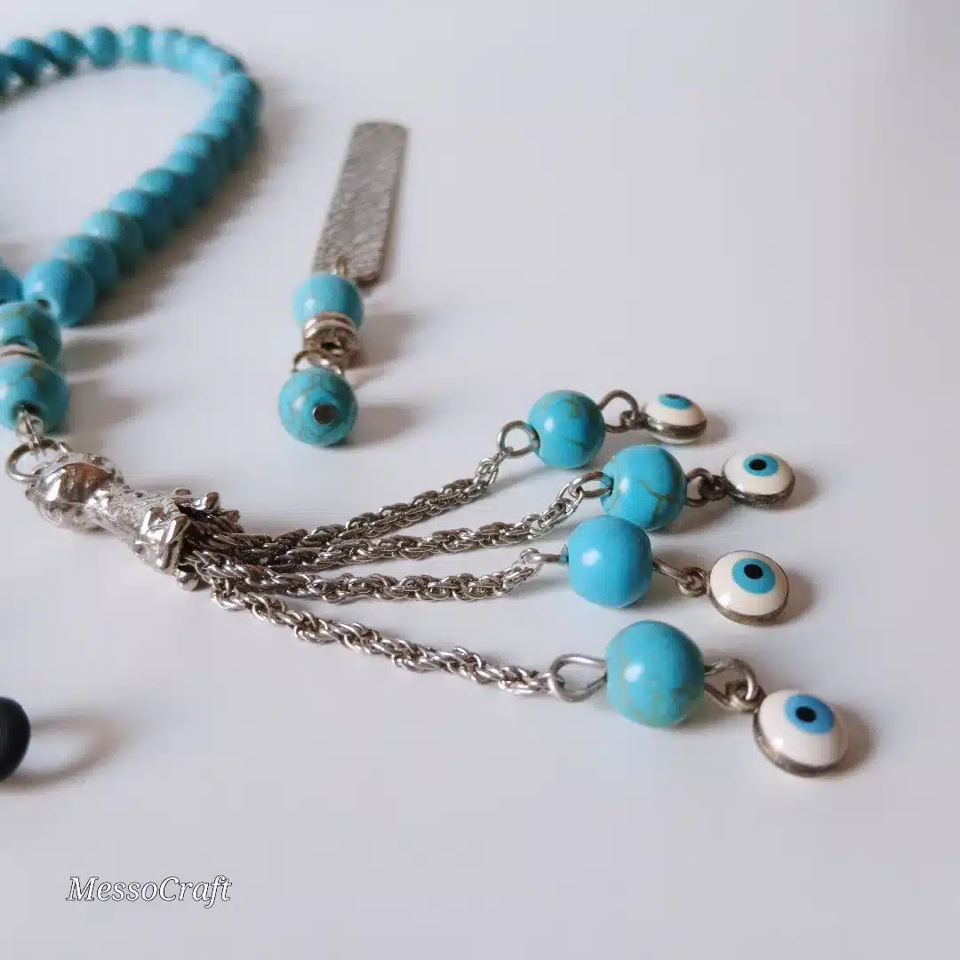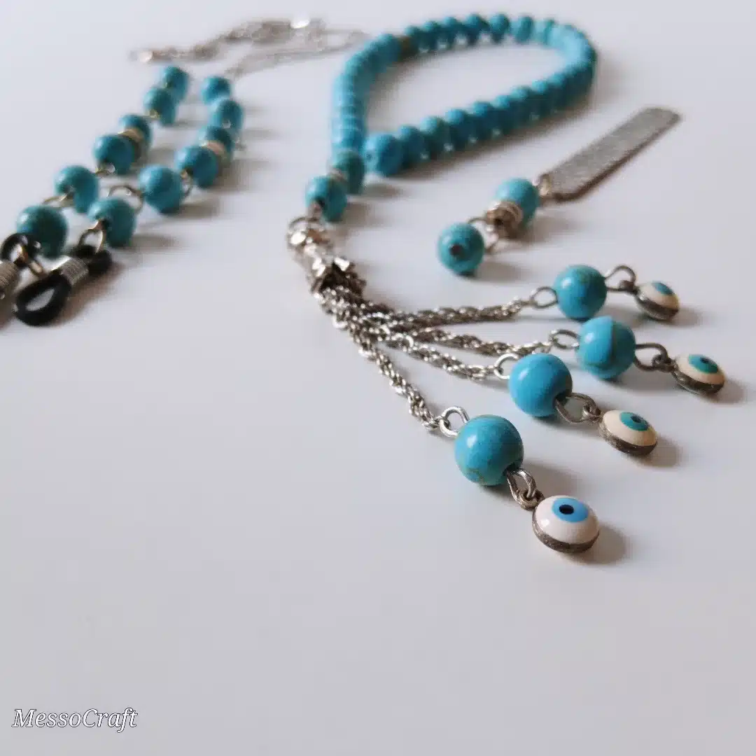 Made of blue turquoise fayroz stones and small evil-eye pendants and chain in silver colour