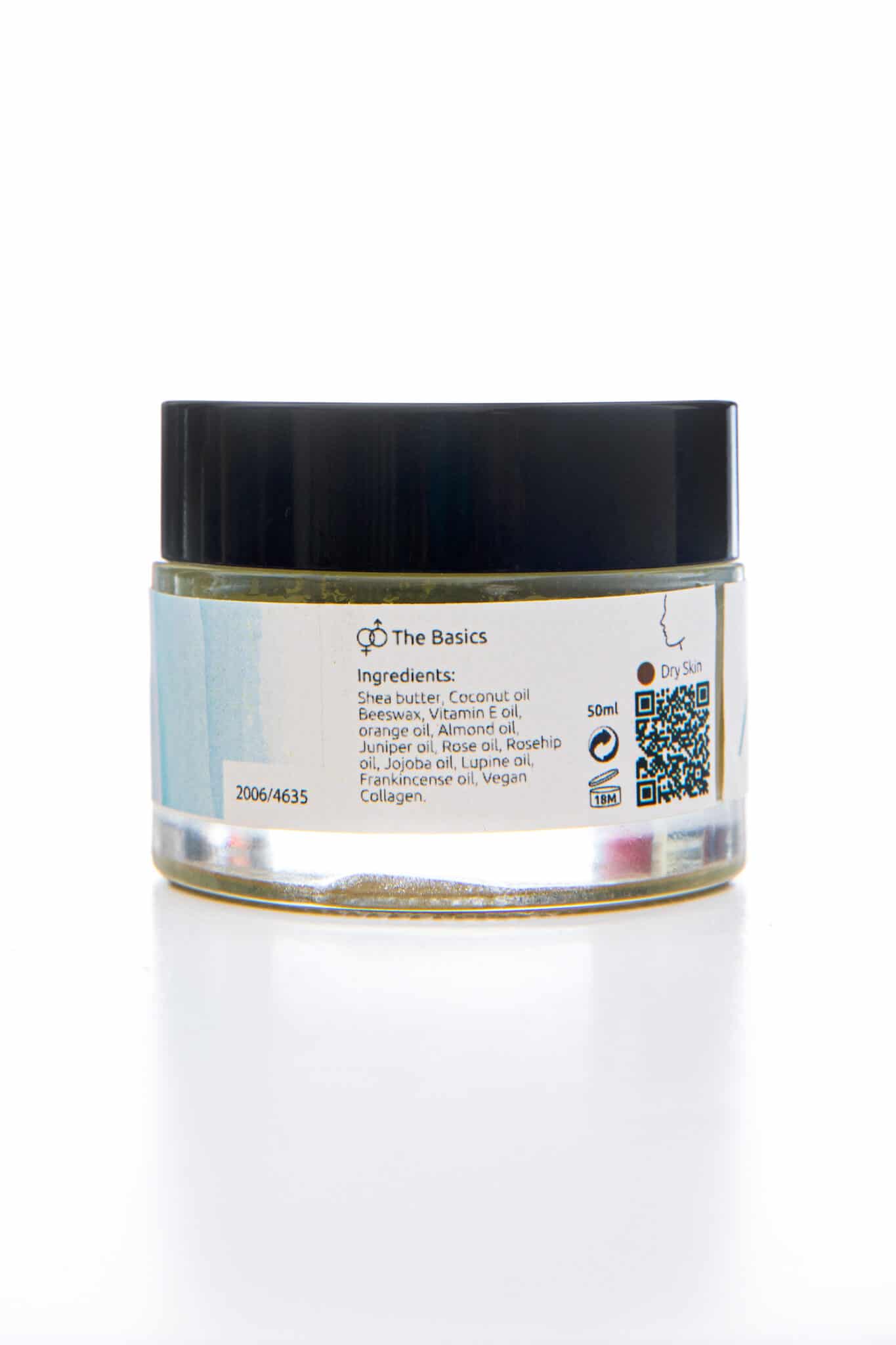 Shea butter. Coconut oil. Beeswax. Vitamin ُE oil. Orange oil.Almond oil.Juniper oil.Rose oil.Rosehip oil.Jojoba oil.Lupine oil.Frankincense oil .Vegan Collagen