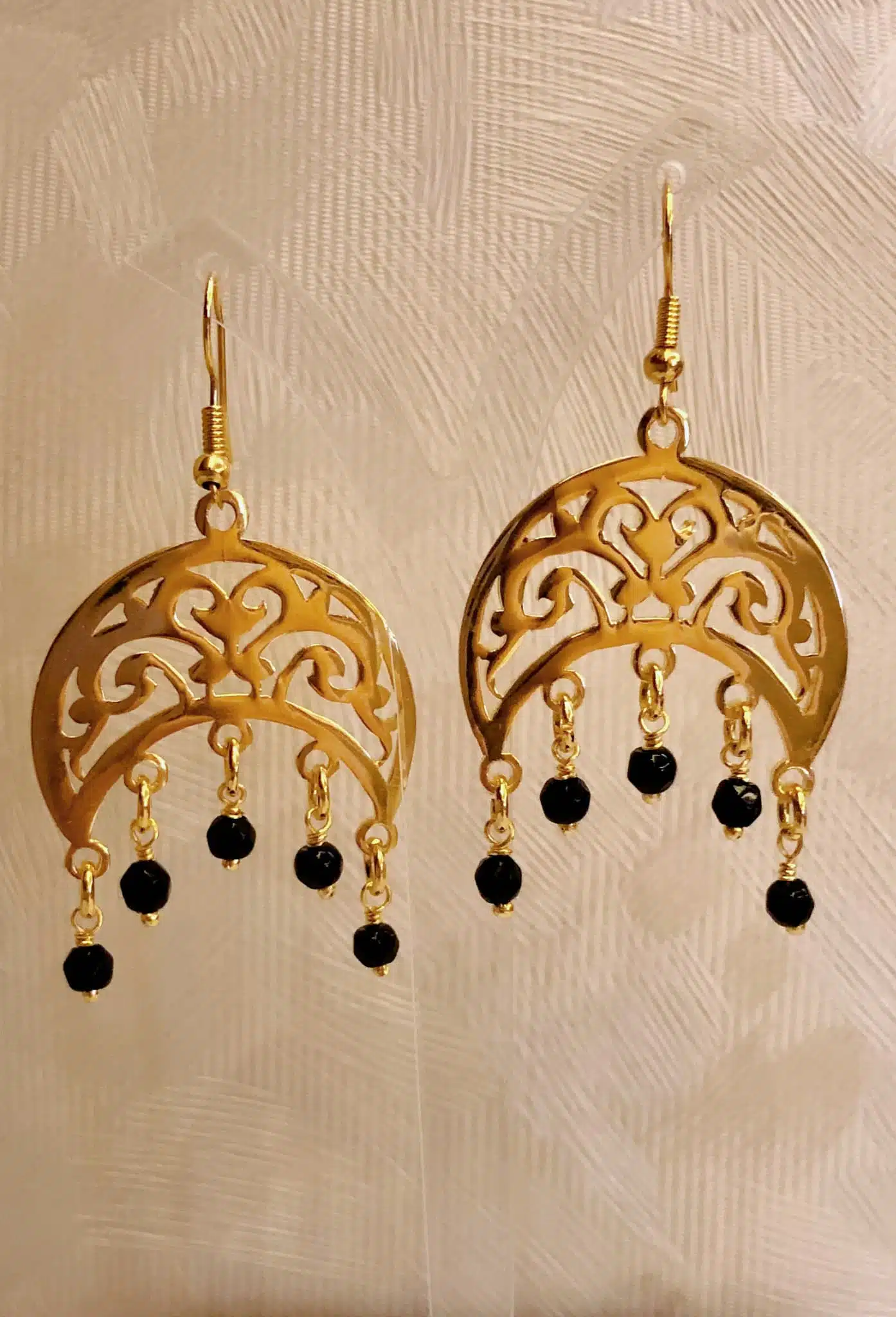 Brass plated with 18K, adorned with black Agat & intricate brass danglings