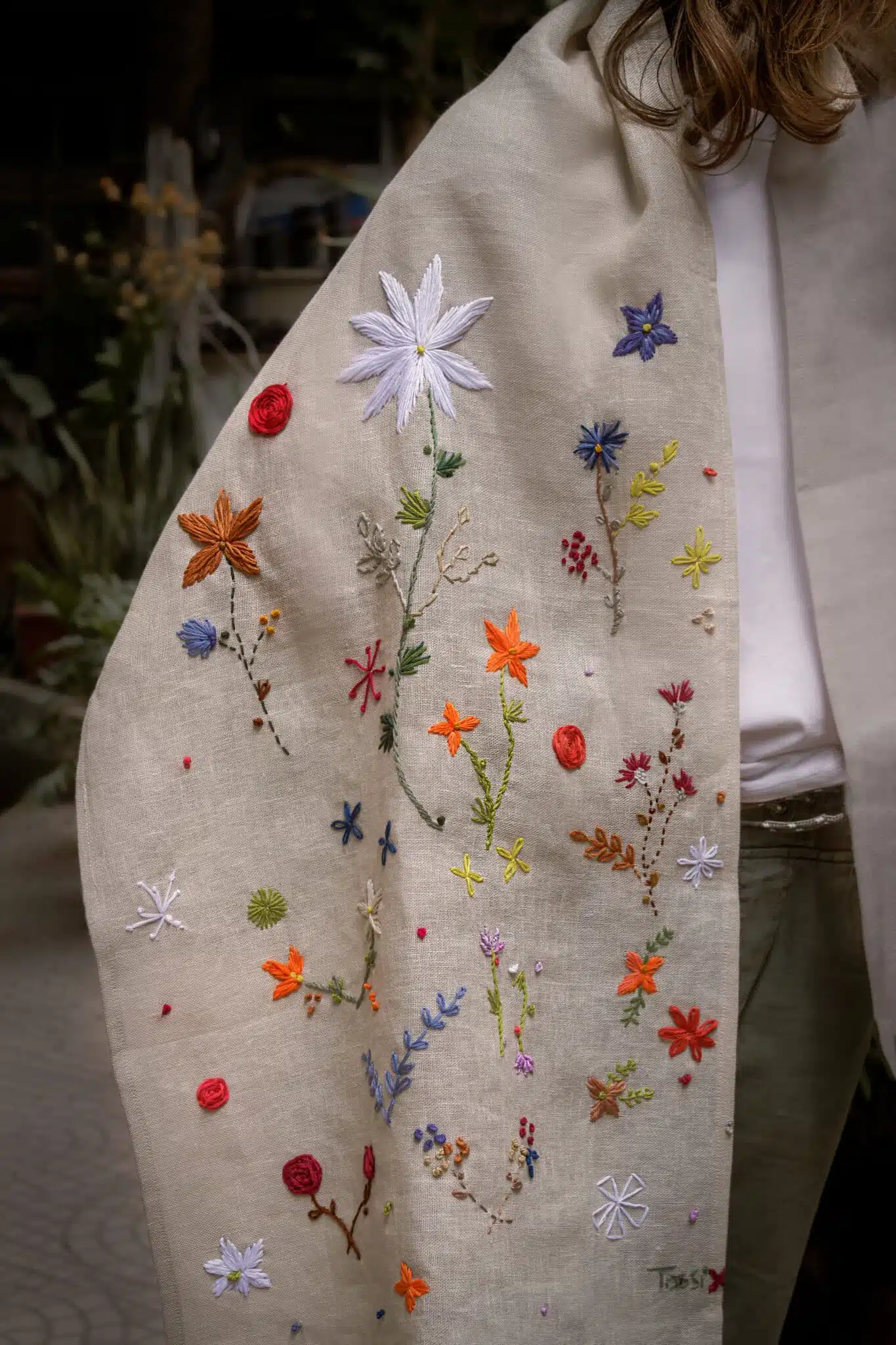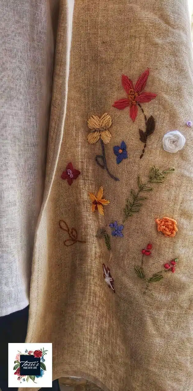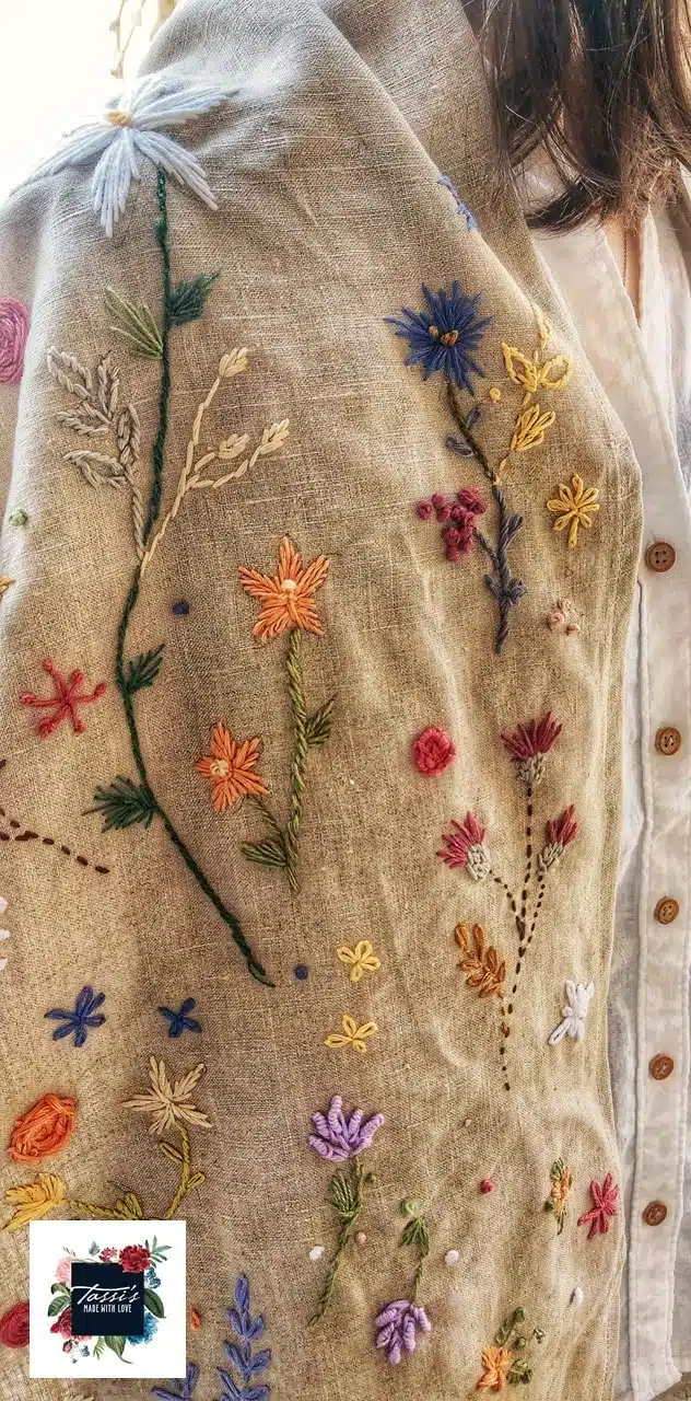 Material:Pure Linen Shawl, hand embroidered with cotton threads.