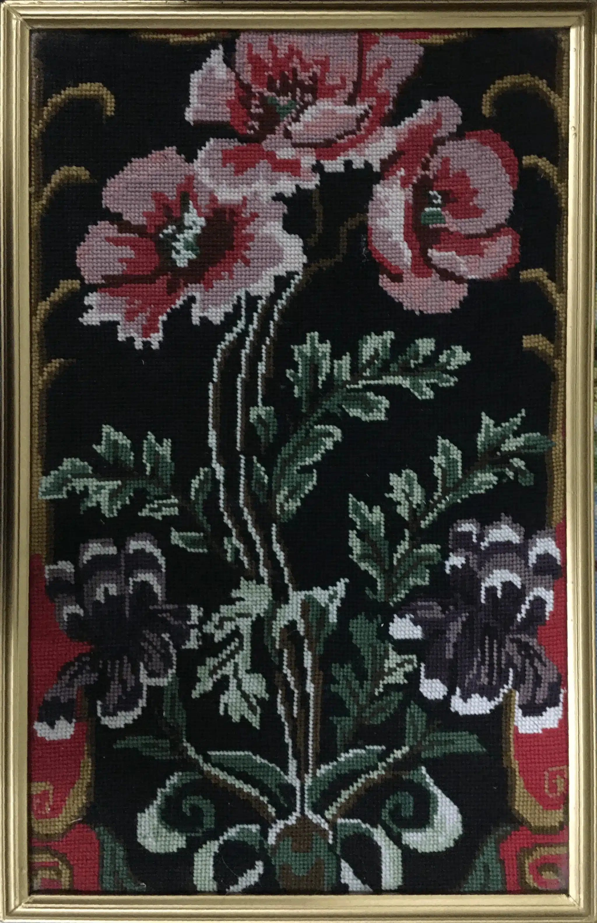 This exquisite handwoven tapestry presents a vivid bouquet of red and pink flowers standing out against a bold black background. The intricate detailing of the leaves and petals is complemented by a harmonious palette of greens and purples, with golden accents adding a regal touch. Framed in gold, this masterpiece exudes sophistication and would enhance any interior setting with its classic charm.