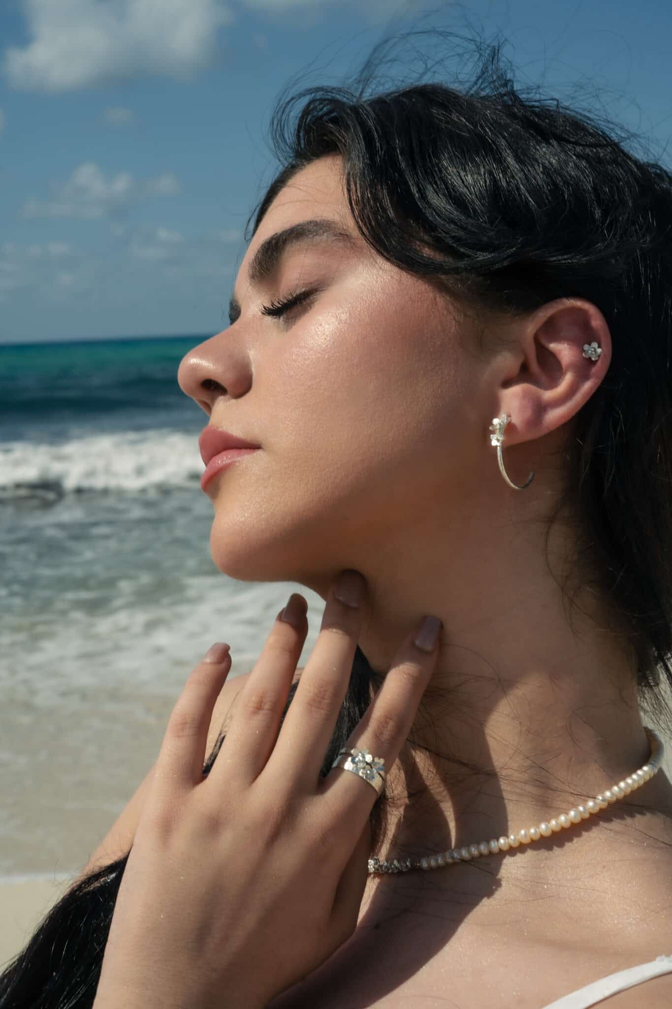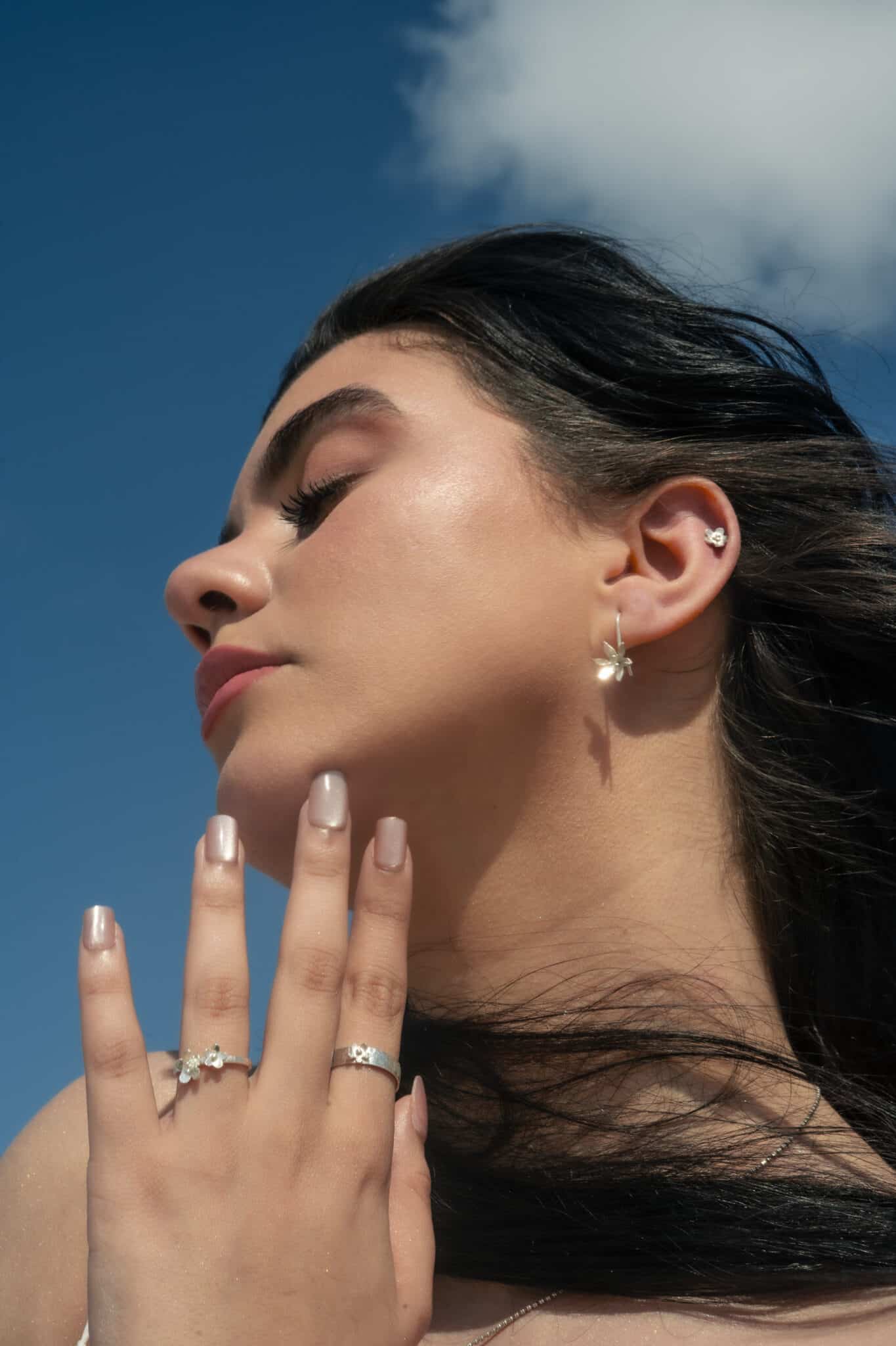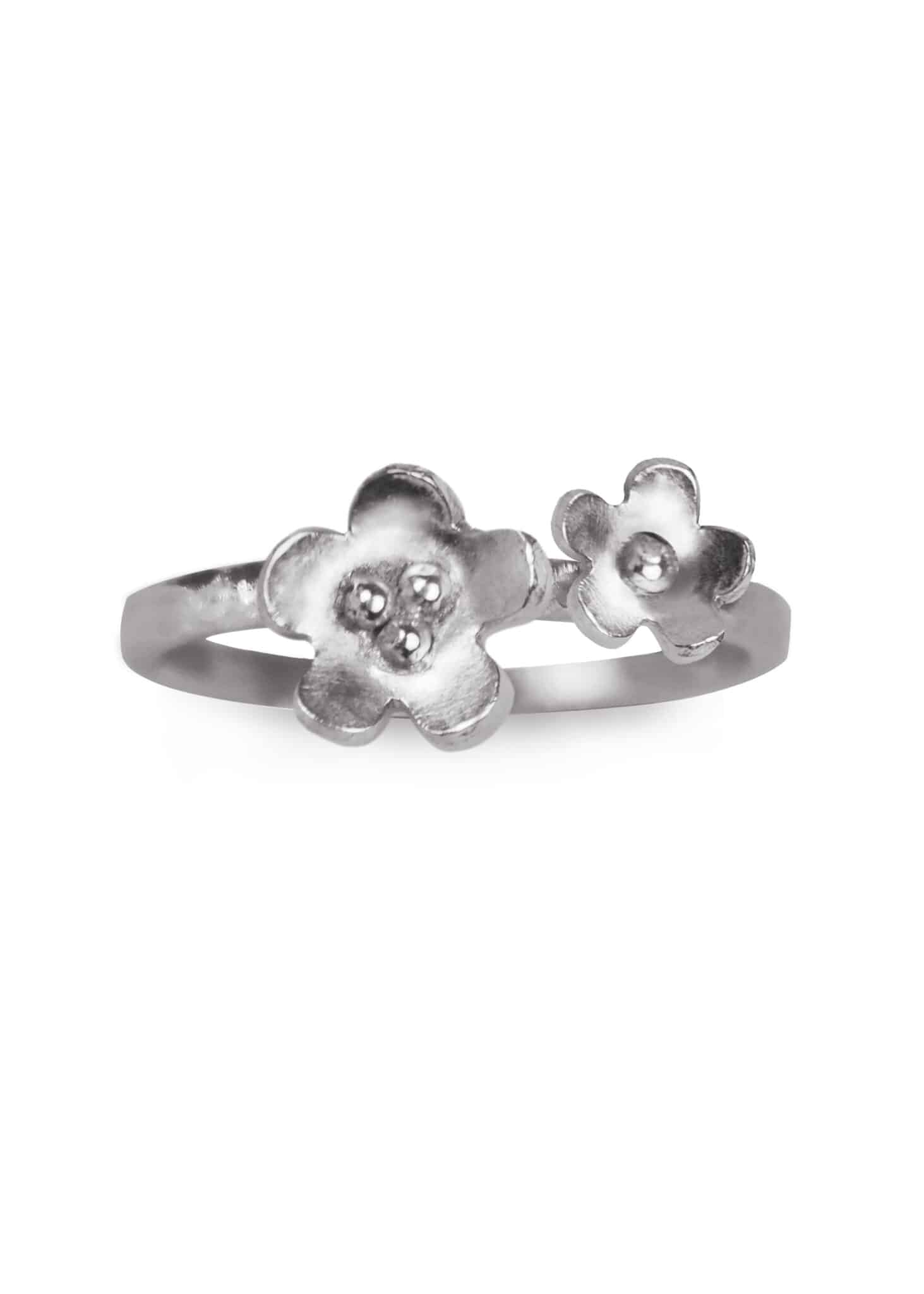 Silver ring with a luminous texture and a delicate flower detail. Accented with a small and a medium sized flower. Perfect for stacking.