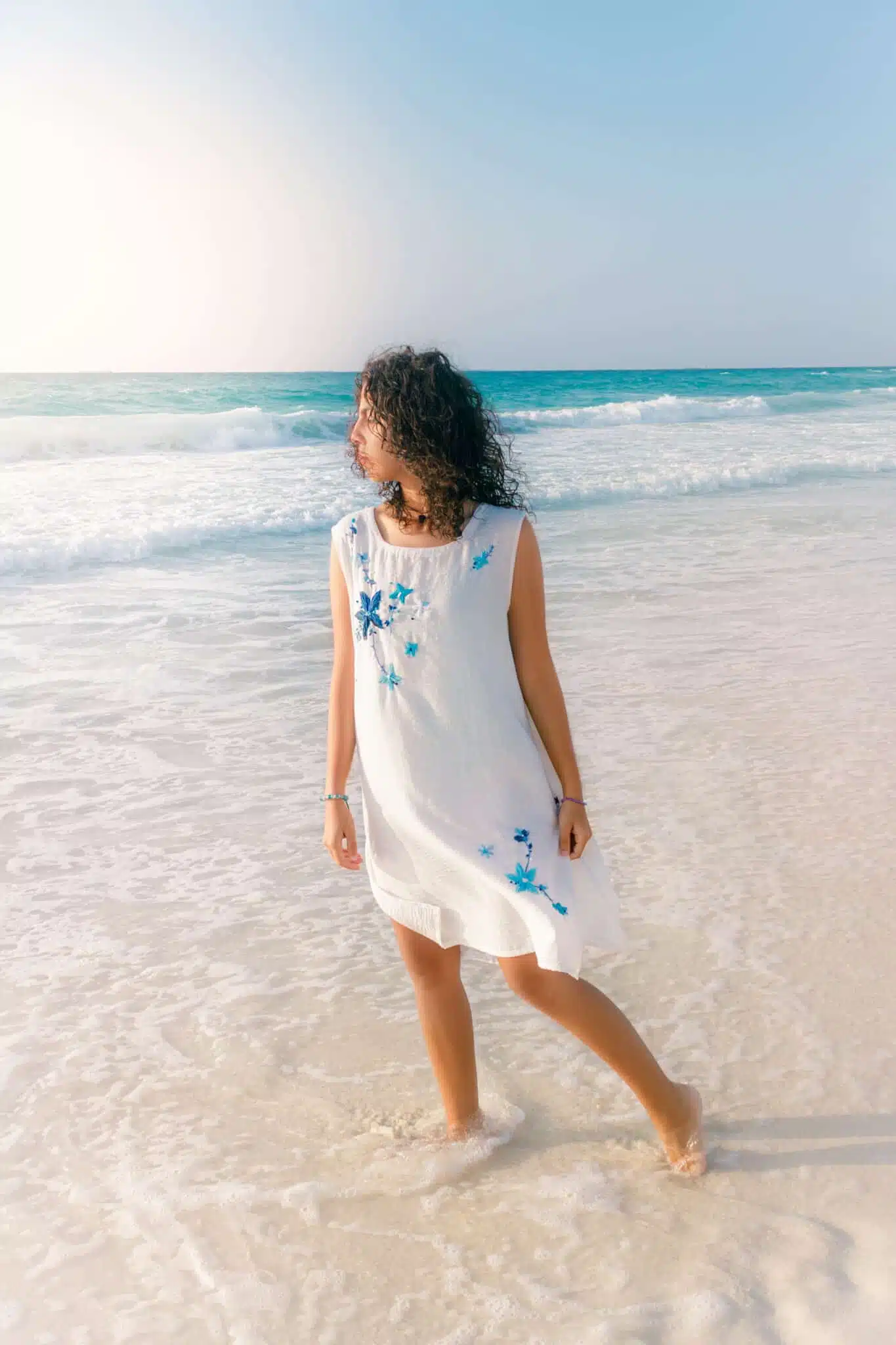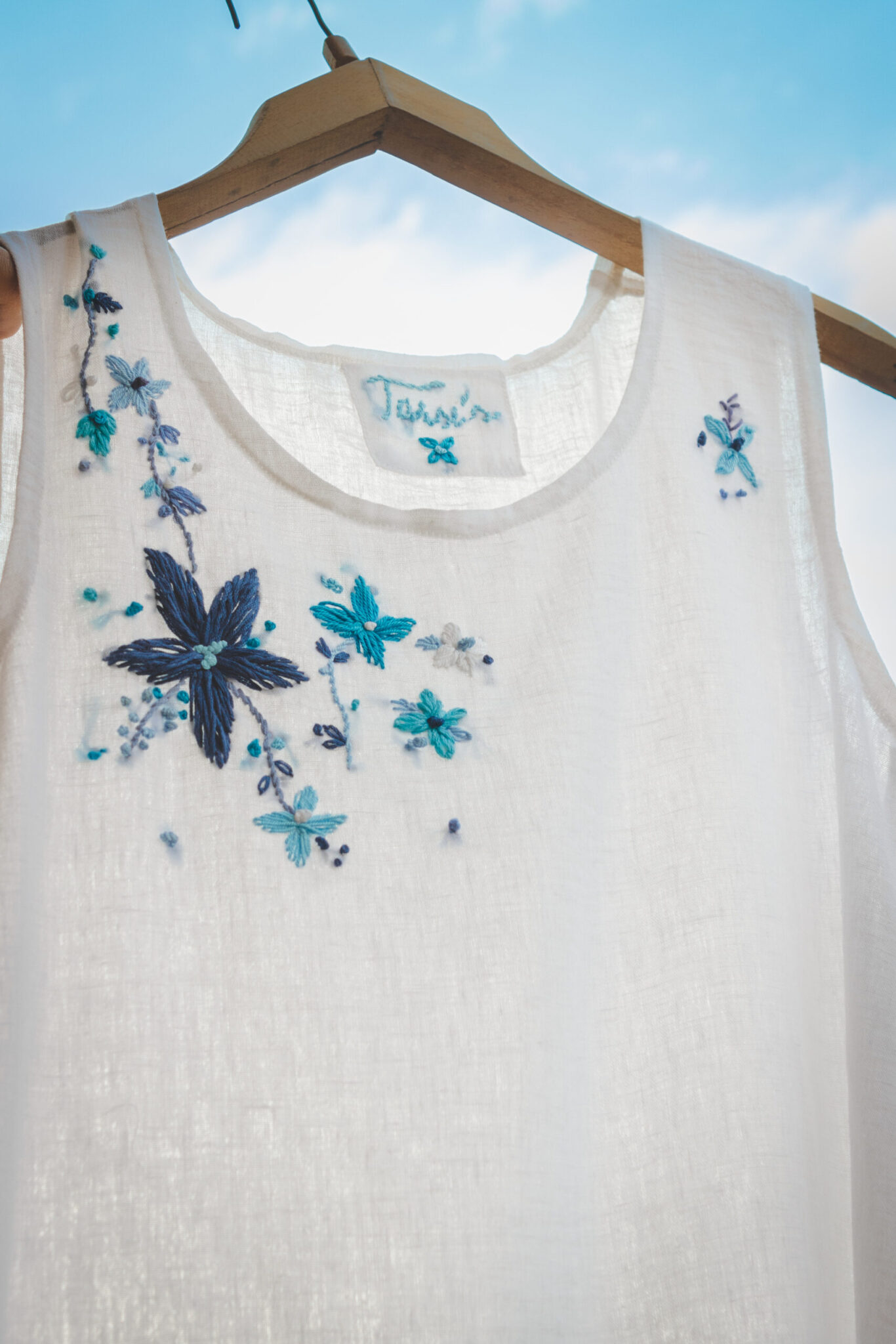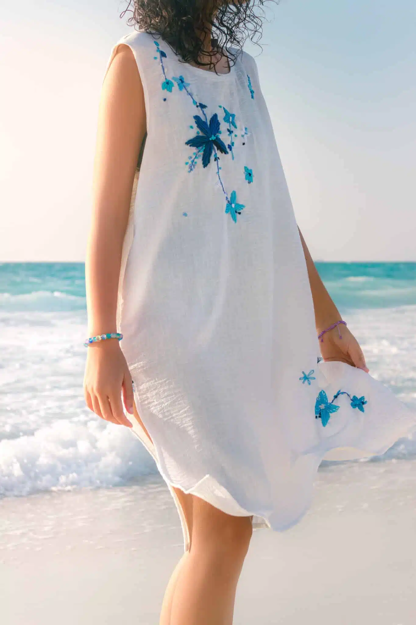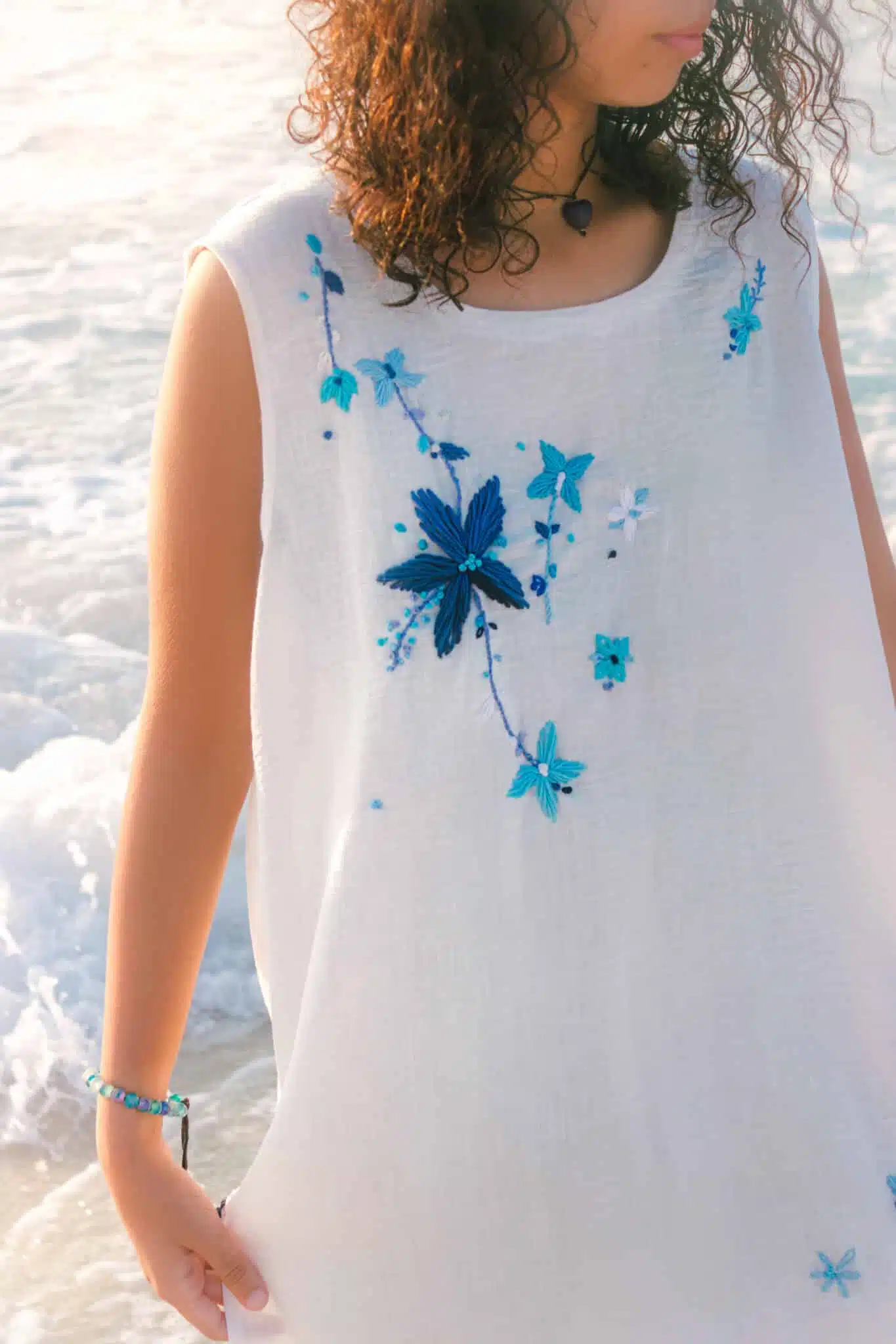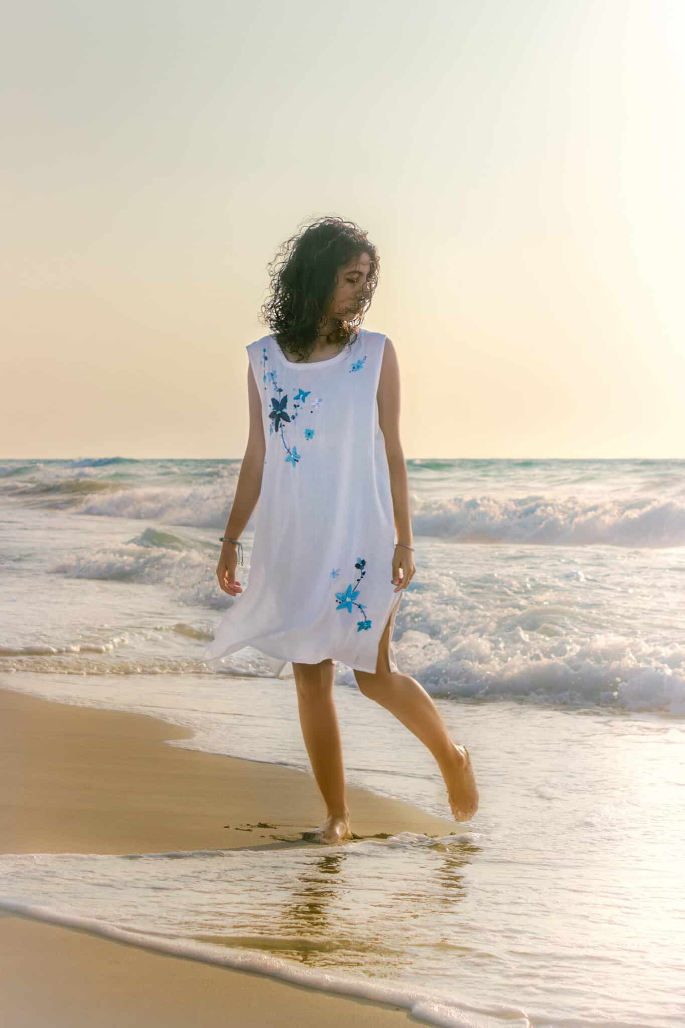 • Whitle cotton linen summer beach dress with hand embroidery.
