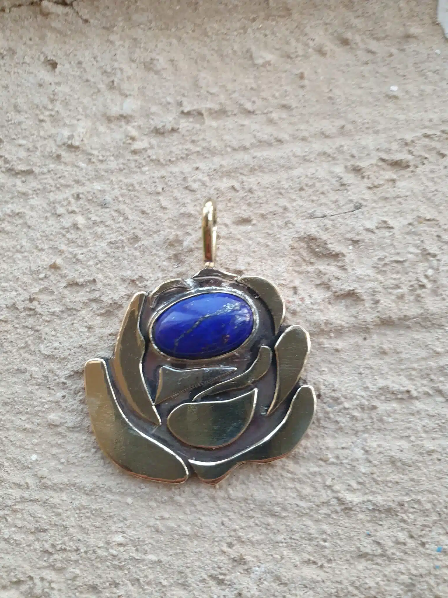 Brass rose flower pendant with blue starry stone.