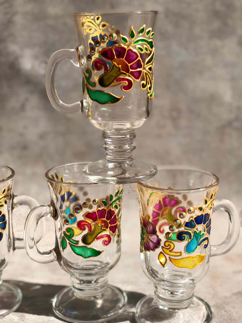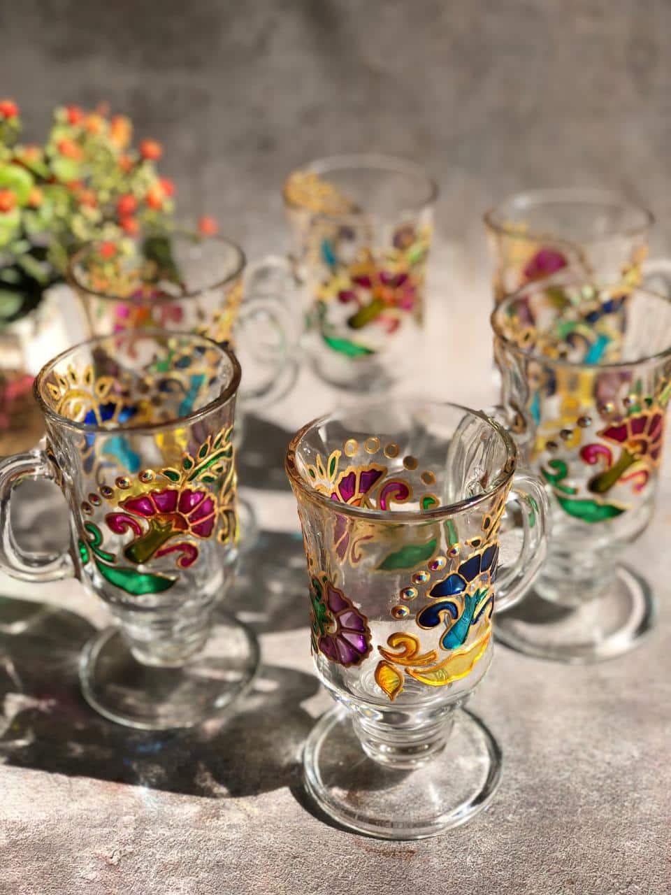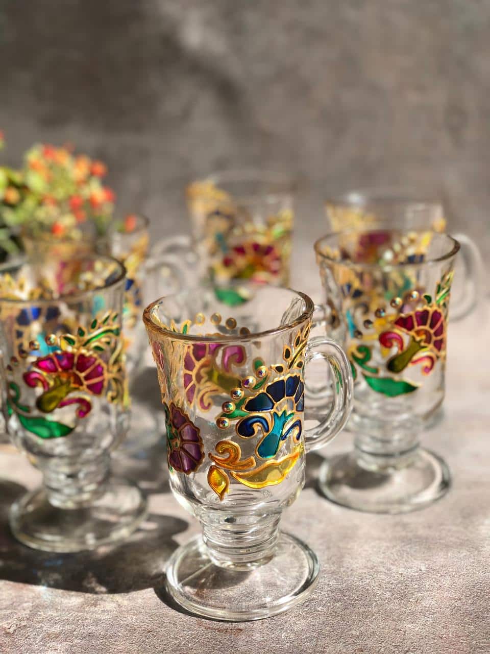 Painted colorful flowers on cups