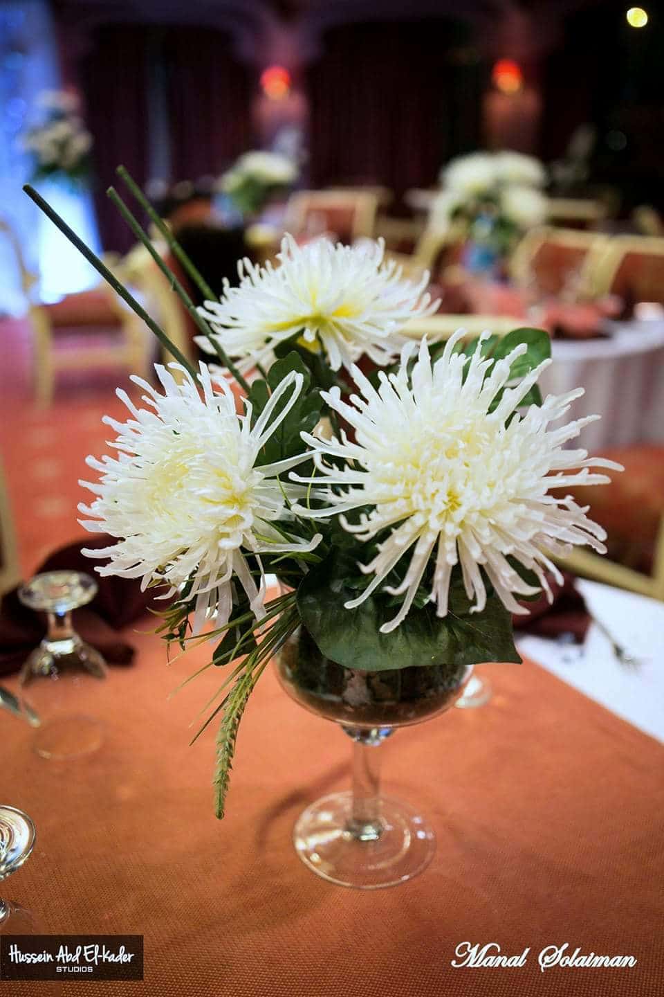 White flowers centerpiece in a clear glass base.Can be back ordered within 3 days
