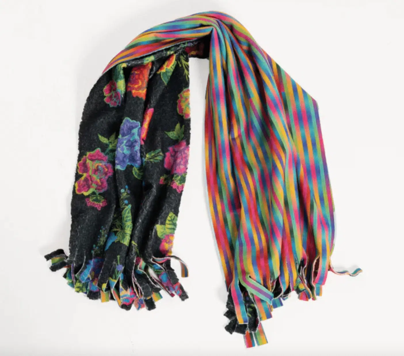 Wrap yourself in cozy warmth with this Fleece-y chunky scarf. It’s double faced, face one is floral patterned, and face two is striped with the same palette as the first one. Will perfectly match a plain black outfit, adding a very bold look.