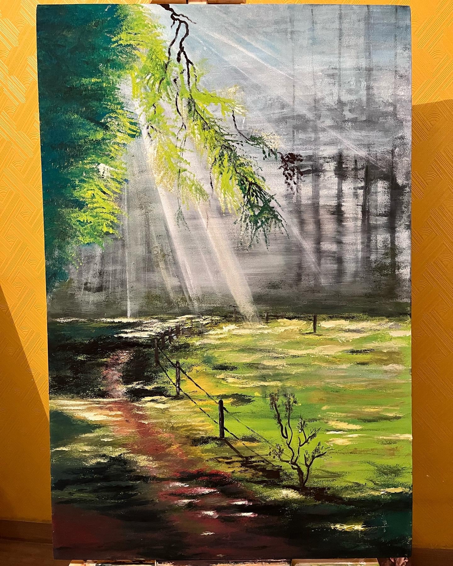 A nature theme theme at your house gives you peace of mind. Acrylic foggy forest wall decoration framed gold. Relaxing and unique.