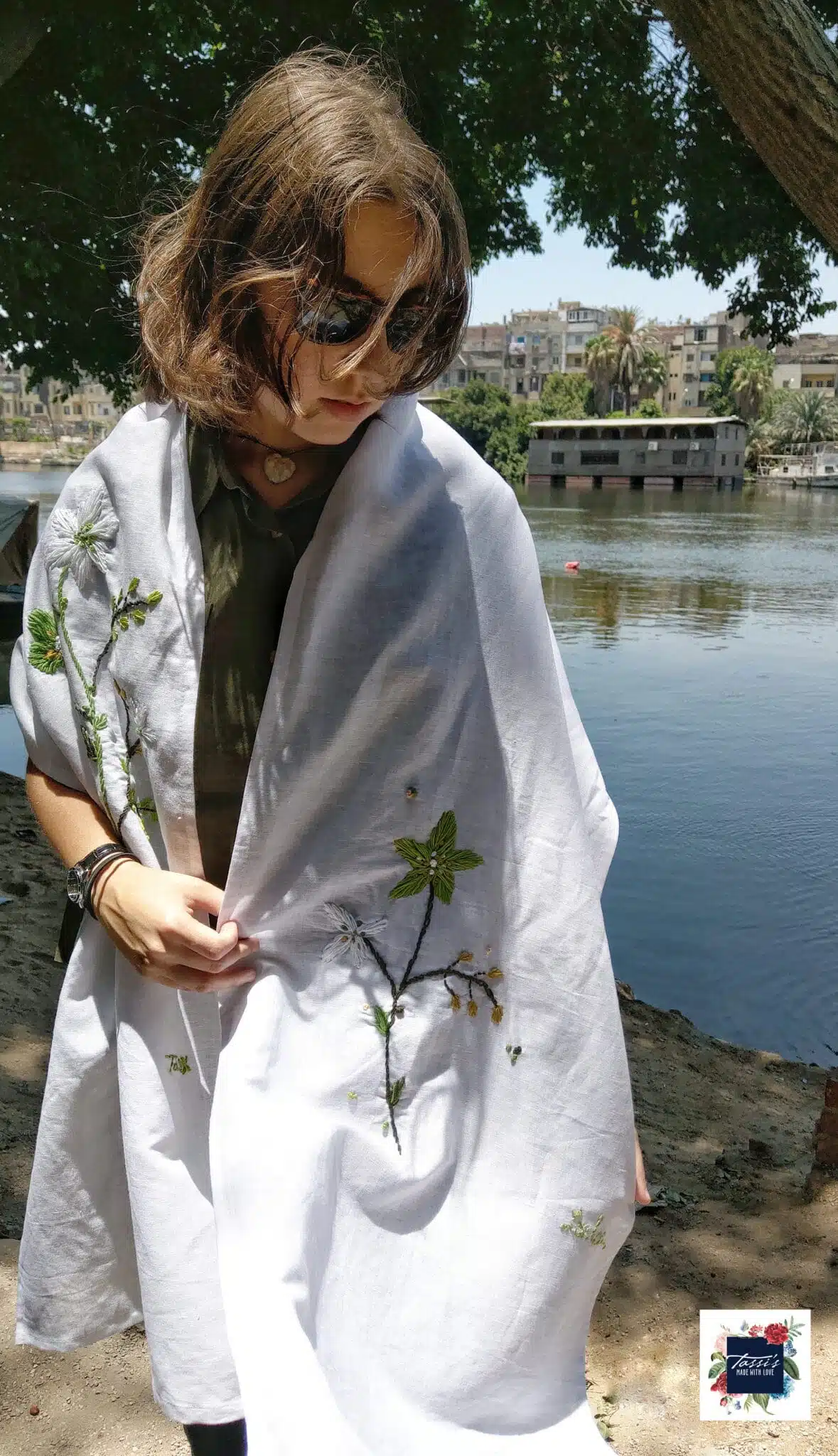 White Linen Shawl with handmade embroidery.