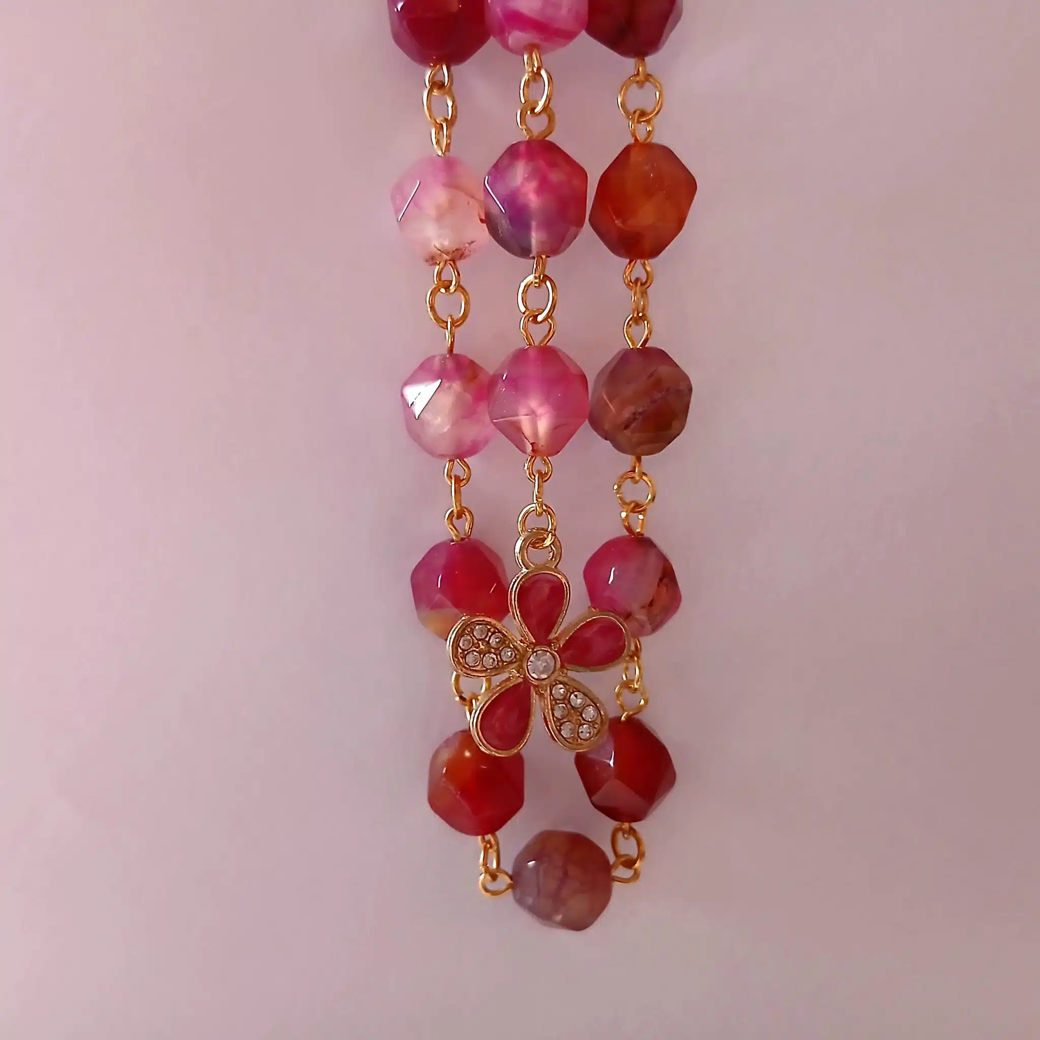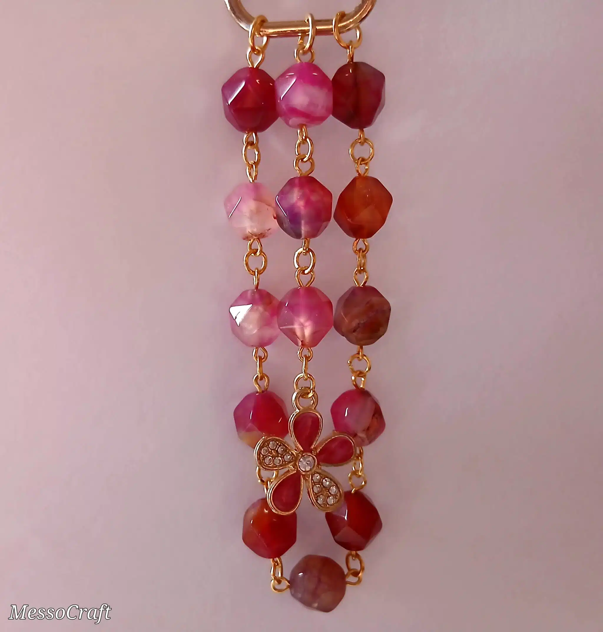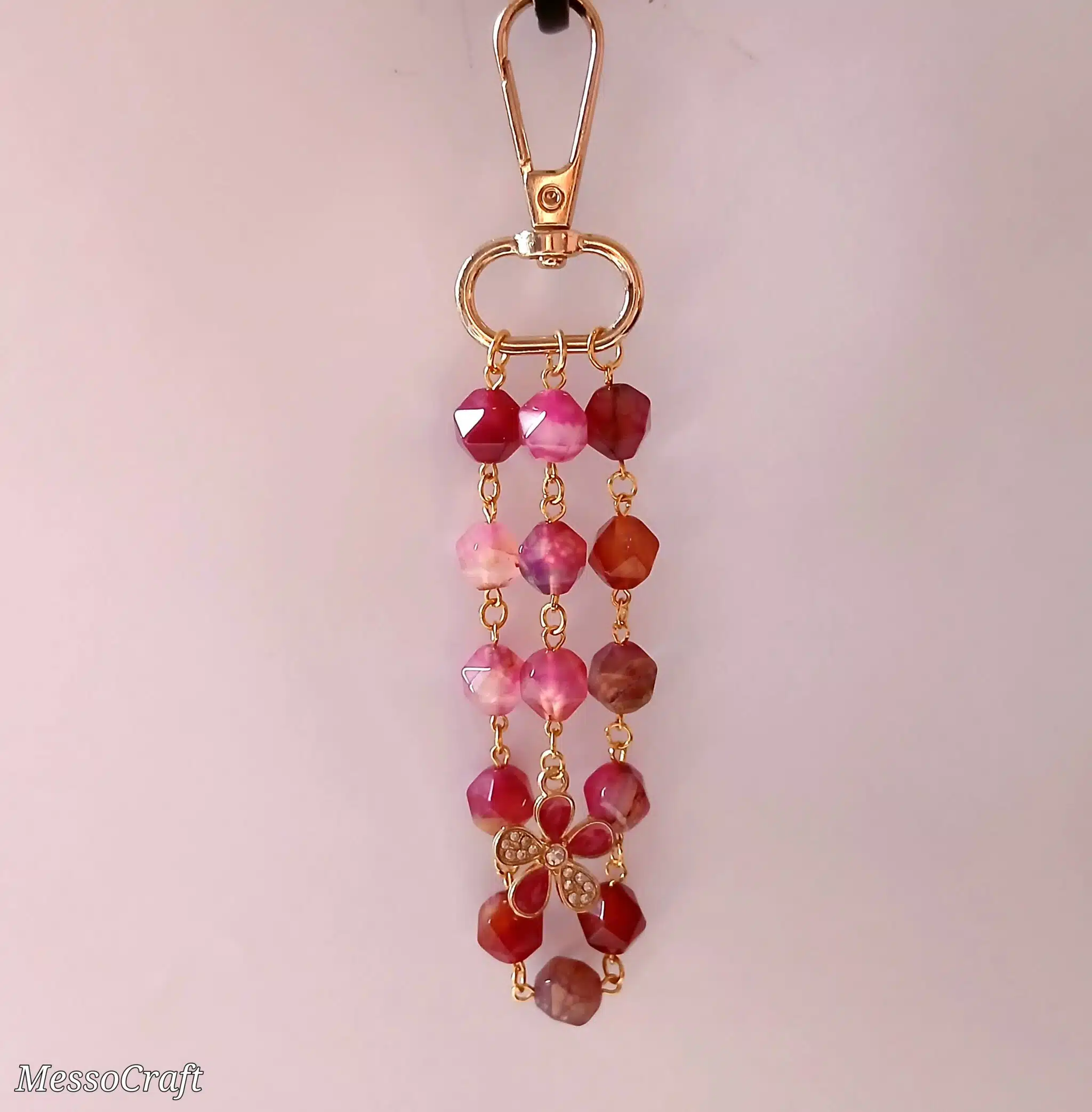 Bag charms made of fuchsia agate stones and hanged a plated fuchsia pendant in the shape of a flower