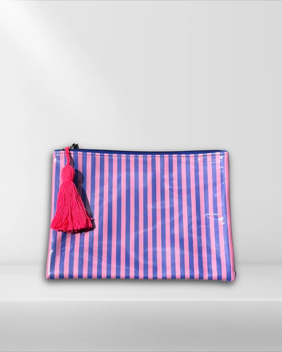Plastic Wrapped Pouch size 25x35cm , in blue & pink striped pattern with fuchsia tassel,