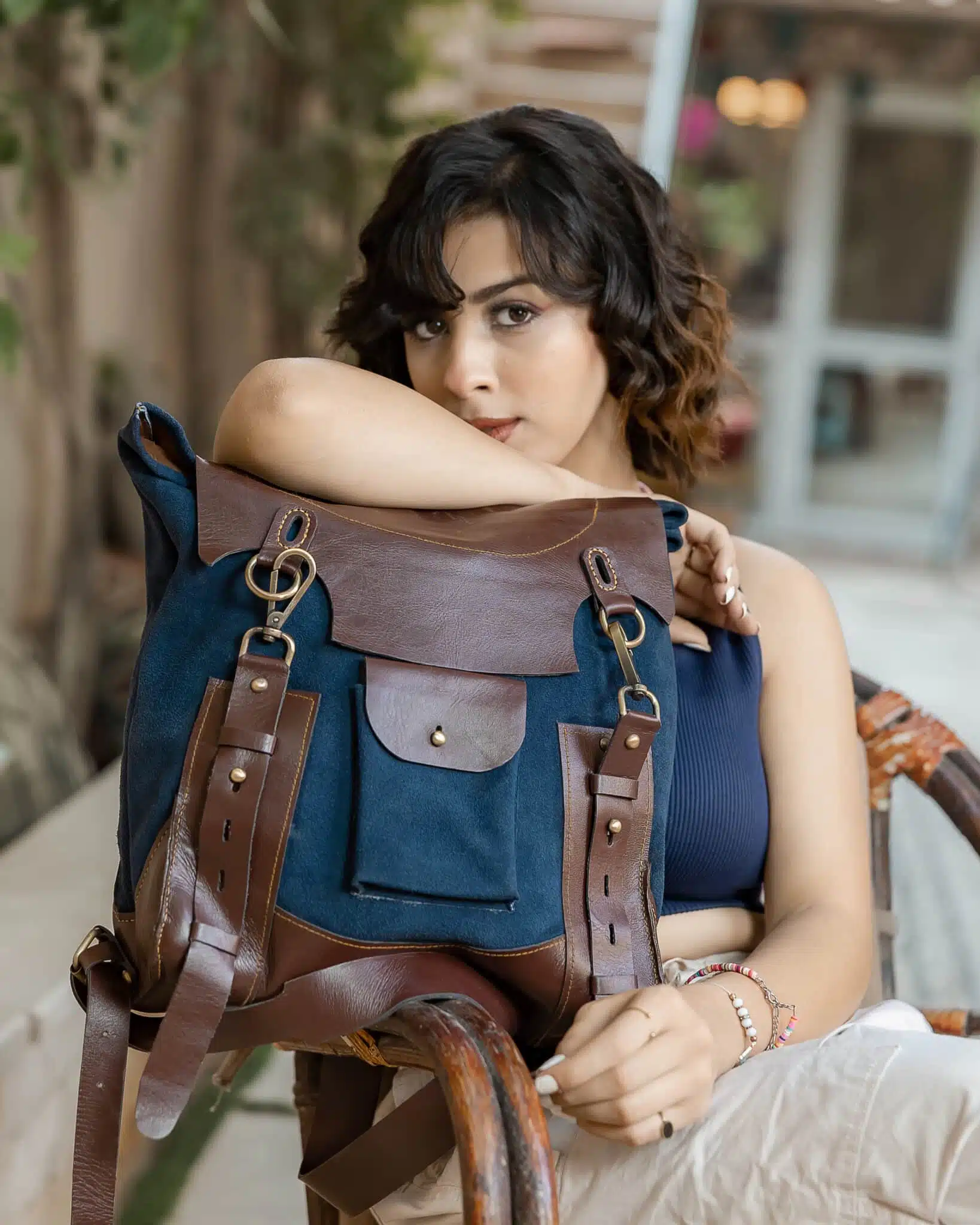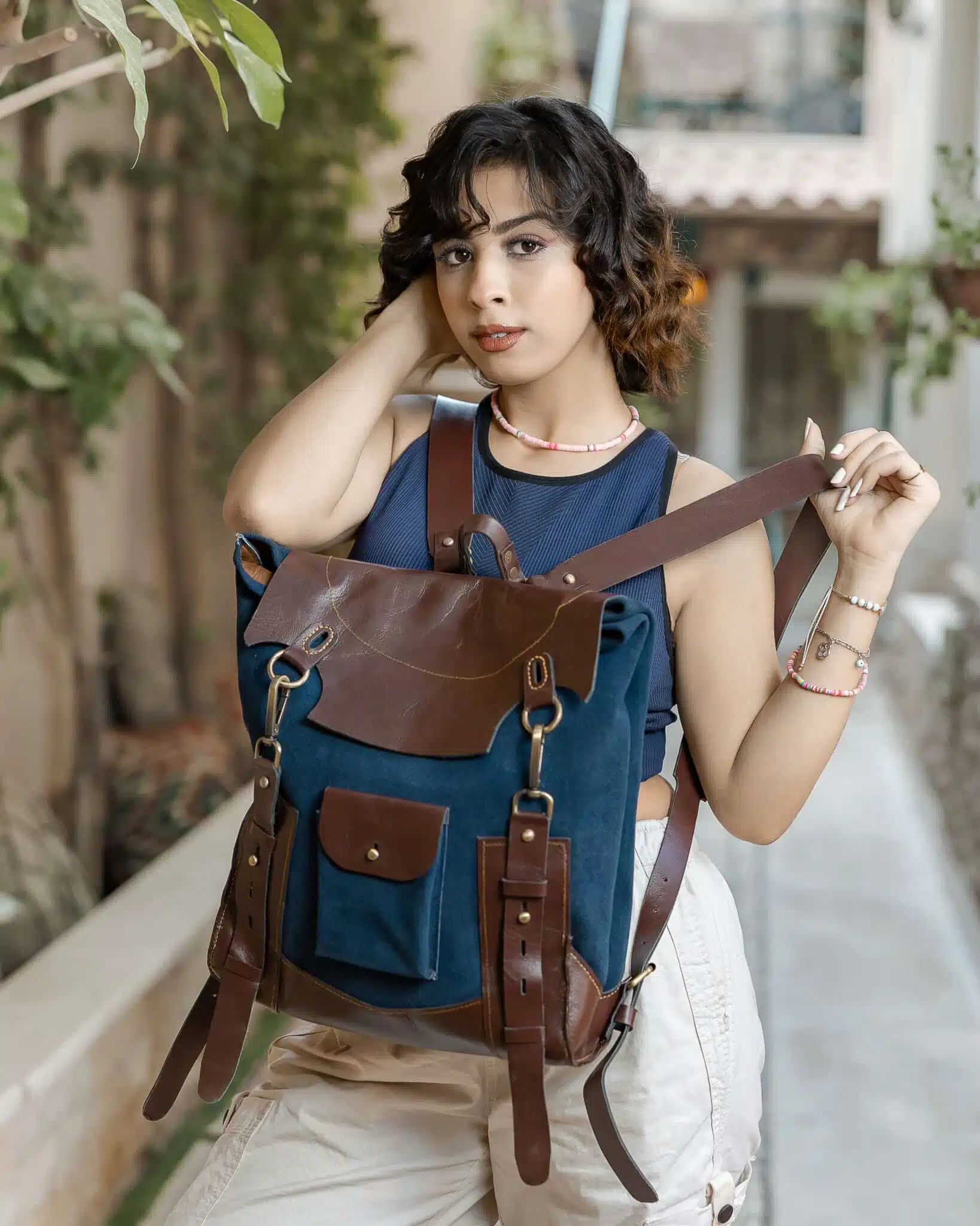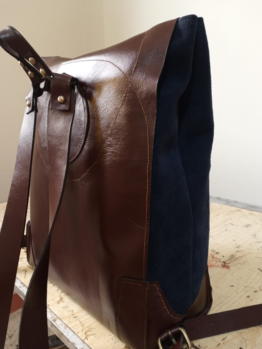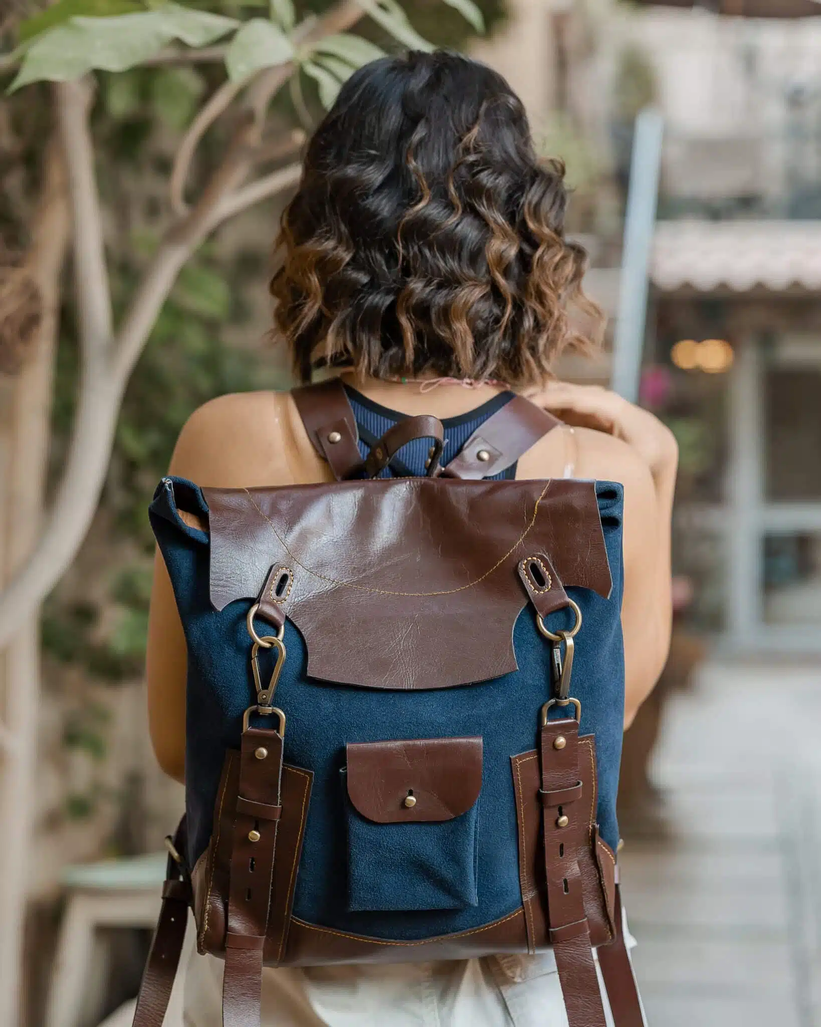 Brown and Blue large leather backpack for women. It is great solution for everyday use. Can serve as a gift to your family members or a dear friend.