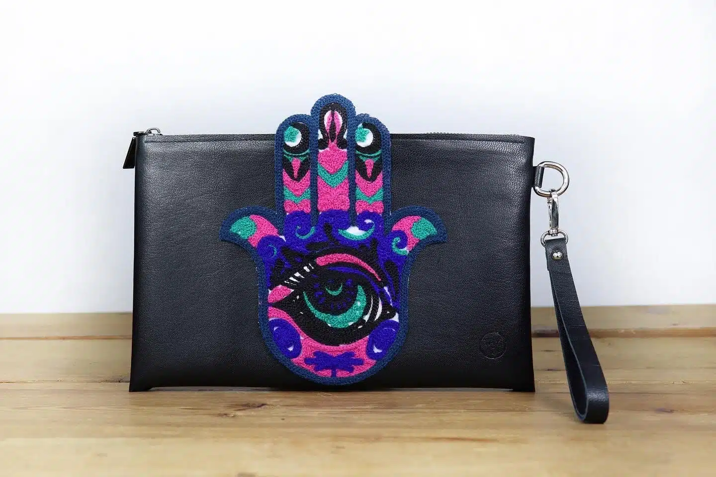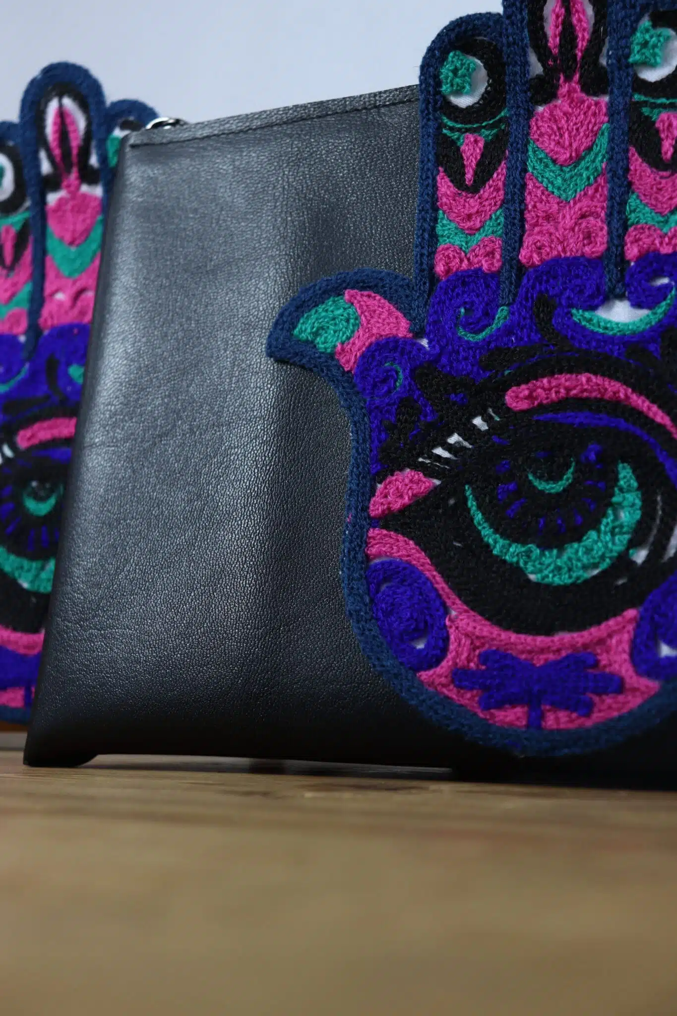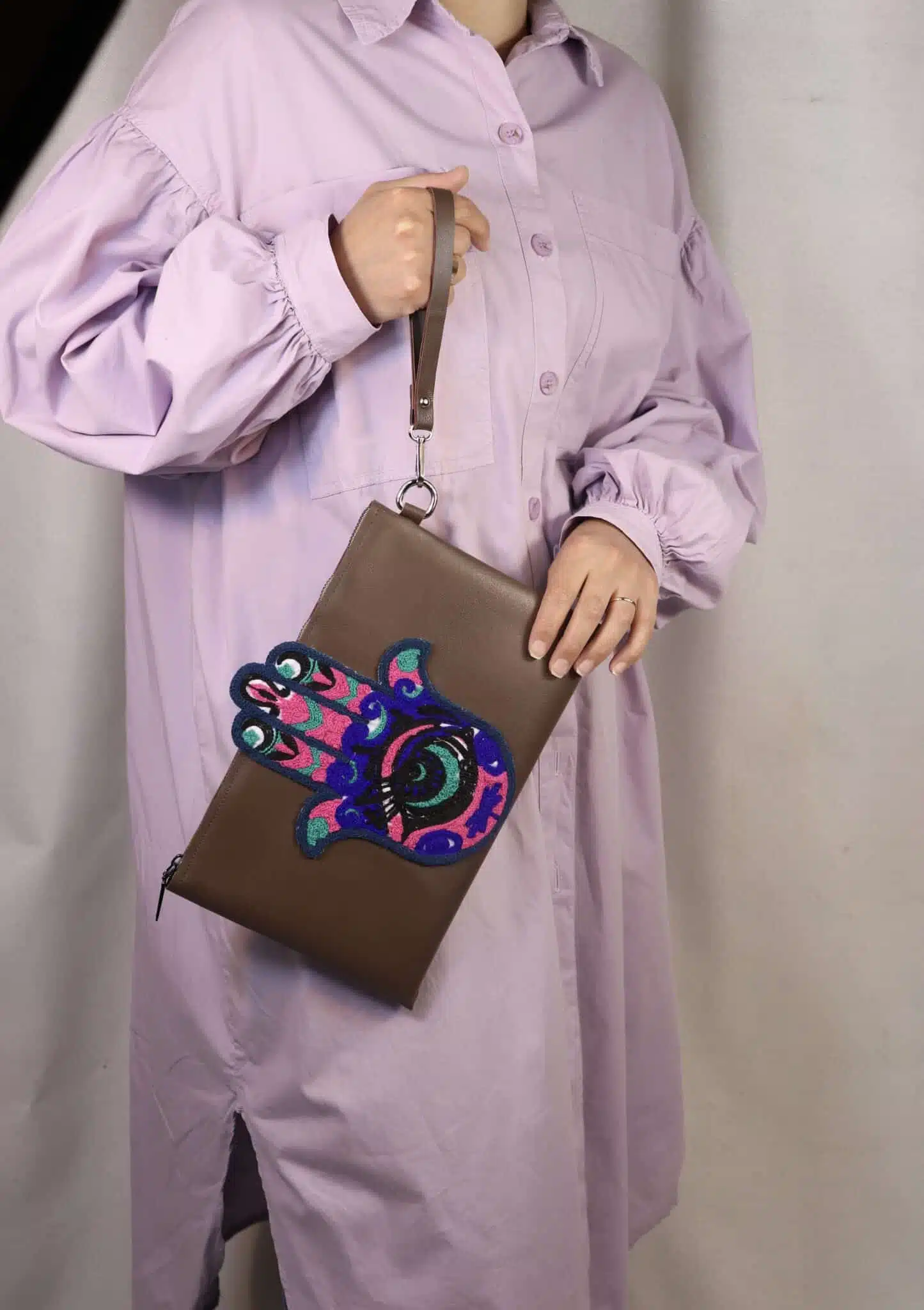 An excellent accessory iftar invitations, at sahour events. Genuine Leather clutch in combination with embroidered fabric in the shape of the palm of the hand.Excellent also as a gift during Ramadan.