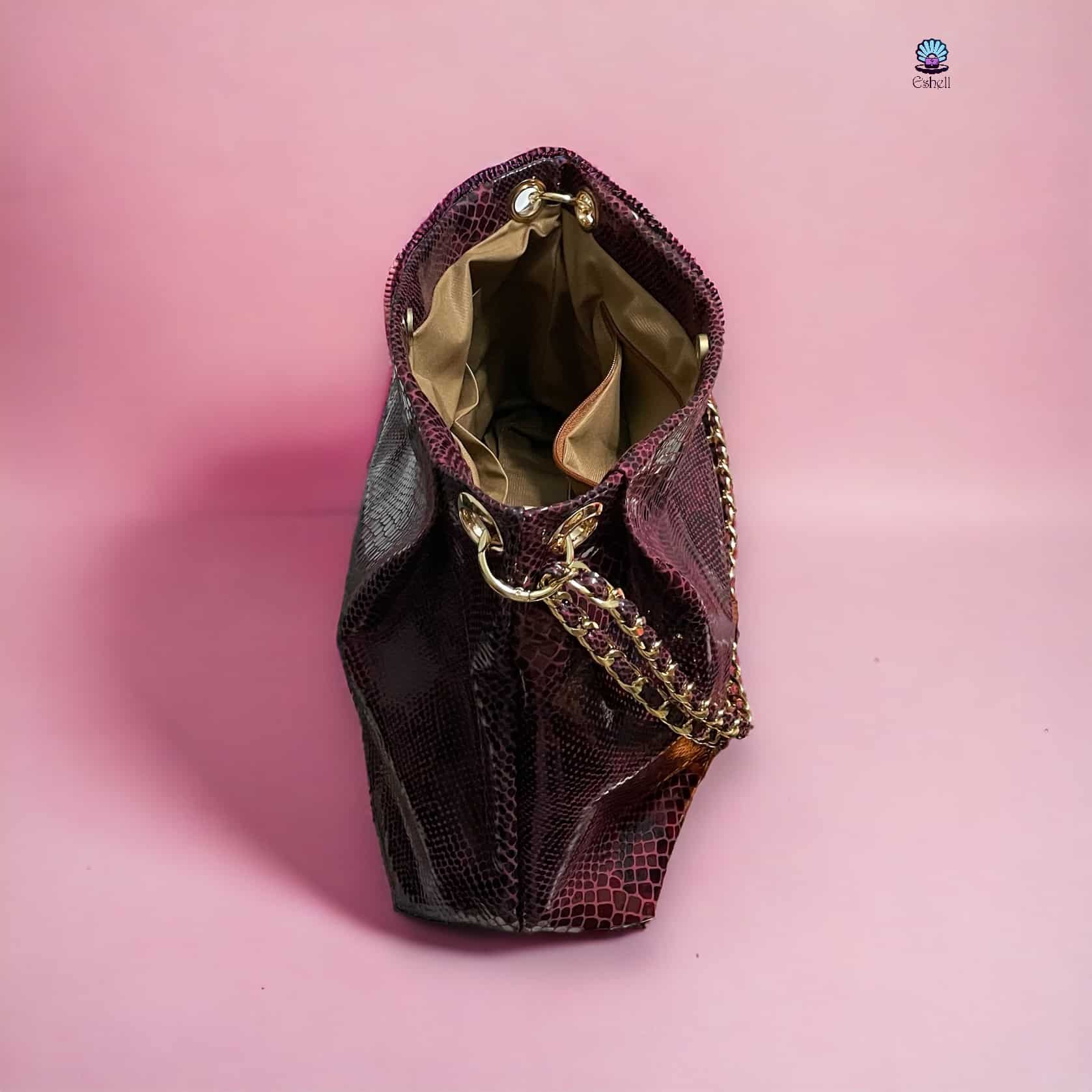 Crafted from high quality lazar genuine leather. Equipped with a chain with leather strap, this accessory can be worn as a shoulder bag