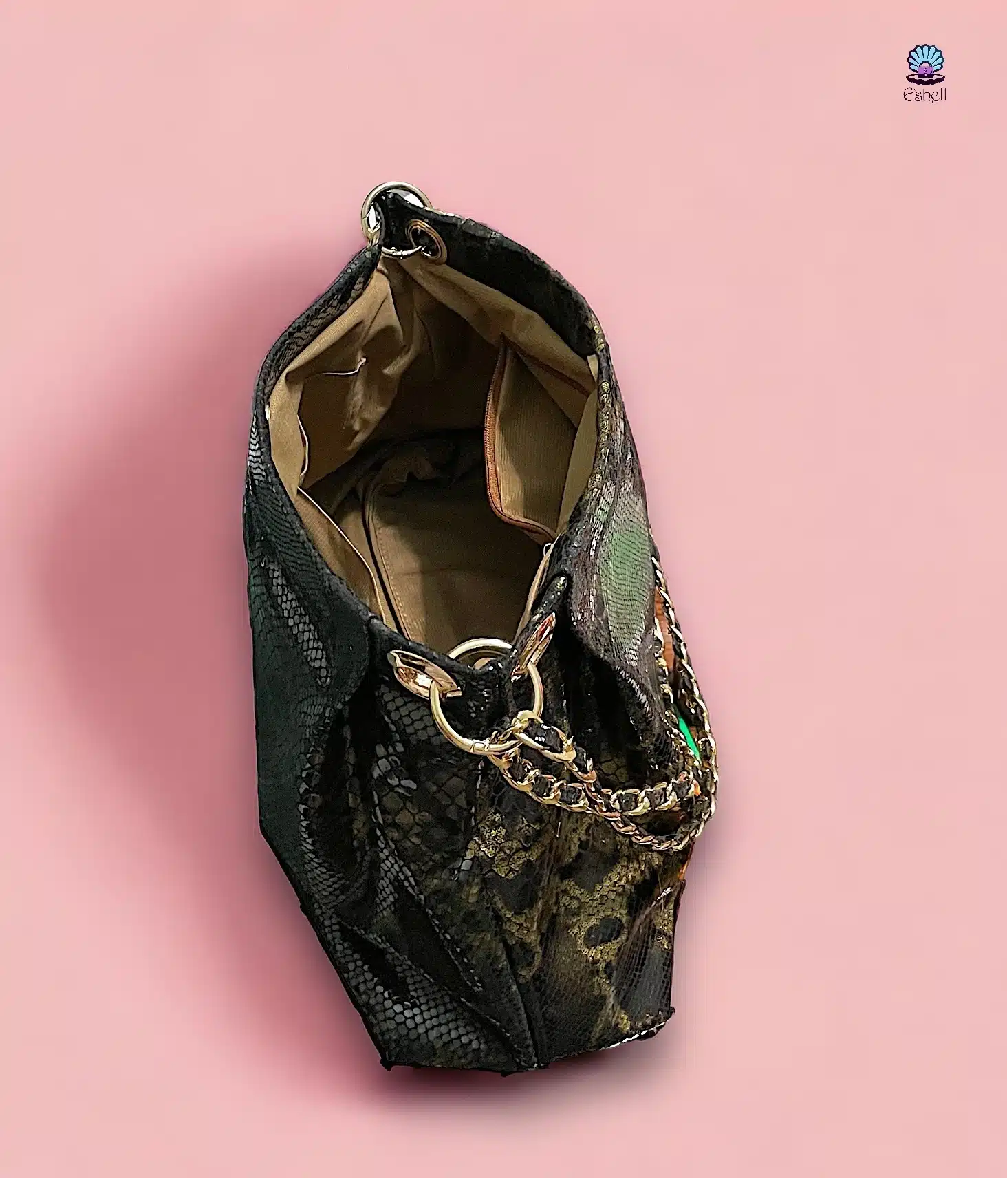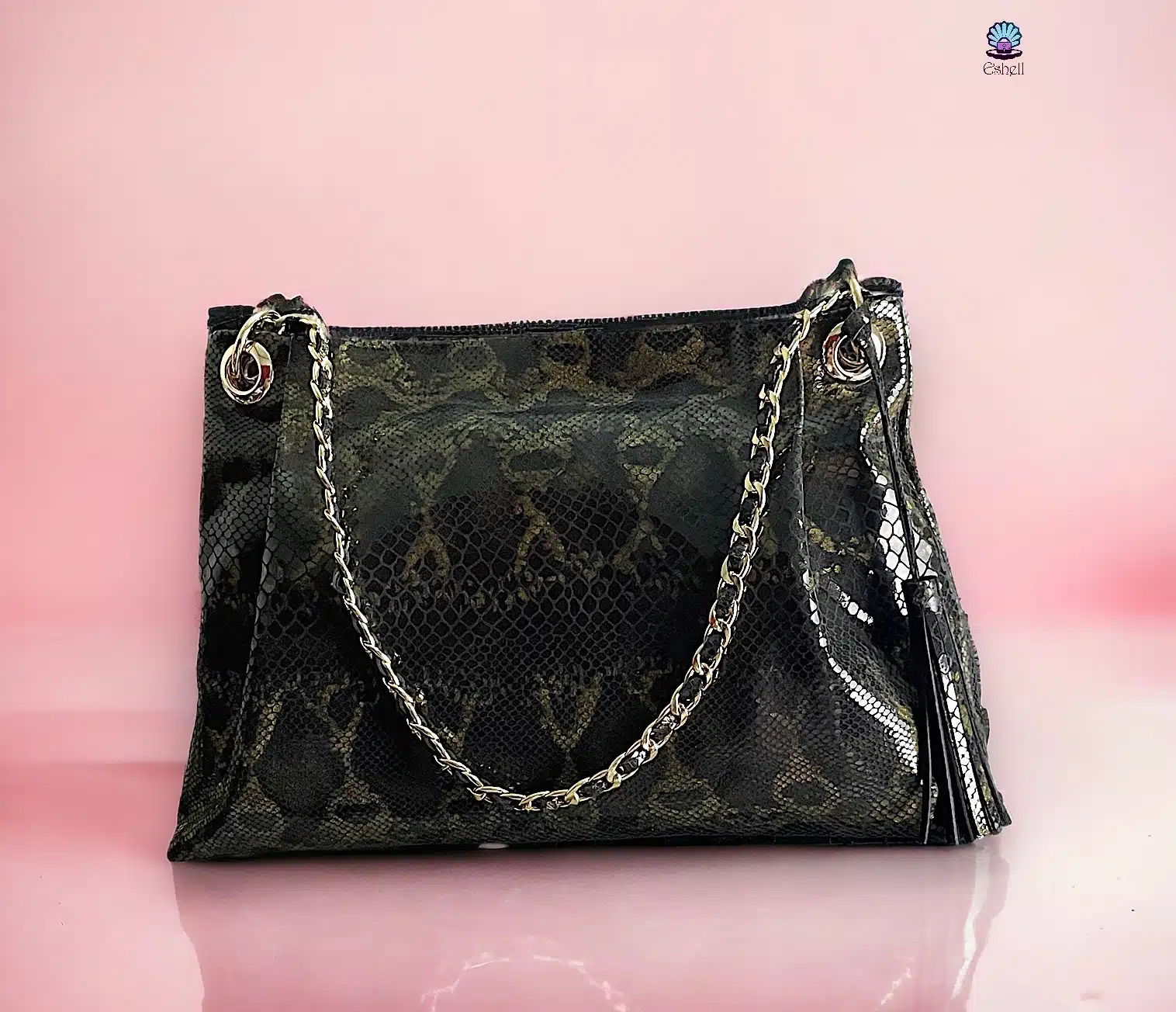 Crafted from high quality lazar genuine leather. Equipped with a chain with leather strap, this accessory can be worn as a shoulder bag
