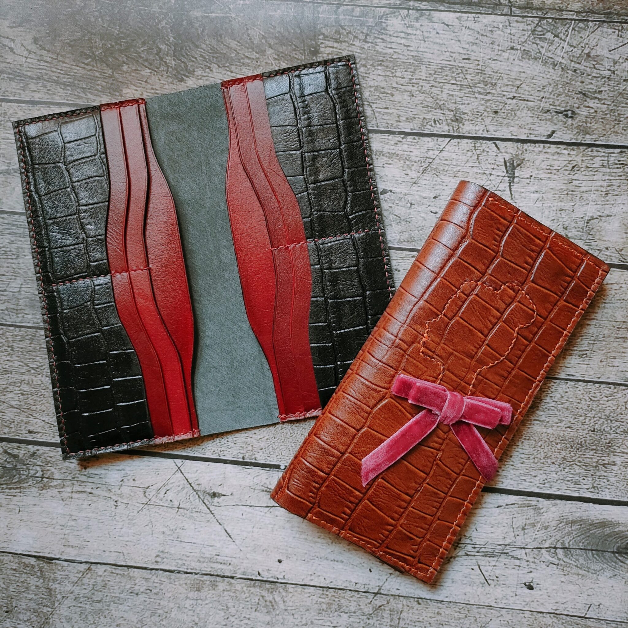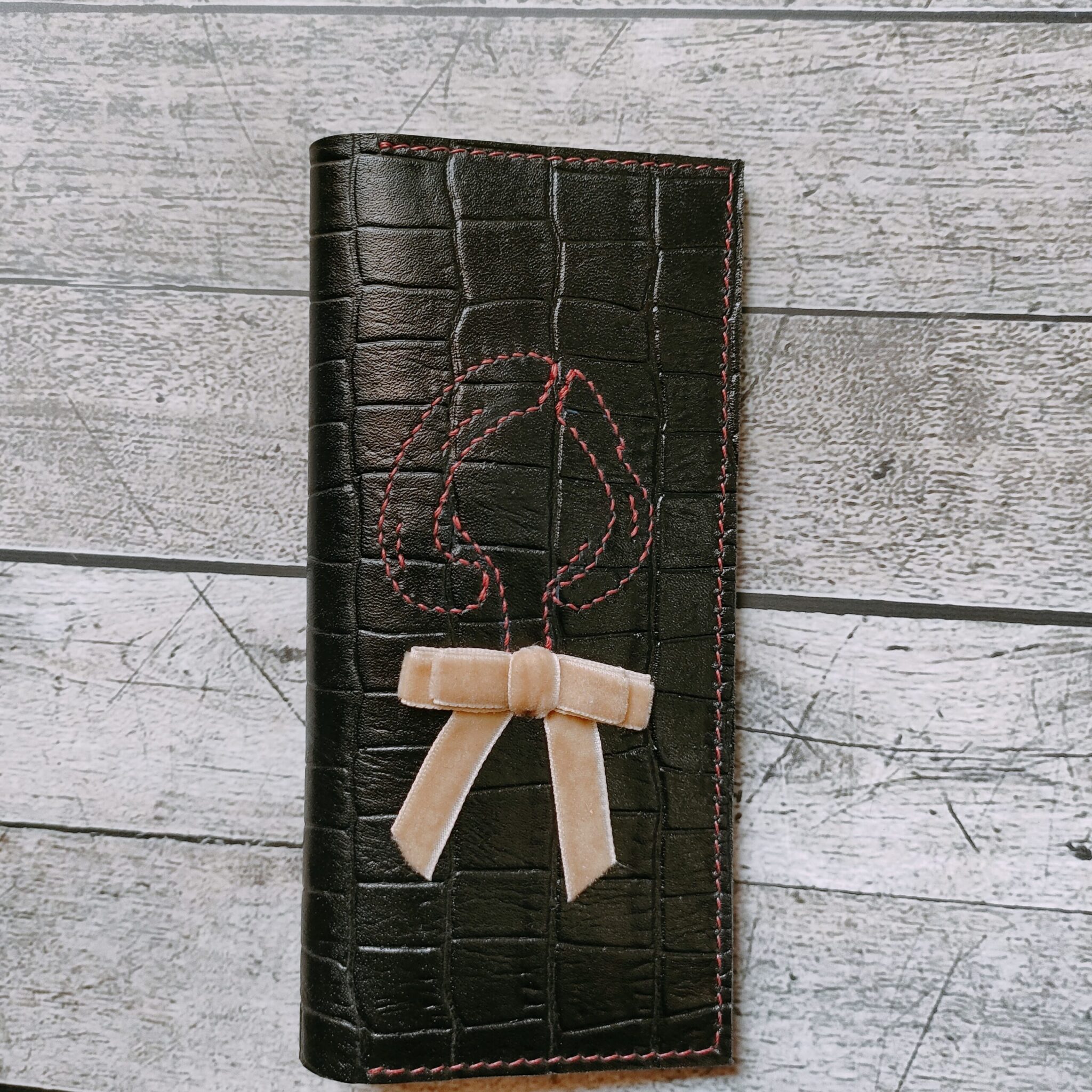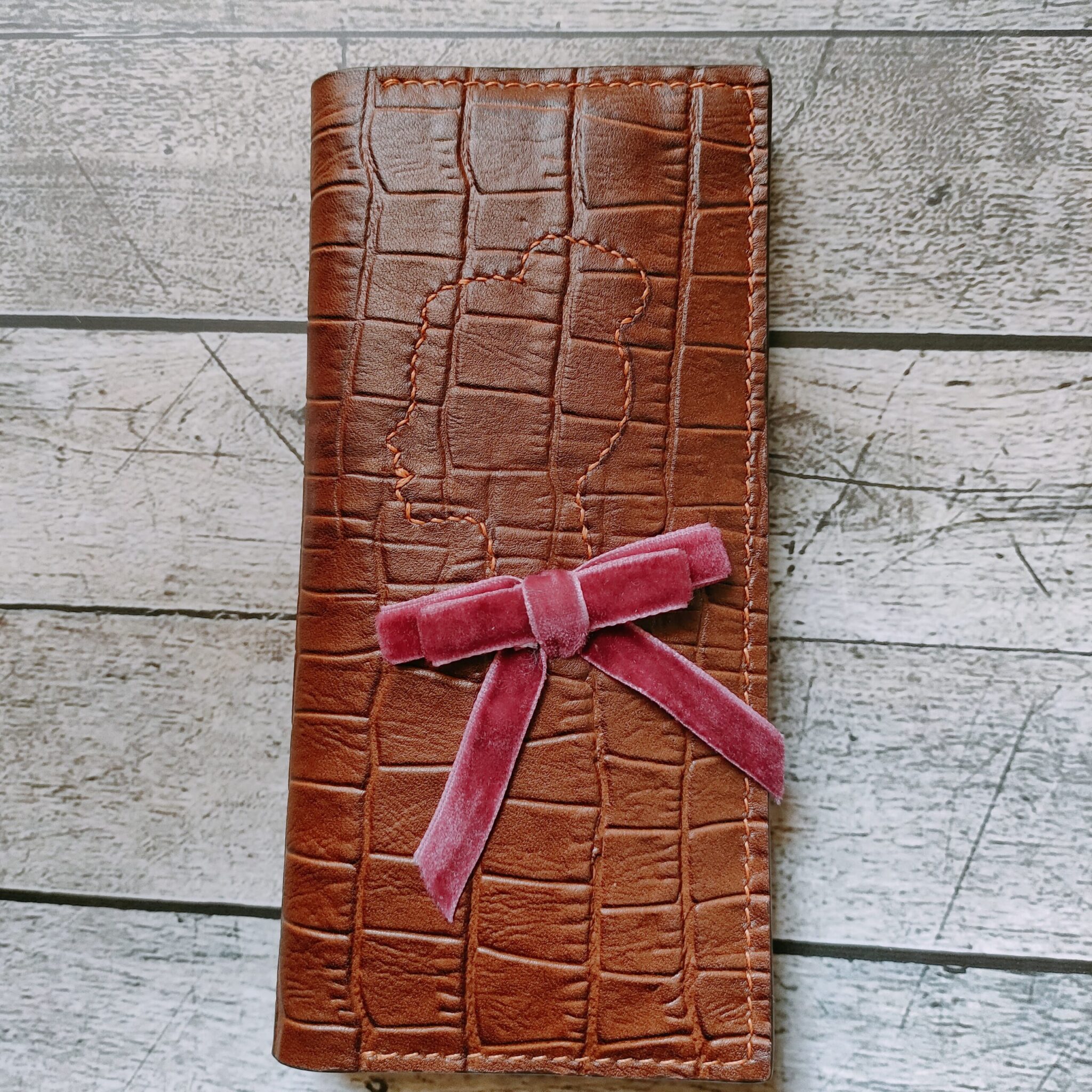 Handmade Genuine Leather Long Wallet with Velvet Bow.