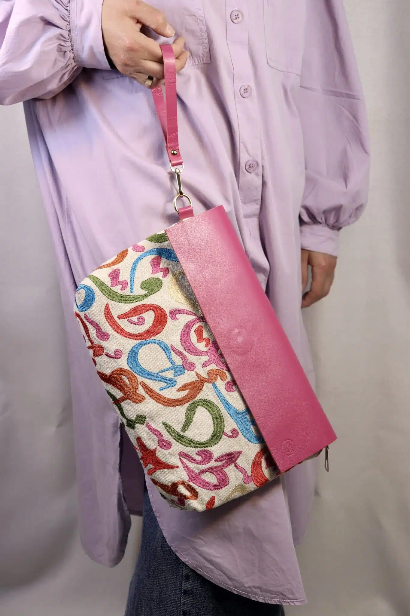 Genuine Leather x embroidered fabric clutch.The genuine leather flap makes it rich and elegant,the Embroidered Arabic letters make it perfect for Ramadan nights and also other special nights out.