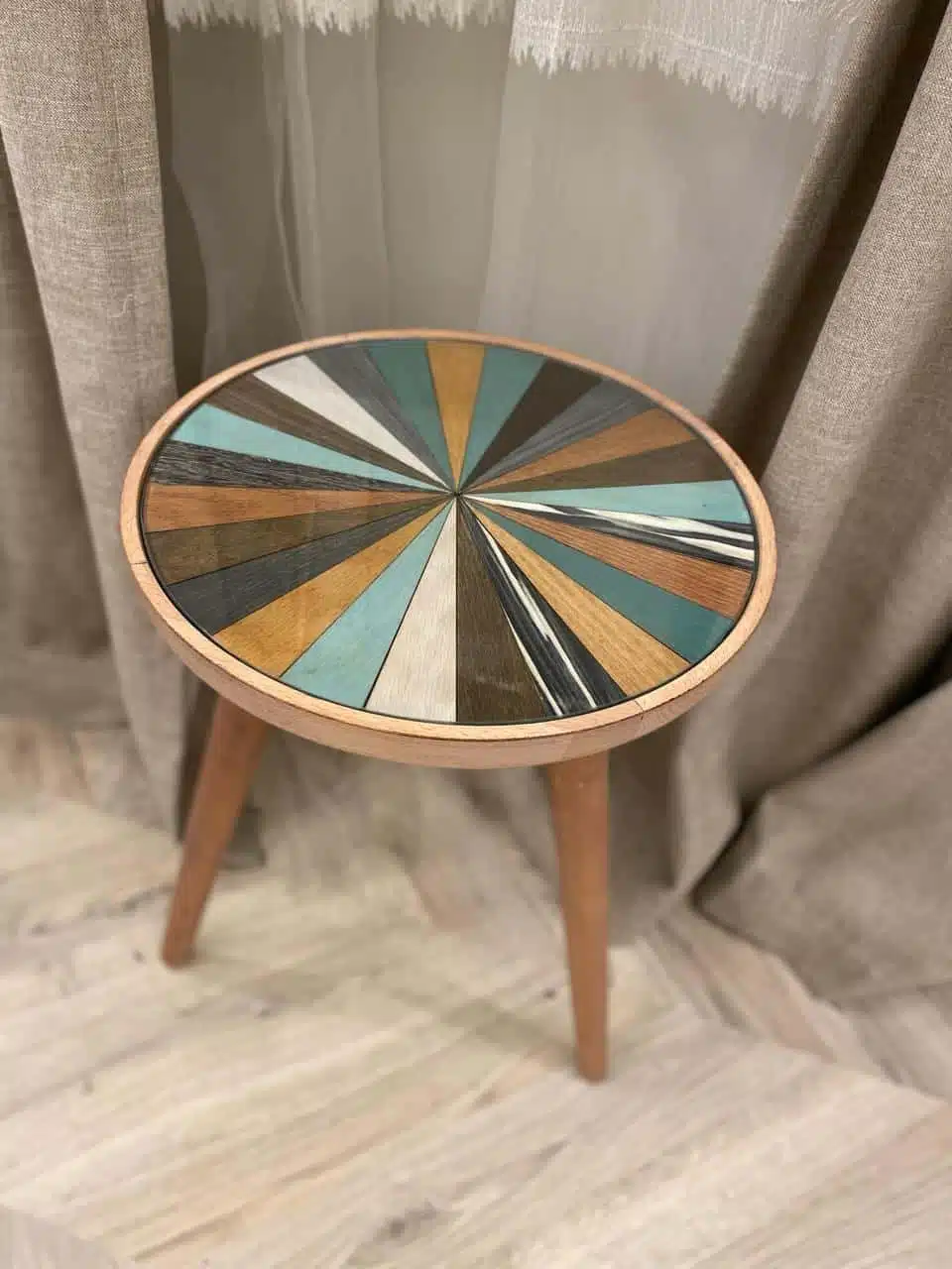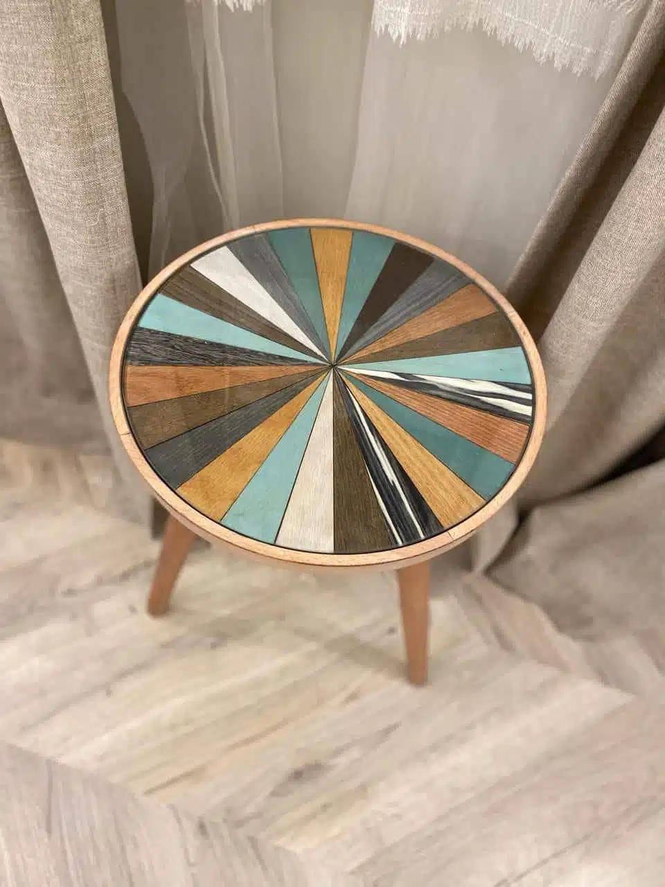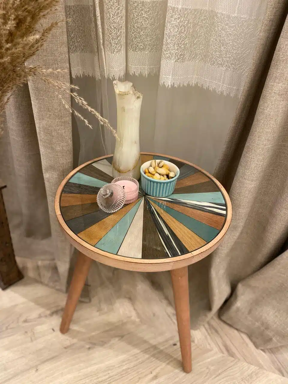 - Rounded wooden side table with a wood veneer surface covered with a glass panel
