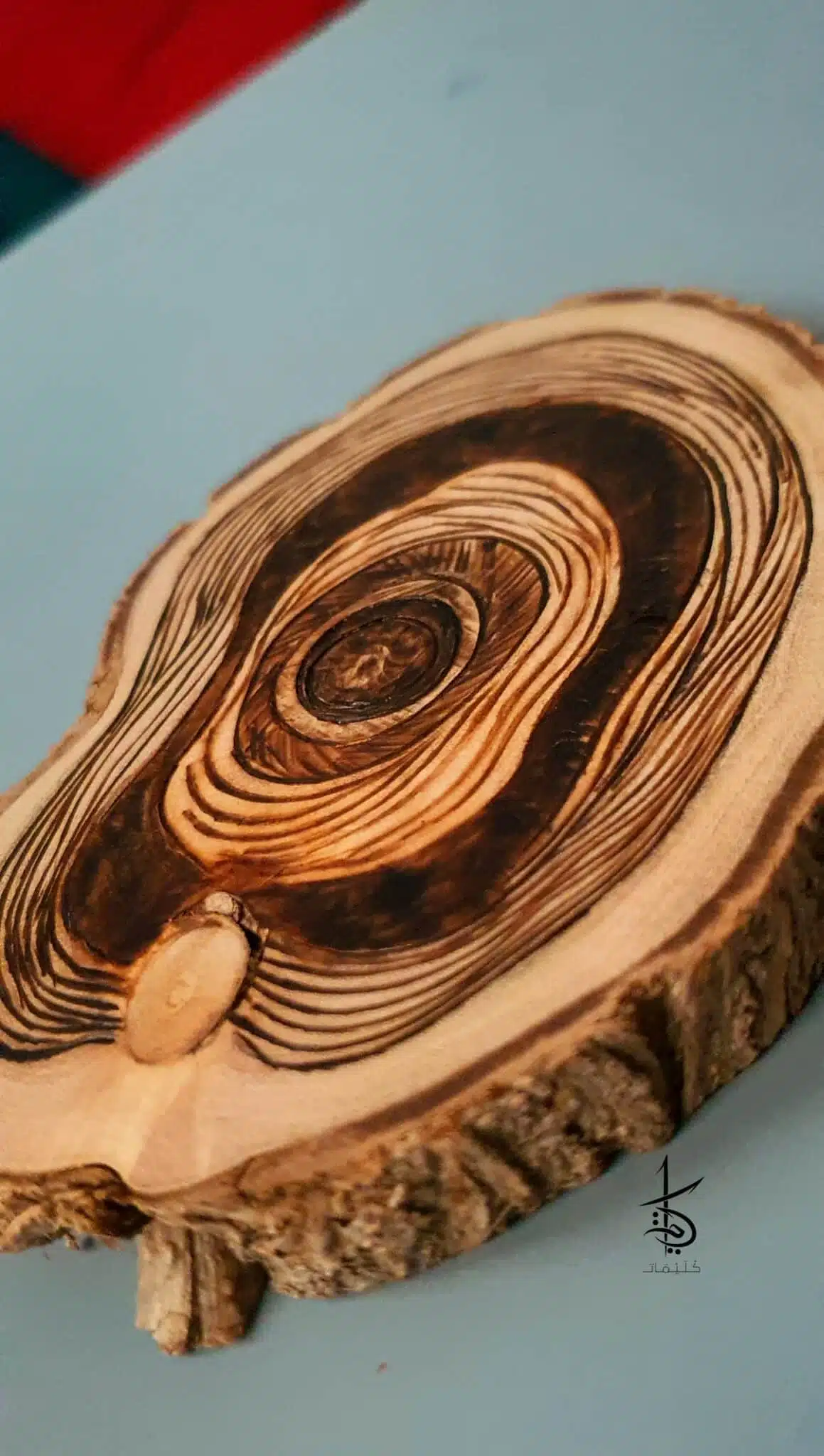 An exquisite one-of-a-kind tree slice with a hand-burned free-hand design.