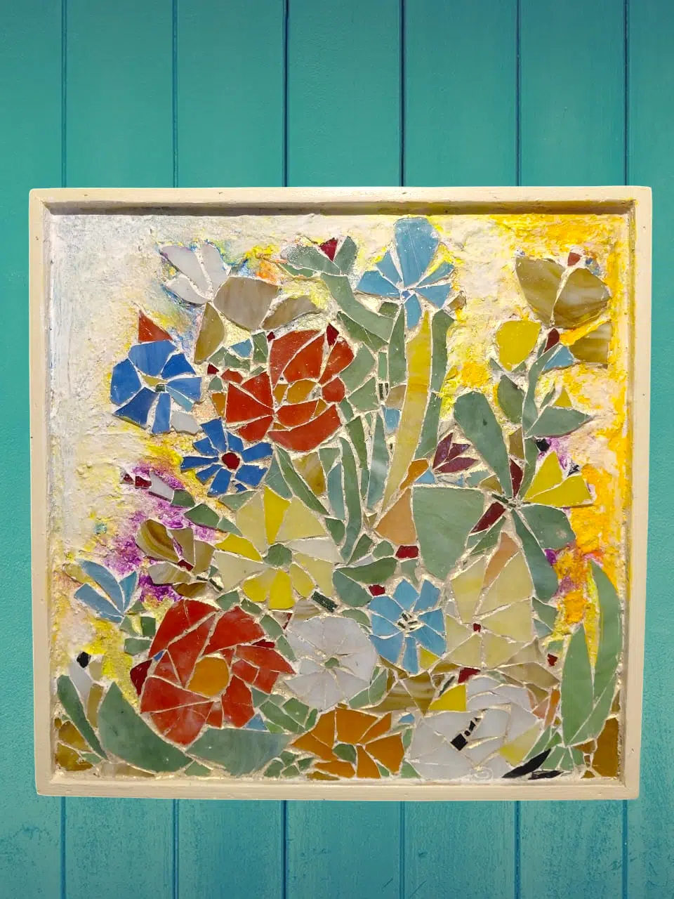 Colourful glass mosaic collected on wood , 45 x 45 cm .