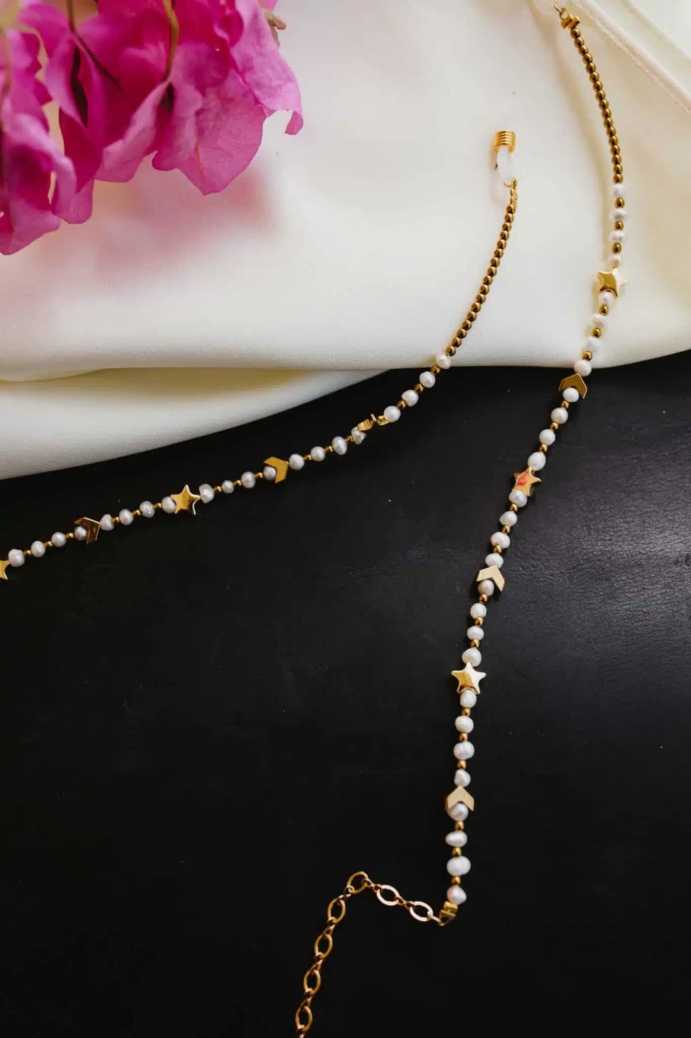 This glasses cord is made of Stainless steel Hematite Cultured pearls