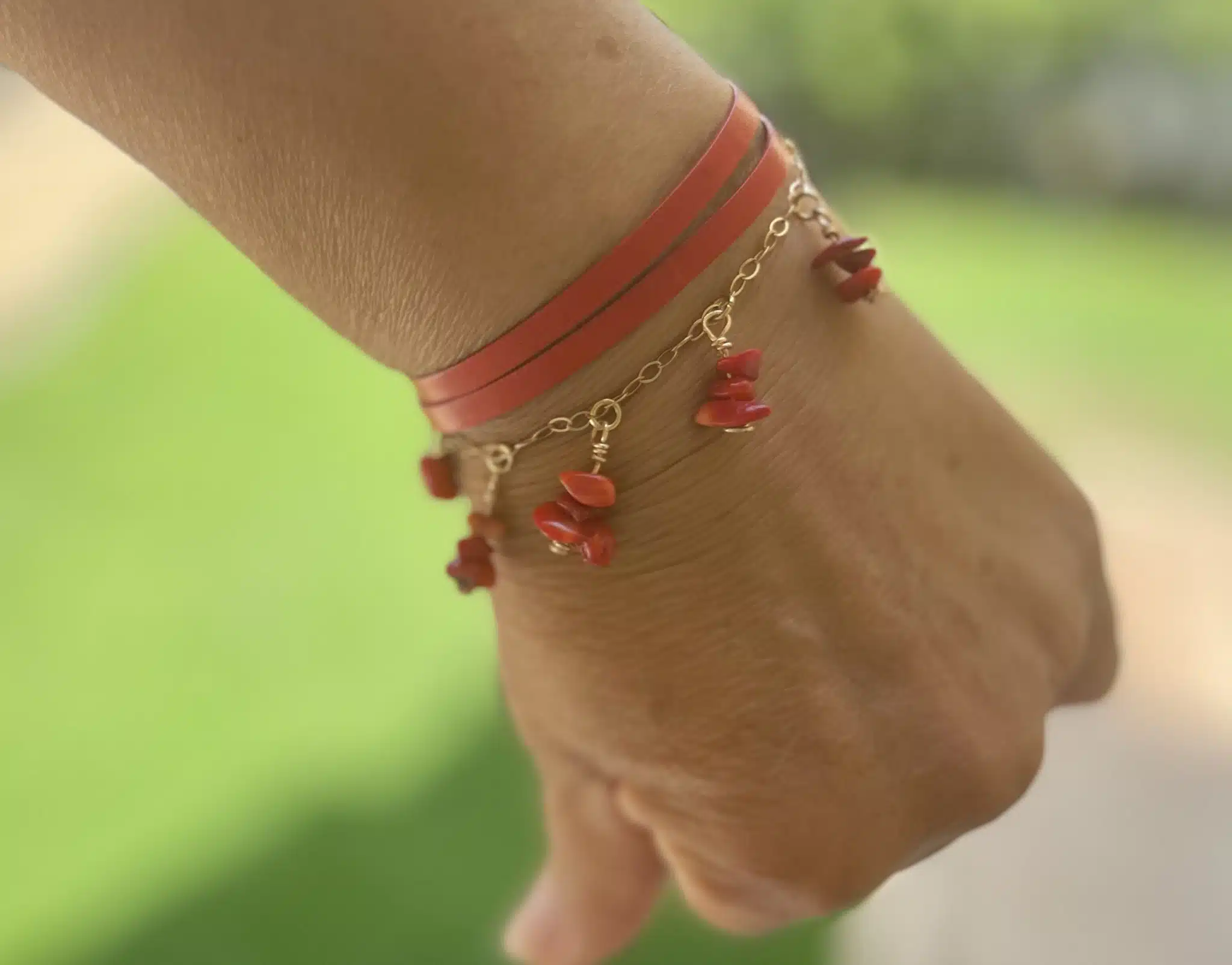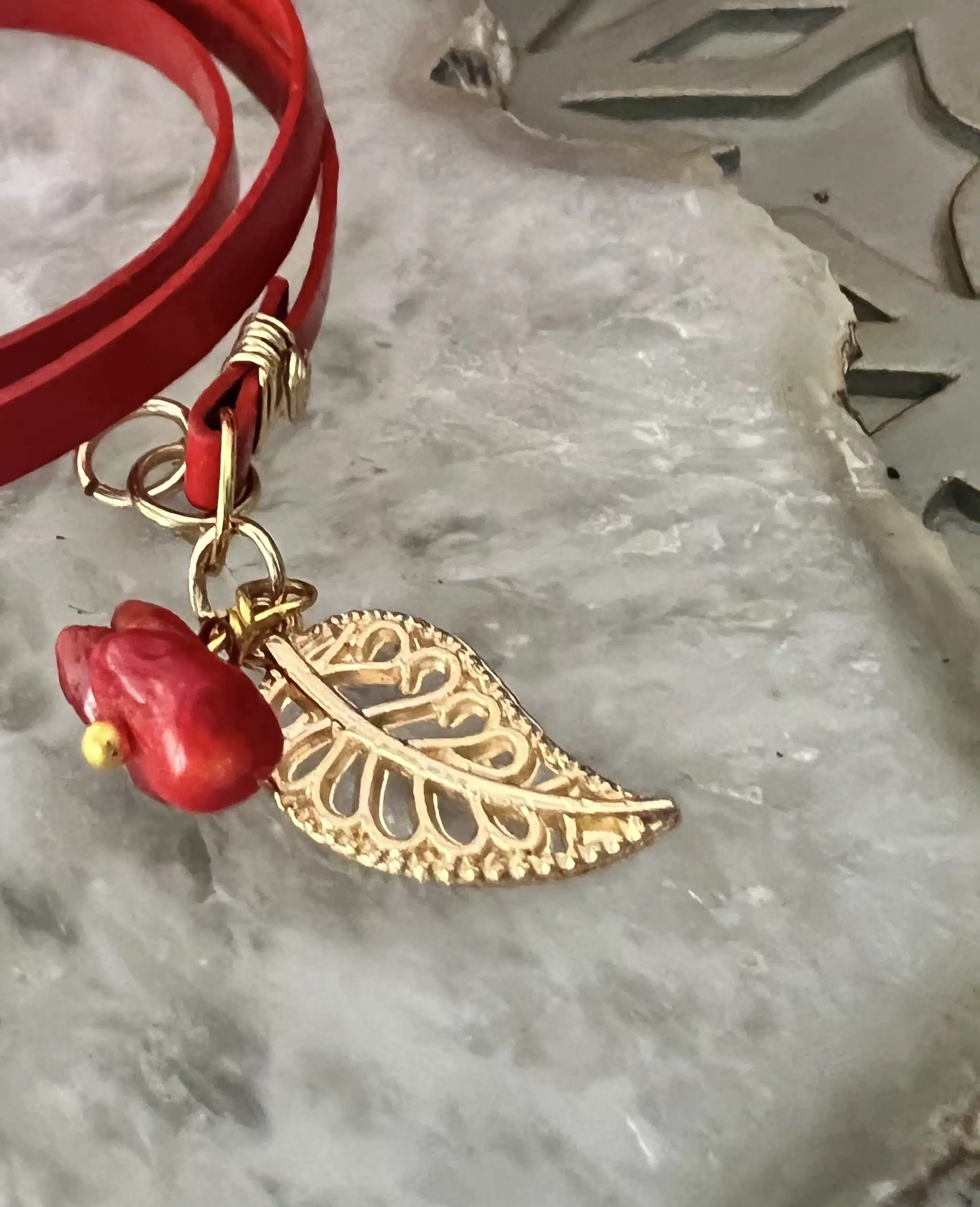 Handmade bracelet made of two row red leather cord, with coral beads, gold filled clasp & wire, gold plated tree leaf charm, great as gift for you friend & family, or for yourself.