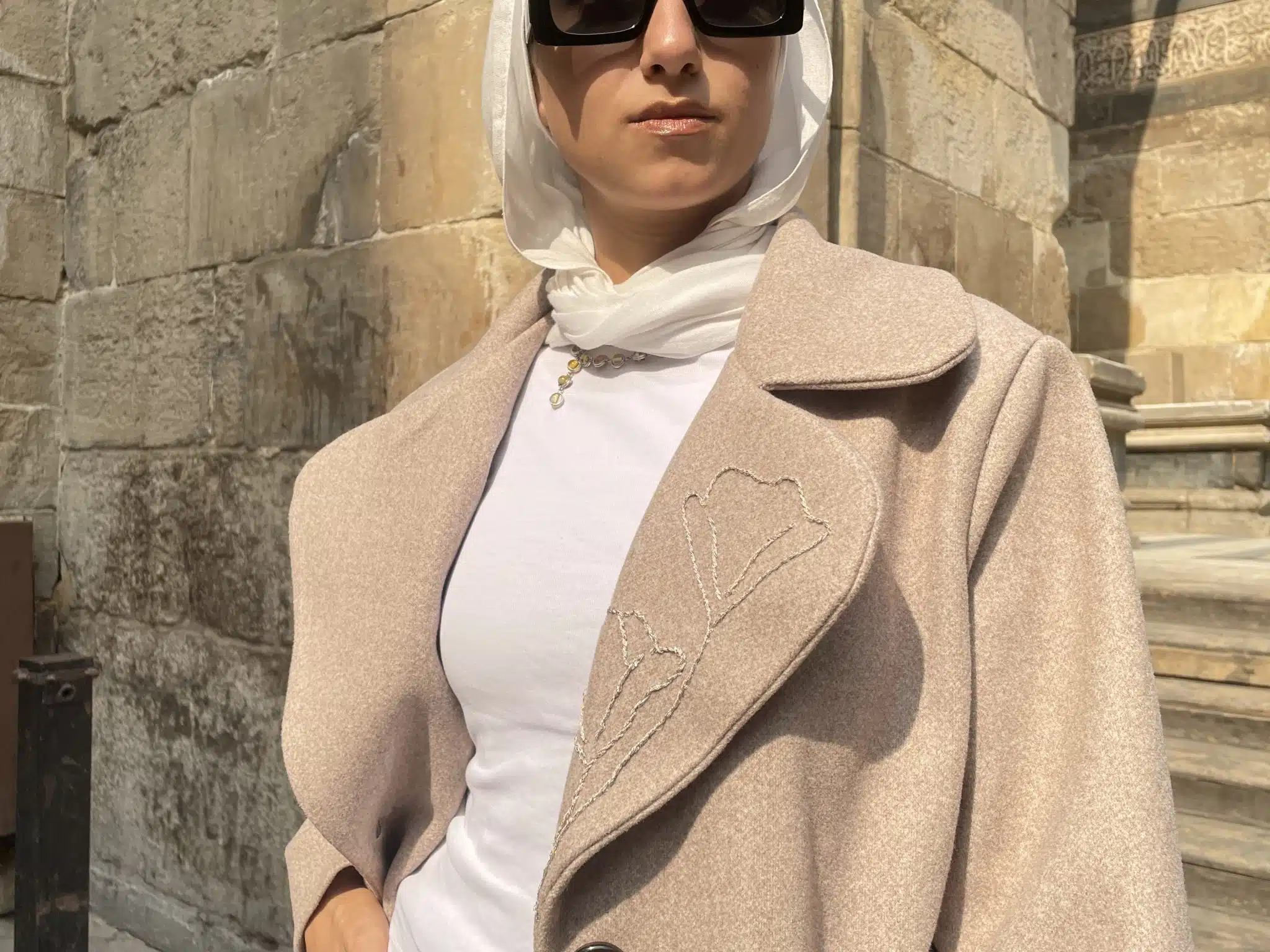 The subtle embroidery adds a chic, unique touch, making the coat stand out.