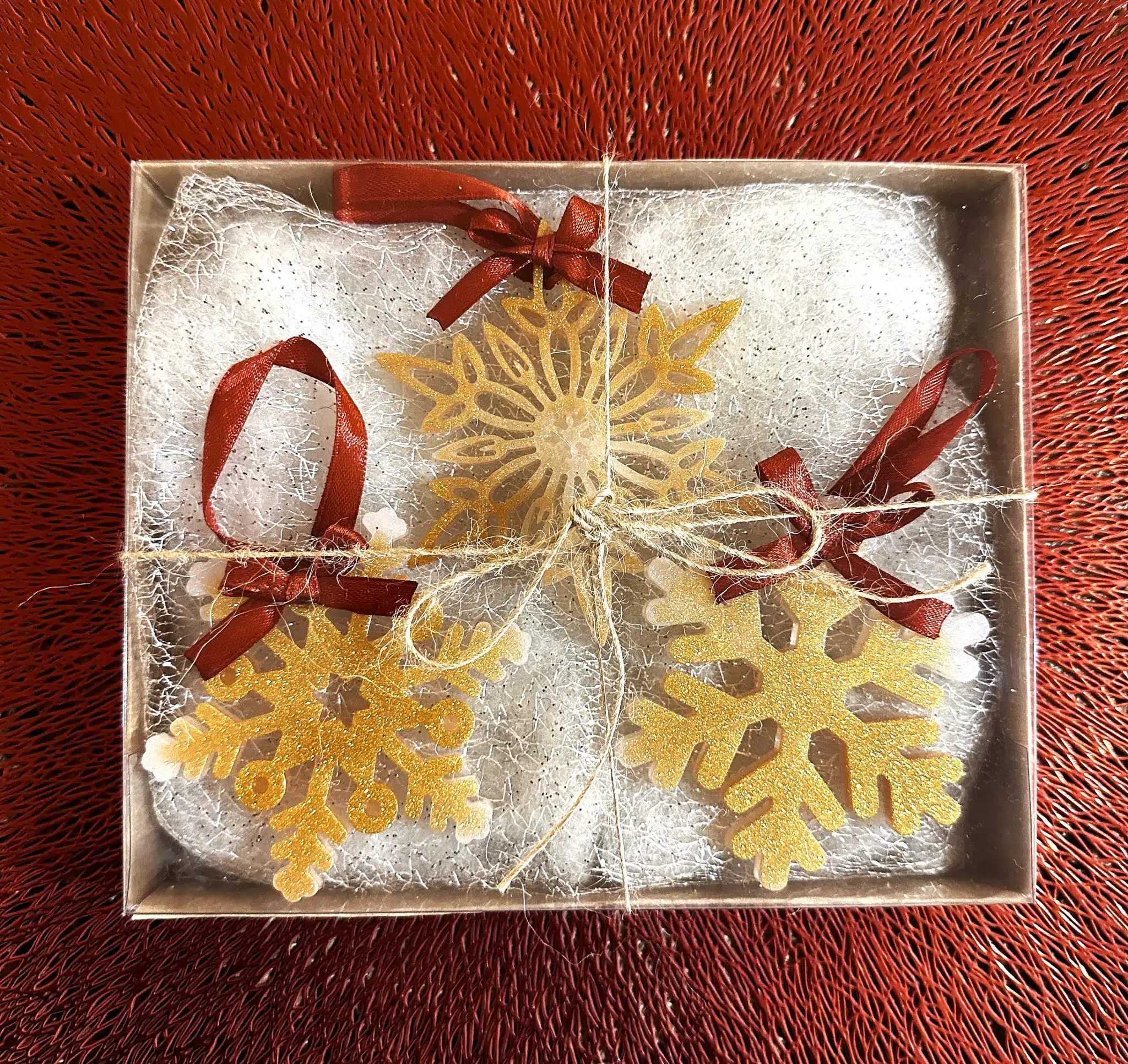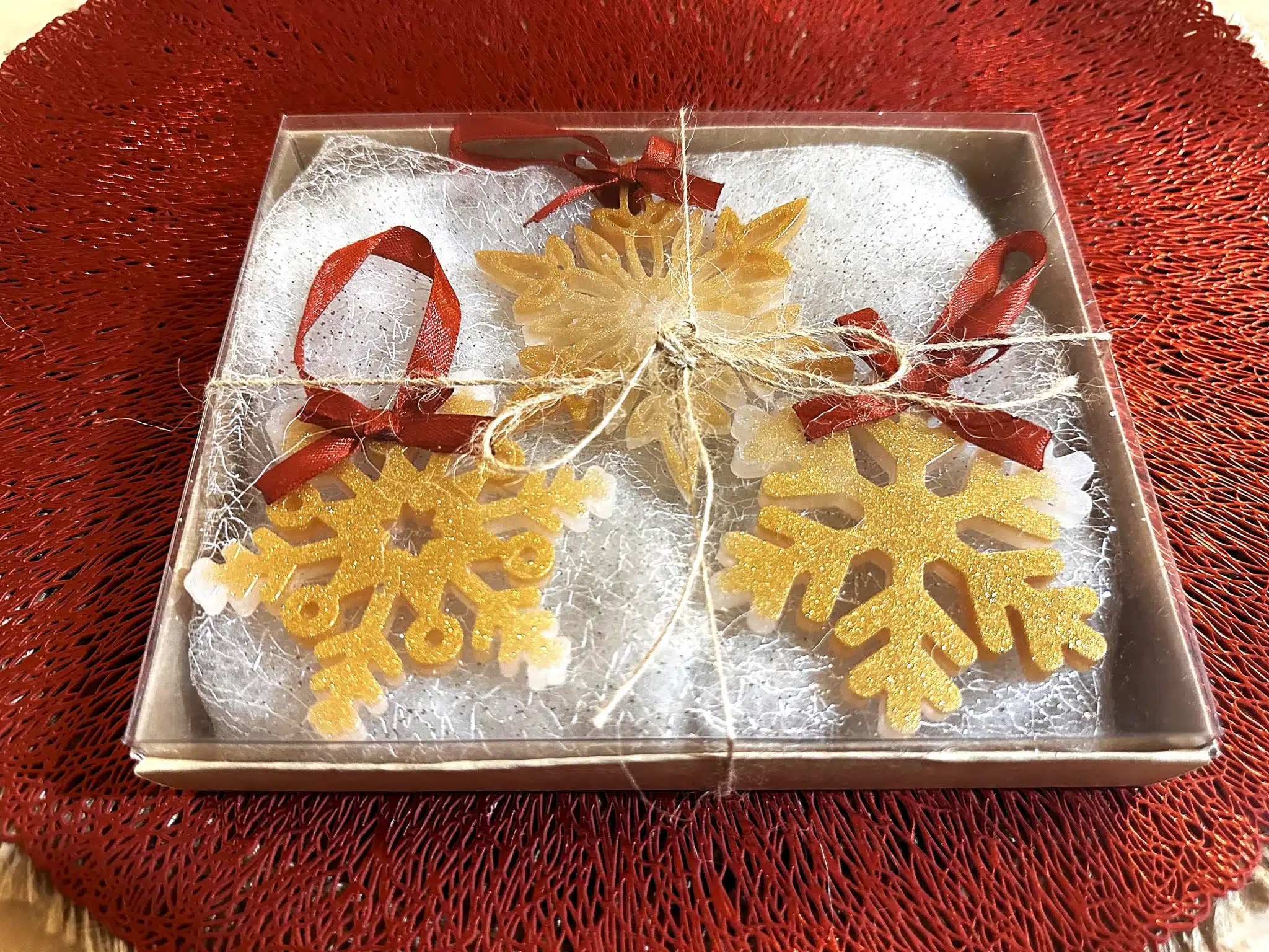 This is a set of 3 different star shaped Christmas tree ornaments. Their color is a mixture of gold and white with red ribbons.