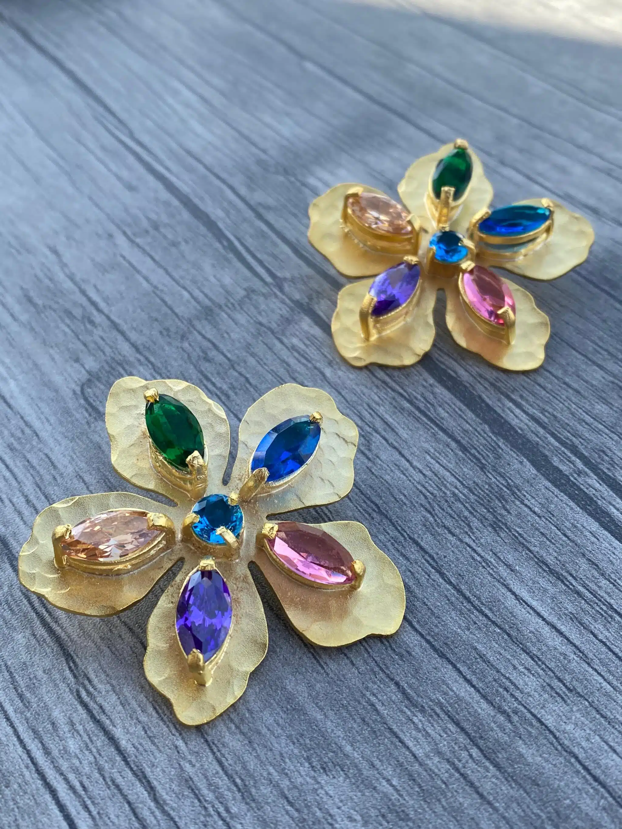 These Gold platted earrings showcase timeless elegance. With their radiant and refined handmade design embraced with colored crystals.