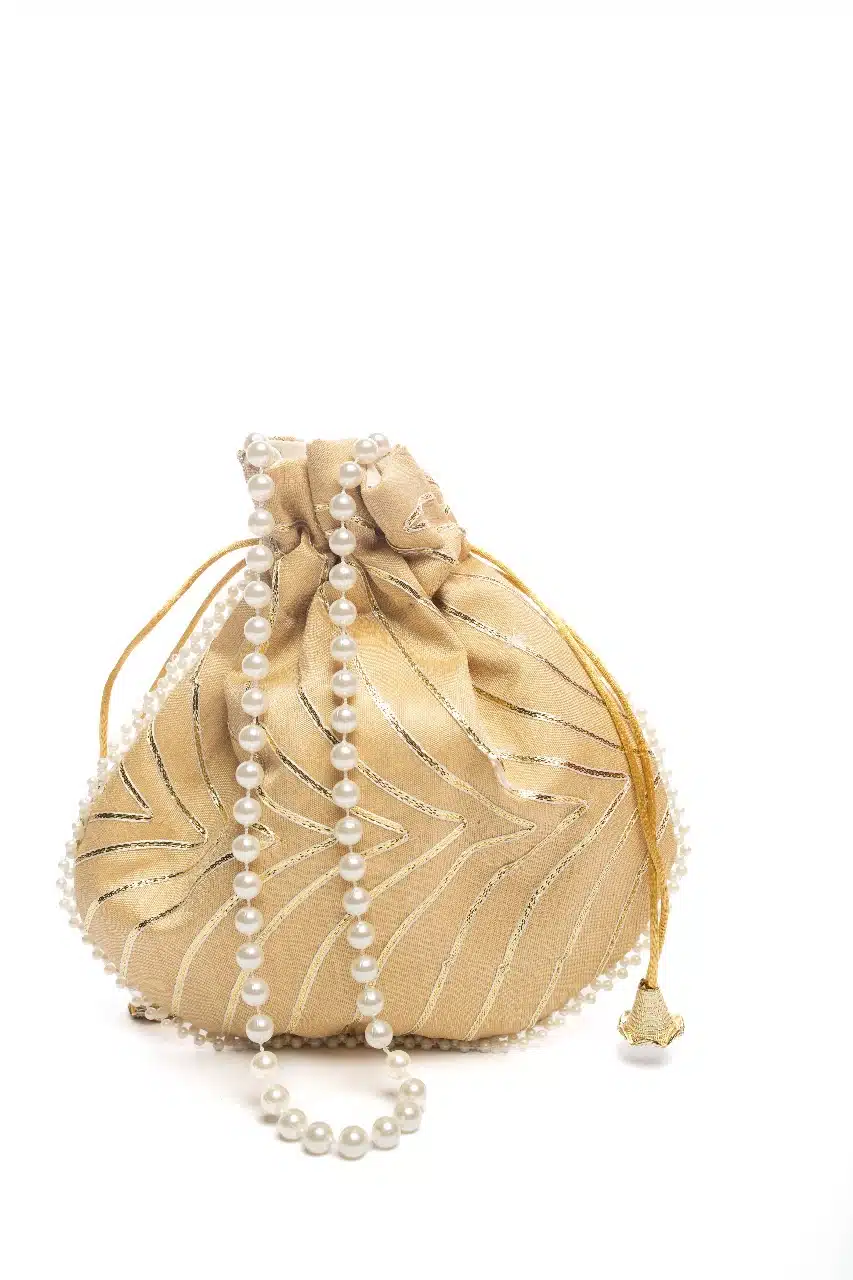 Golden pouch with beading detail and pearl string handle