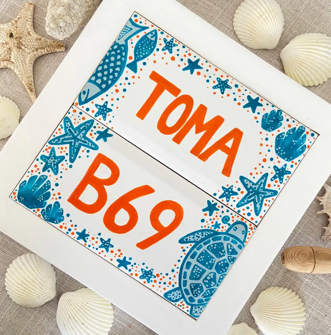 two handpainted tiles, customized, total size of the frame 25×25 cm