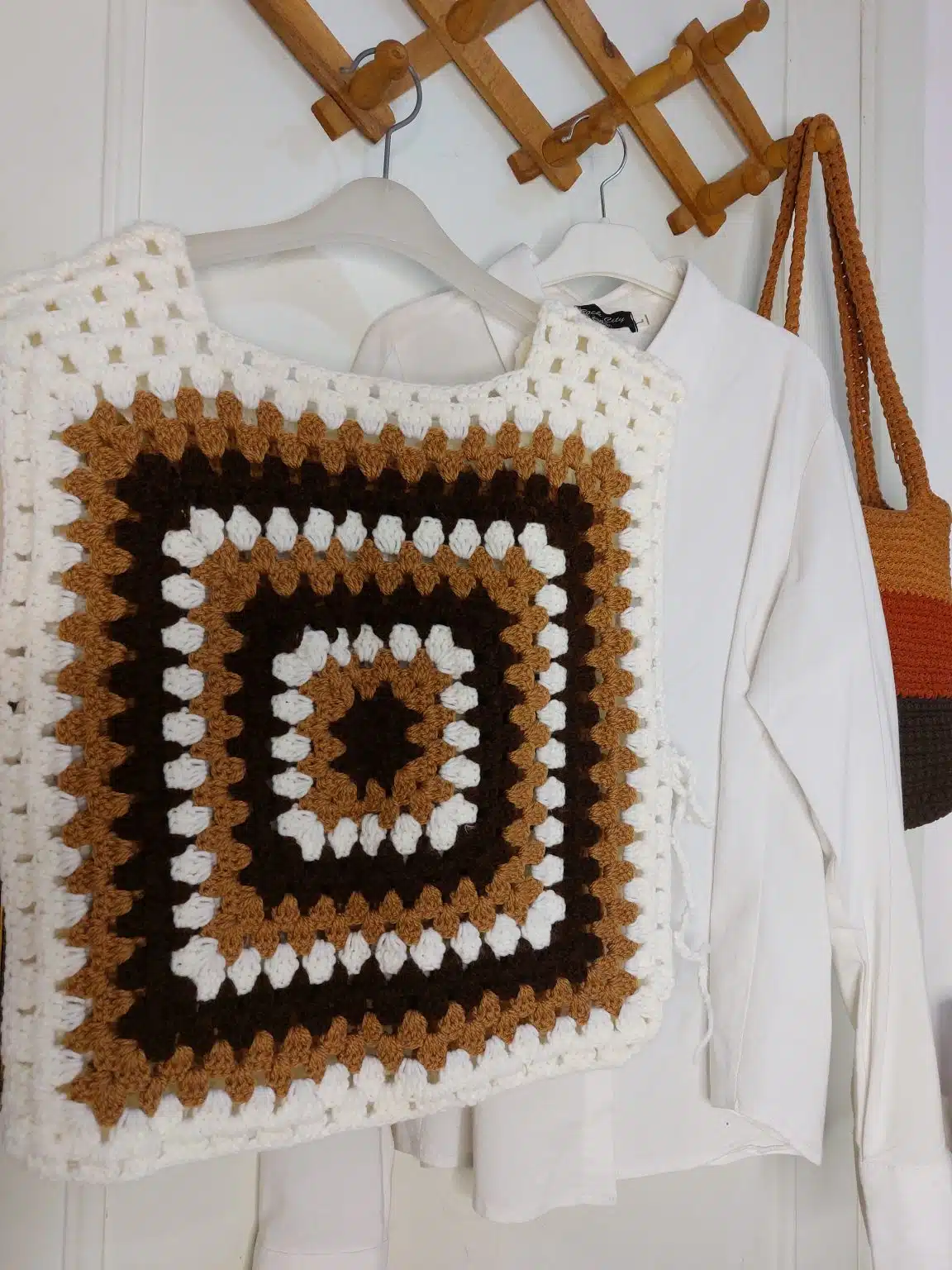 Inspired by the classic granny square, this handmade crochet top is a modern take on a timeless design, with a vibrant granny square pattern in warm brown and white tones.
