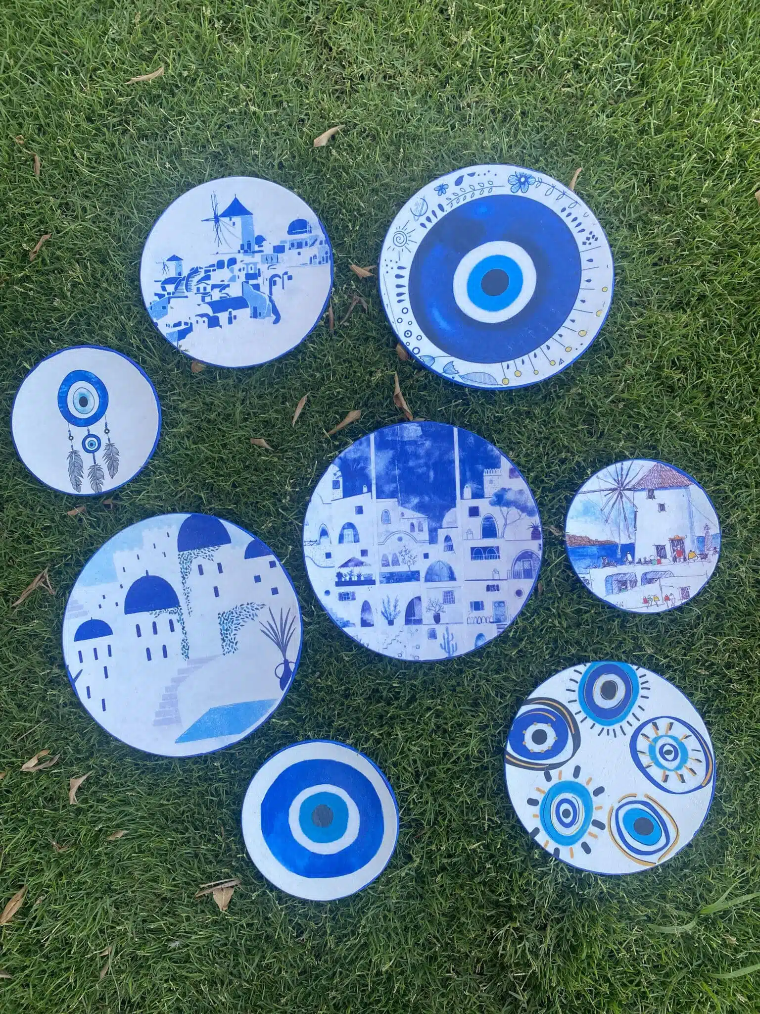 Set of porcelaine plates mix of greek eye and Mykonos theme