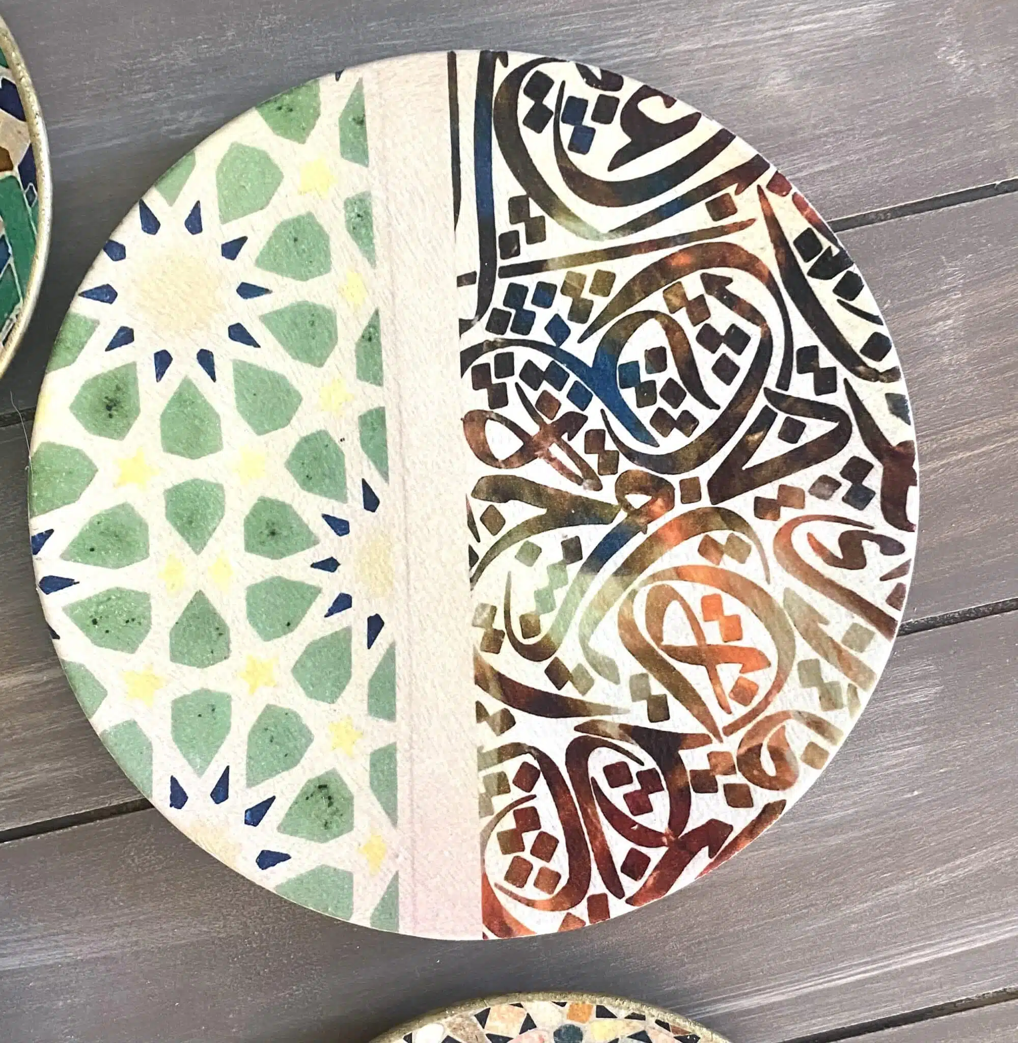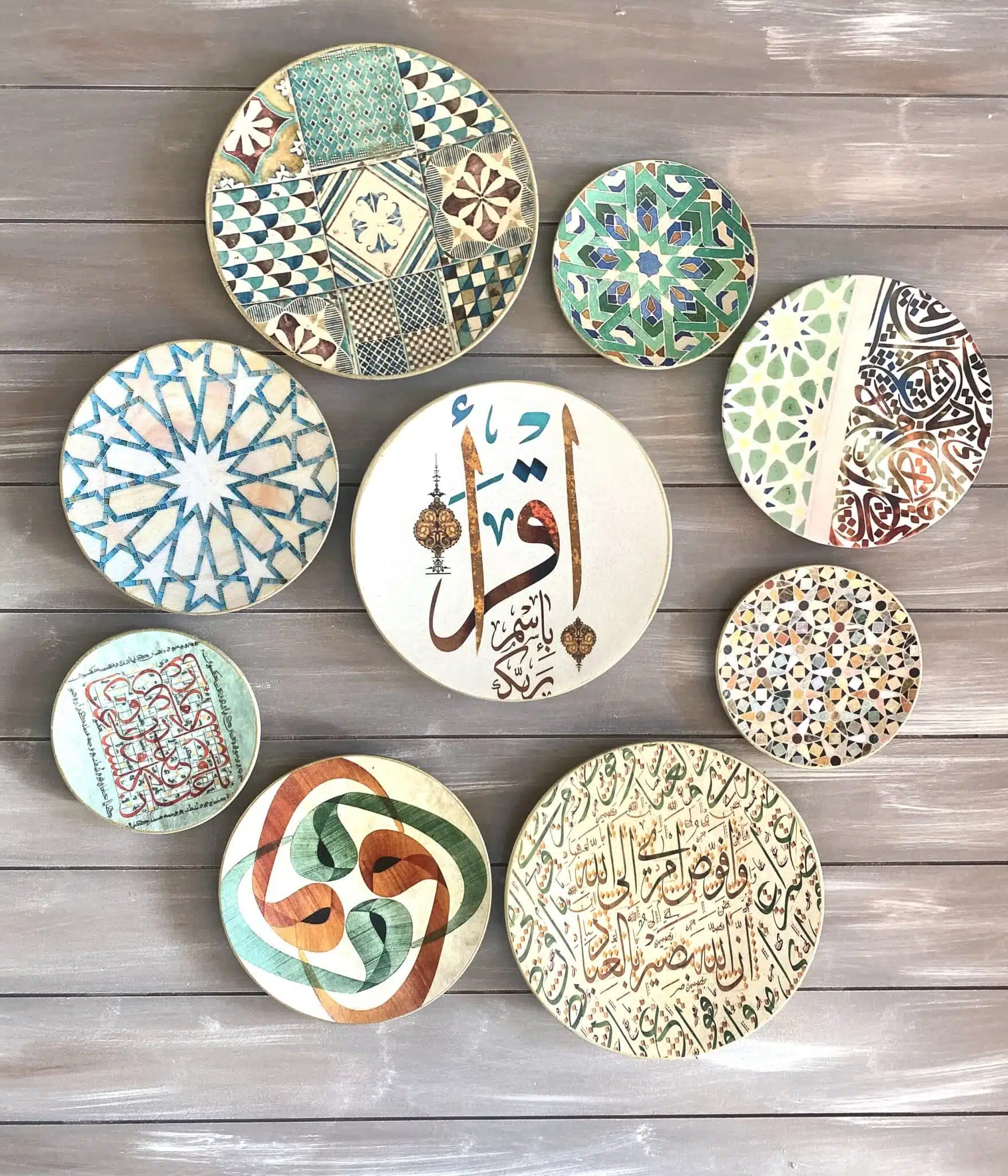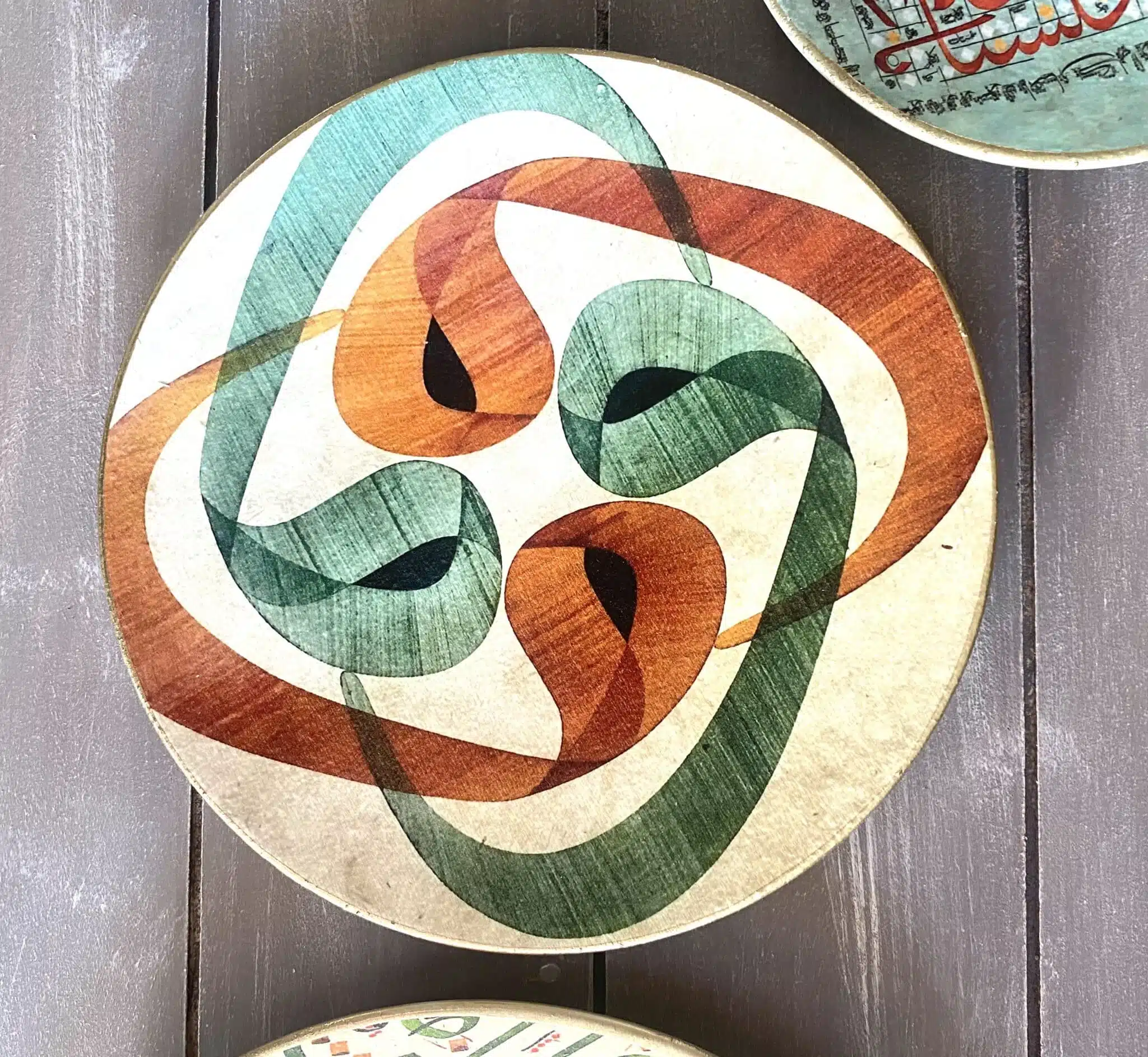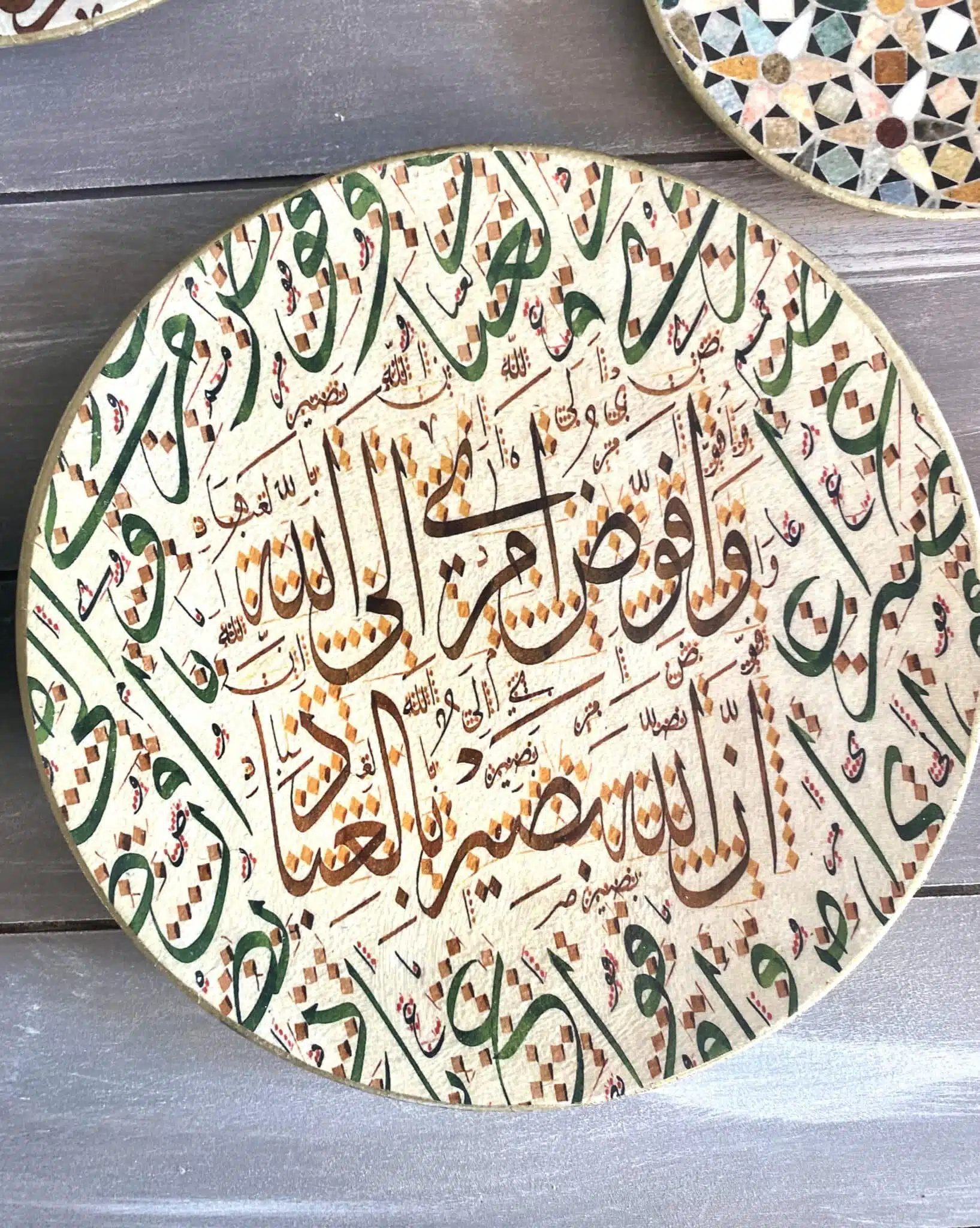 Decoupaged wall plates in green calligraphy design