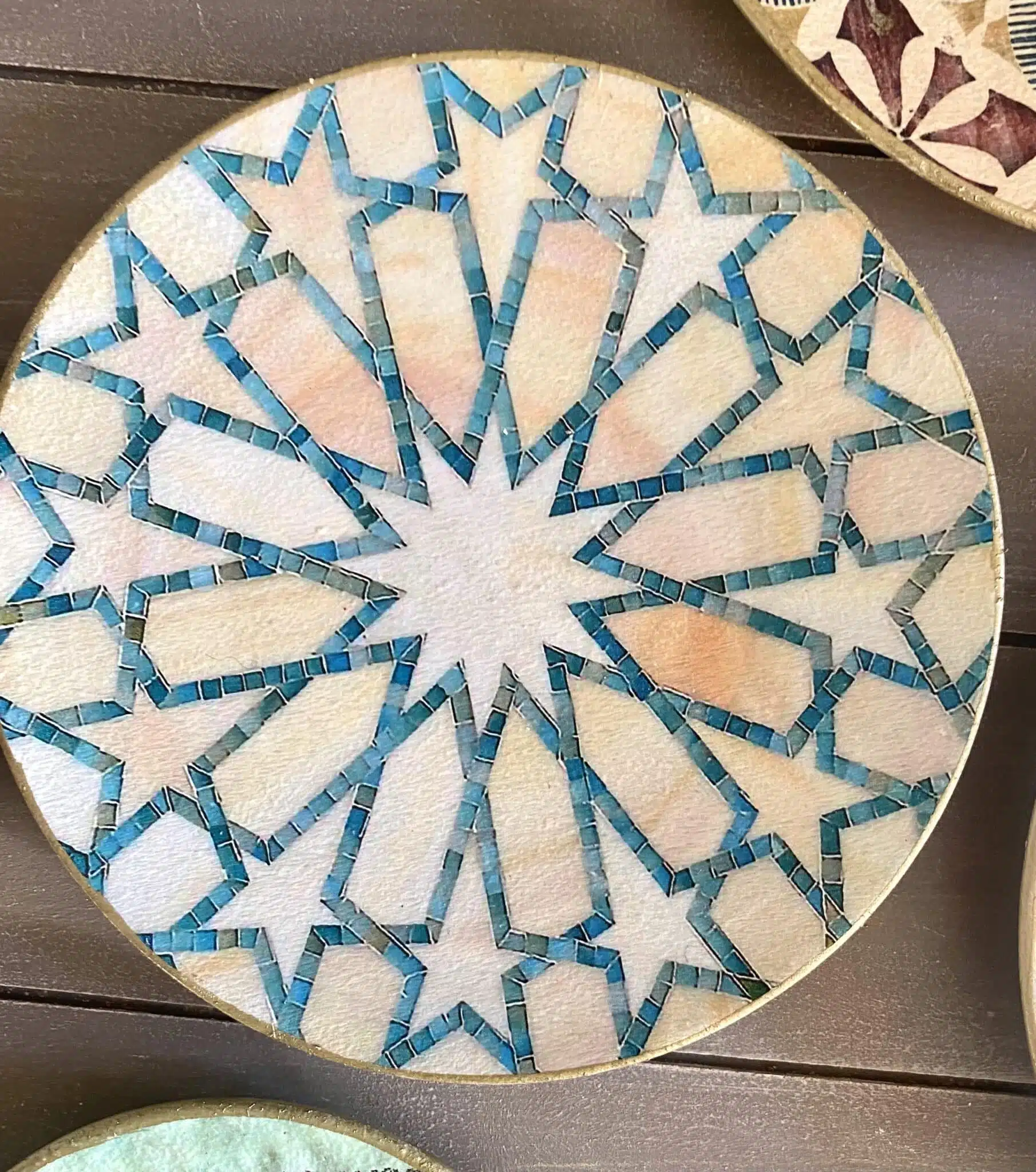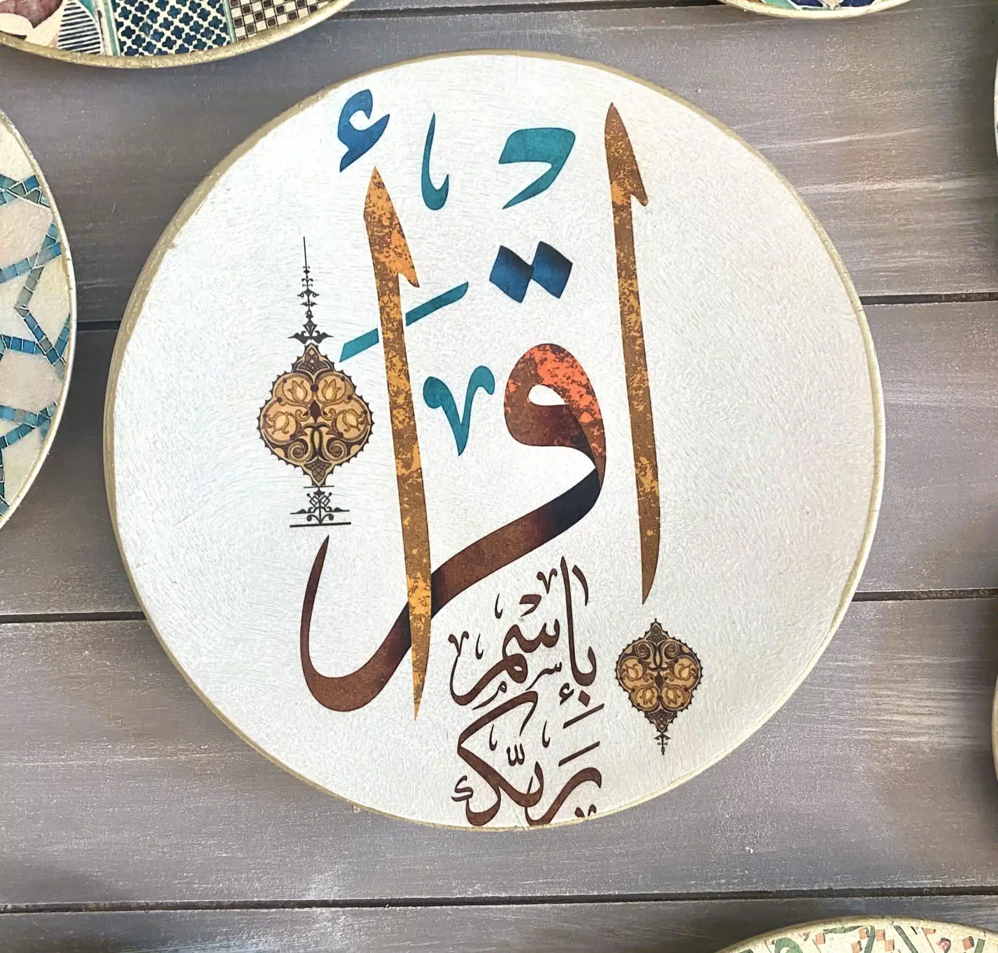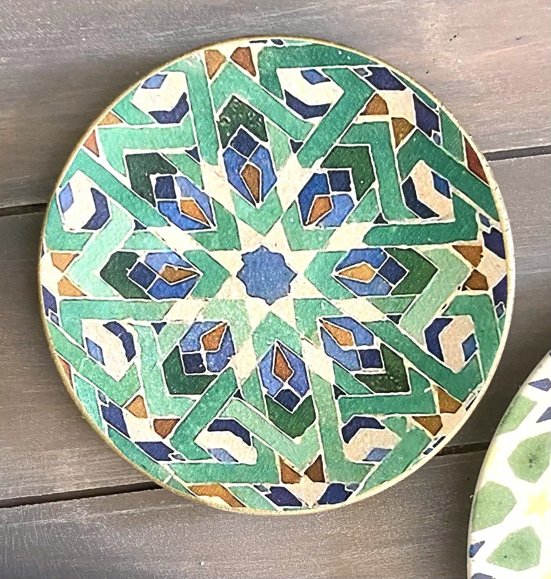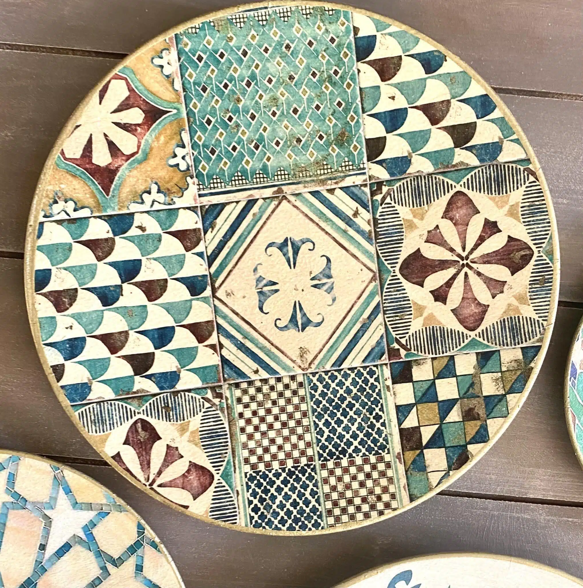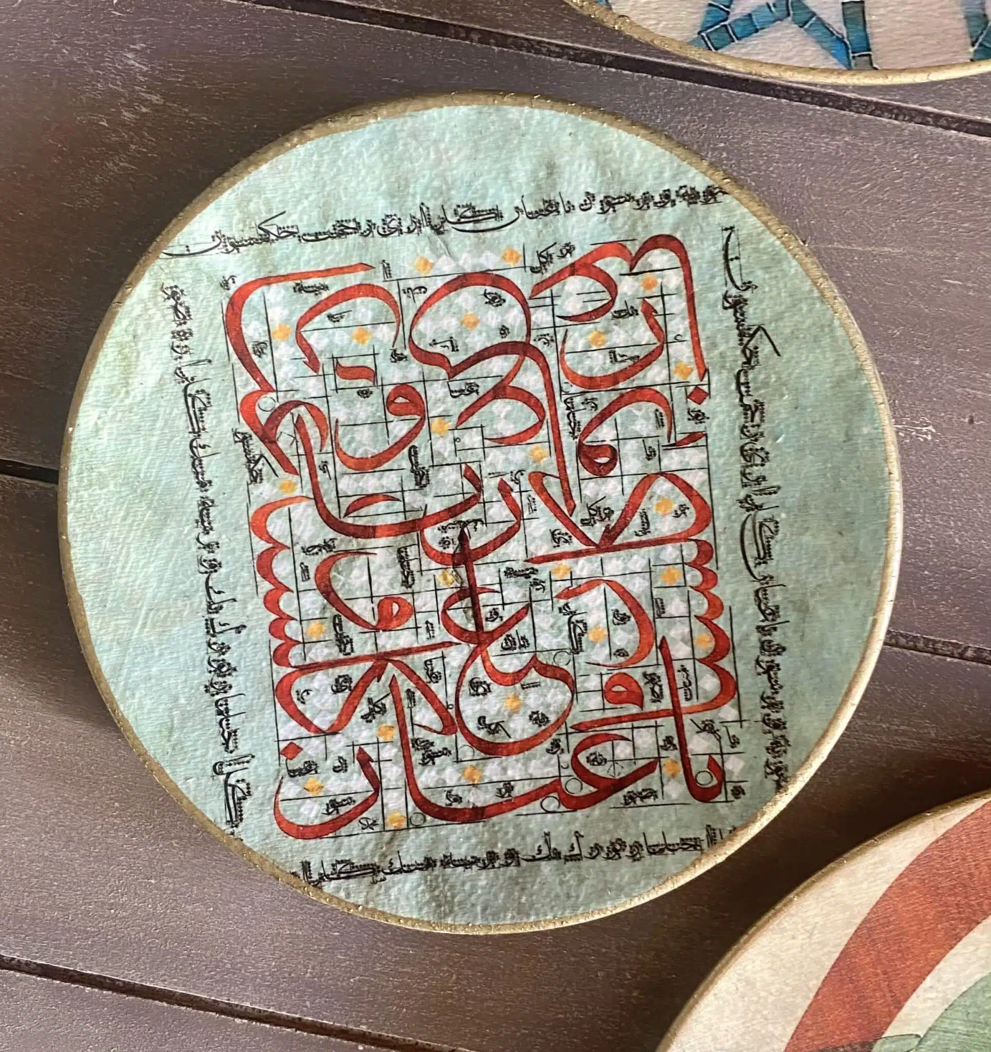 Decoupaged wall plates in green calligraphy design