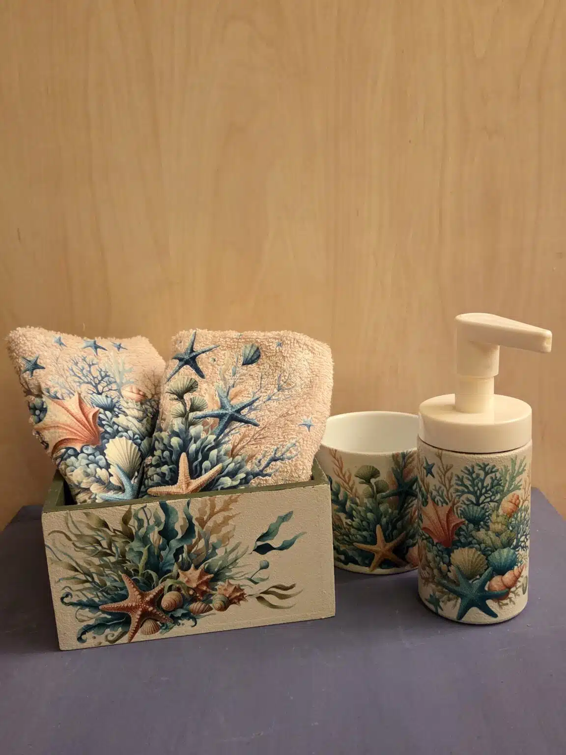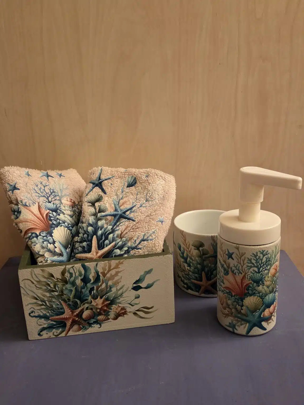 • Bathroom summer house set with green corals  pattern consists of a wooden box 15*15 cm , dispenser , cup and 2guest towels 30*30 cm , don’t wash or scrub with harsh chemicals just wipe with a damp cloth