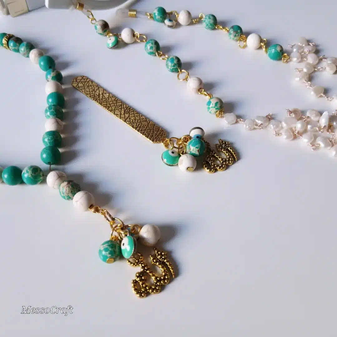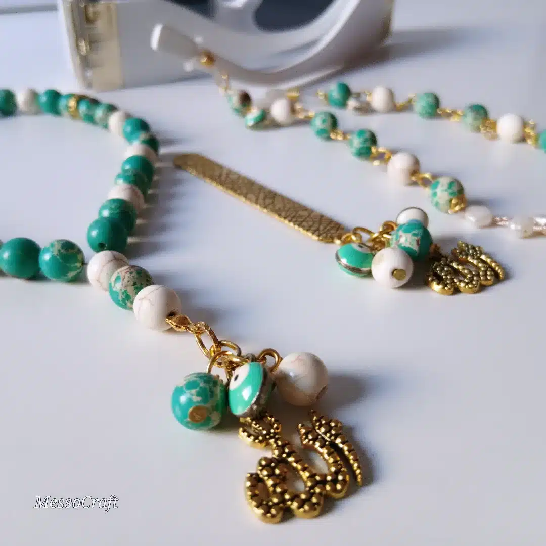A set consists of 33 beads rosary (seb7ah), bookmark, and glasses chain made of green Jasper beeds and off-white turquoise (fayroz) stones and Pearl chain